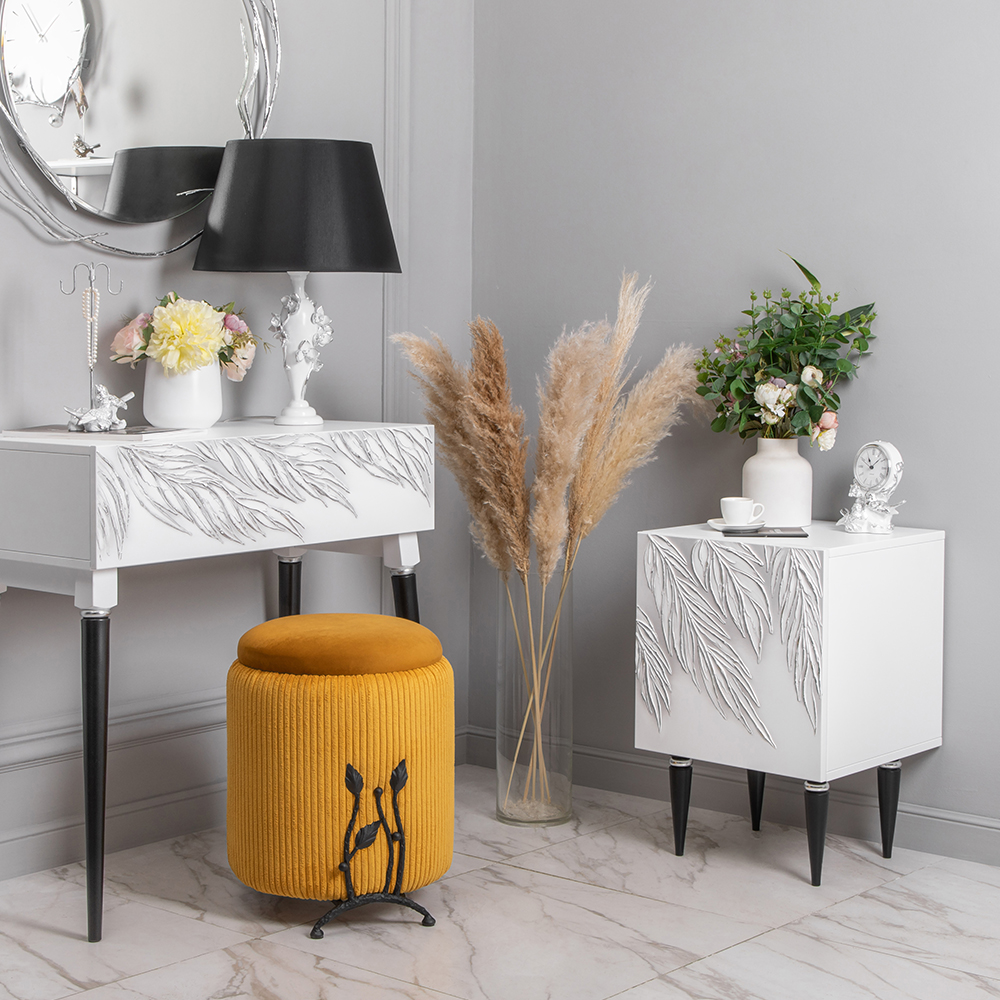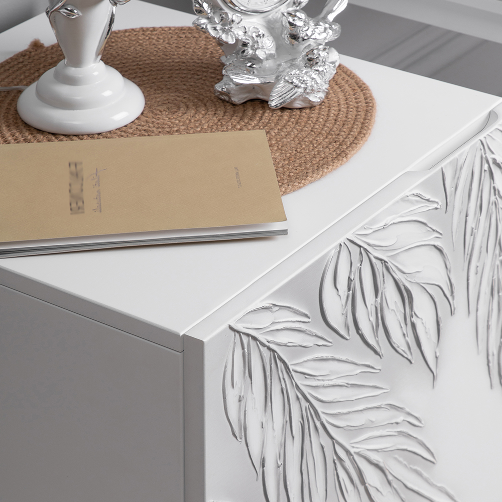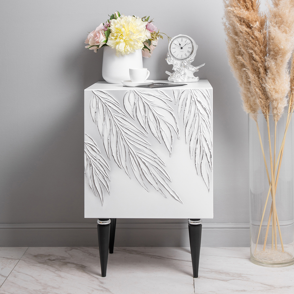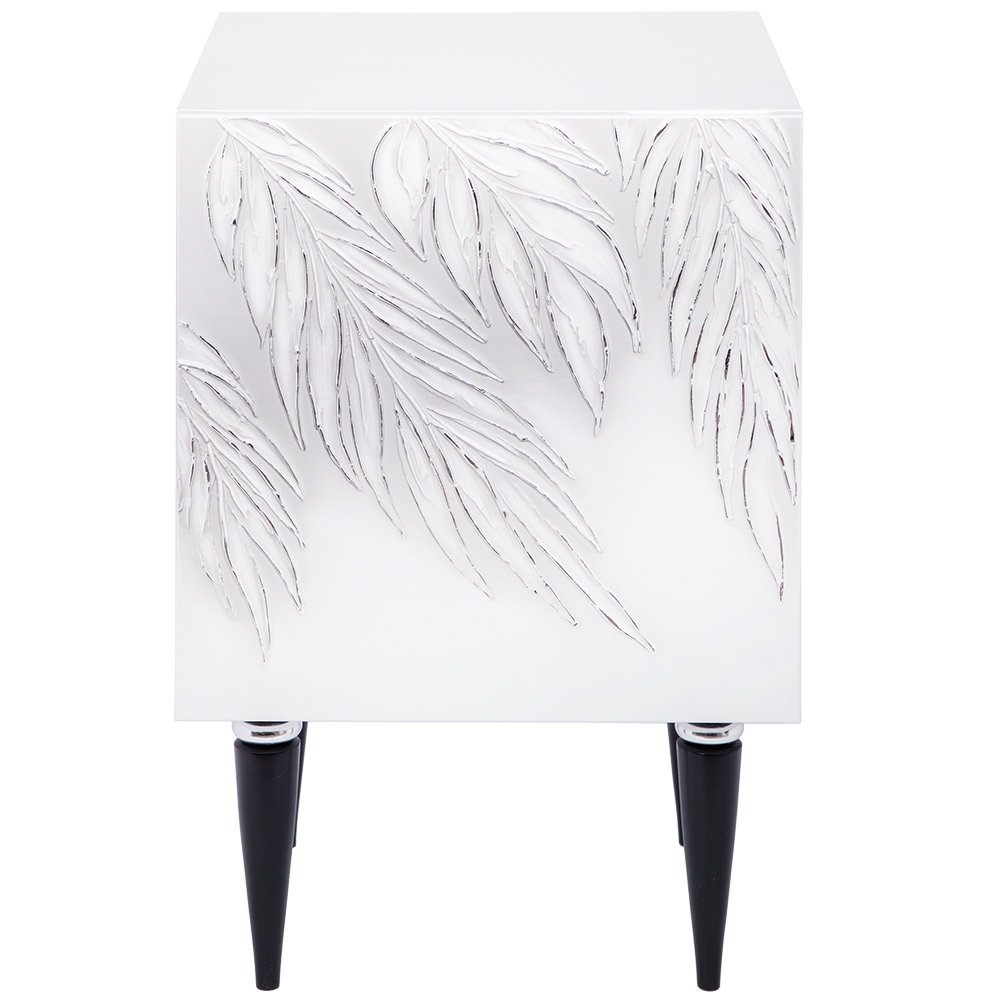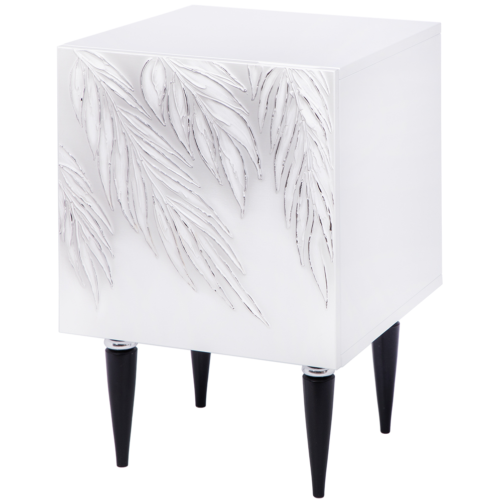 Сложно представить себе комфортную спальню без функциональной прикроватной тумбы. Для любой зоны отдыха такое изделие просто незаменимо: оно удобно и практично, не занимает много места. Тумба с полкой активно используется для декора, книг, косметики. Она служит альтернативой массивному комоду в прихожую, подставке для вещей в детскую или даже туалетному столику в спальню, если разместить тумбочку рядом с зеркалом. Словом, эта универсальная мебель найдет свое место в любом доме! Тумба белая – это находка для современного интерьера. Интересный фасад с тропическими листьями из коллекции Тропик придаст лоска оформлению комнаты. Тумбочка деревянная: корпус выполнен из мдф, который располагается на ножках из бука. Внутри тумбы вместительное отделение с двумя полками, которое заменит вам целый прикроватный комод. Эргономичная деталь в ваш уютный дом!
