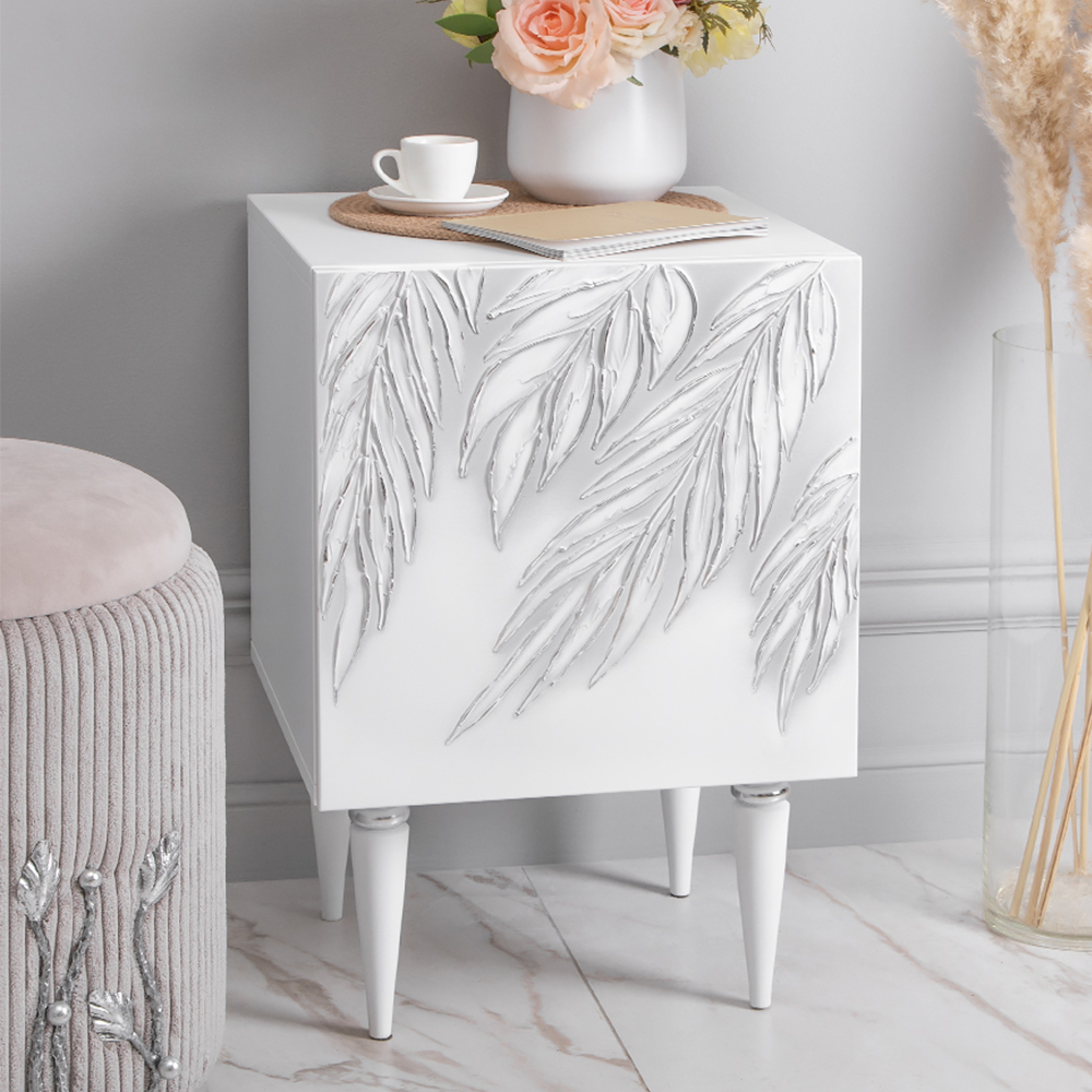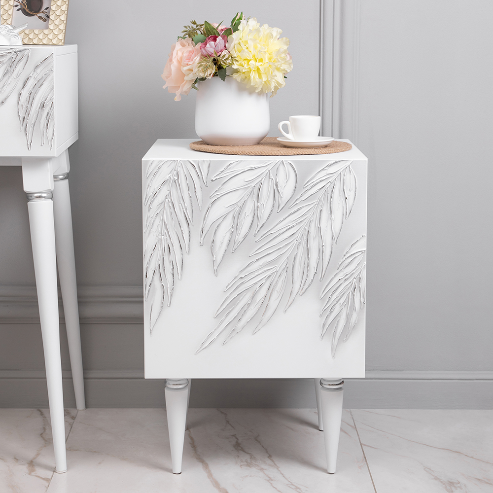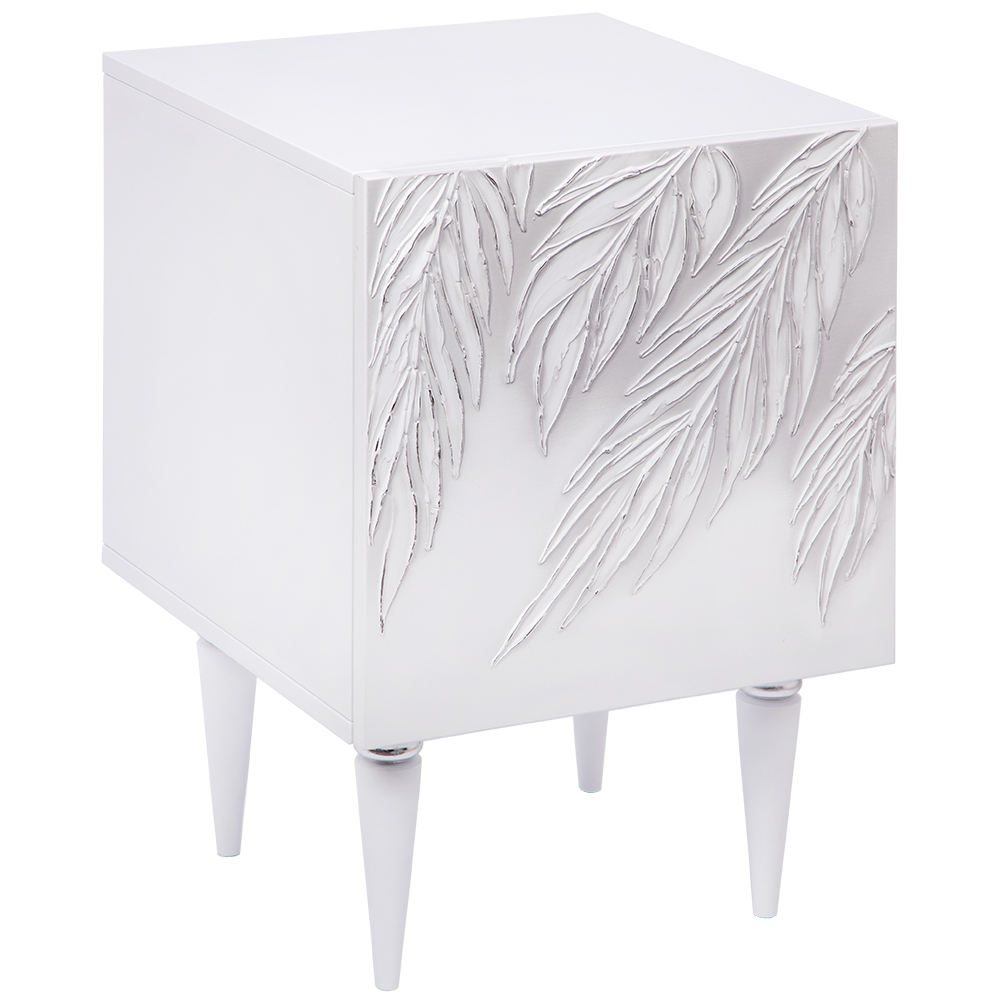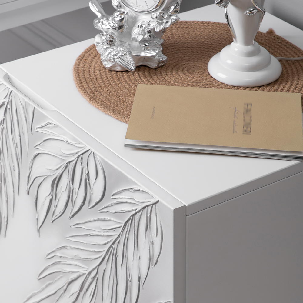 Тумба белая – это находка для современного интерьера. Интересный фасад с тропическими листьями из коллекции Тропик придаст лоска оформлению комнаты. Тумбочка деревянная: корпус выполнен из мдф, который располагается на ножках из бука.
