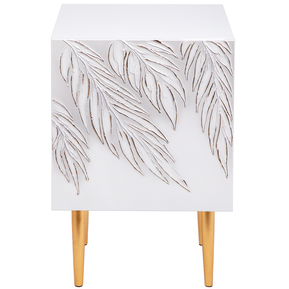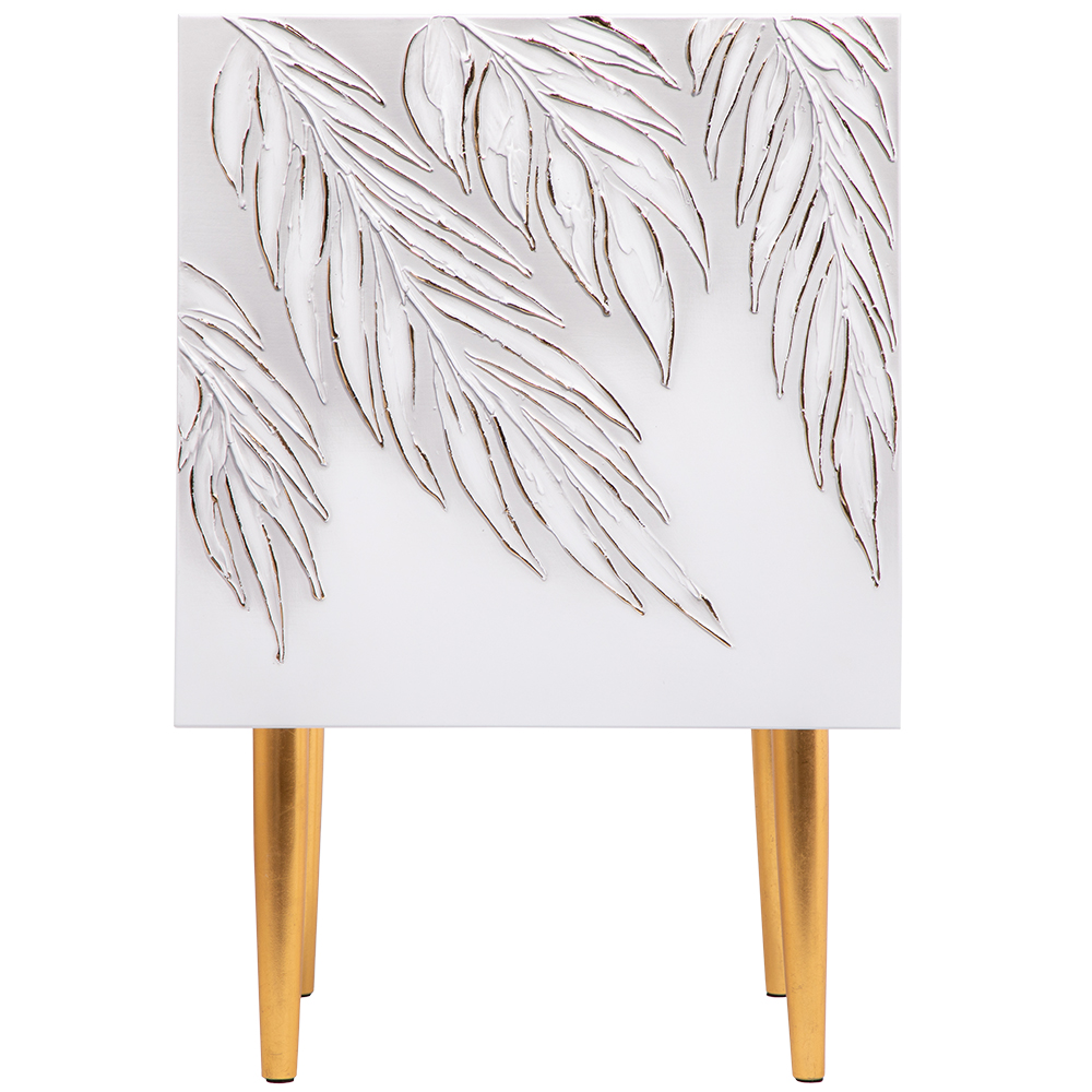 Сложно представить себе комфортную спальню без функциональной прикроватной тумбы. Для любой зоны отдыха такое изделие просто незаменимо: оно удобно и практично, не занимает много места. Тумба с полкой активно используется для декора, книг, косметики. Она служит альтернативой массивному комоду в прихожую, подставке для вещей в детскую или даже туалетному столику в спальню, если разместить тумбочку рядом с зеркалом. Словом, эта универсальная мебель найдет свое место в любом доме! Тумба белая – это находка для современного интерьера. Интересный фасад с тропическими листьями из коллекции Тропик придаст лоска оформлению комнаты. Тумбочка деревянная: корпус выполнен из мдф, который располагается на ножках из бука. Внутри тумбы вместительное отделение с двумя полками, которое заменит вам целый прикроватный комод. Эргономичная деталь в ваш уютный дом!
