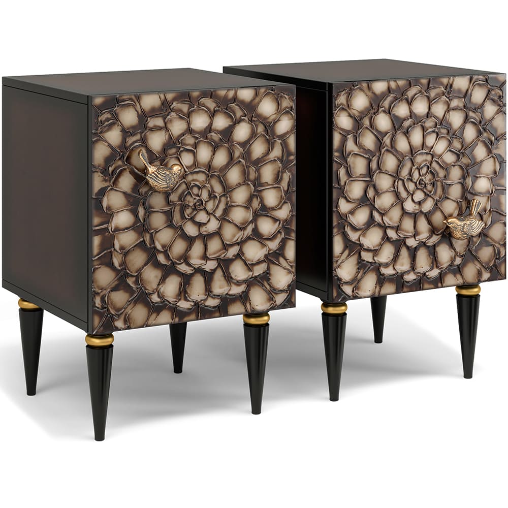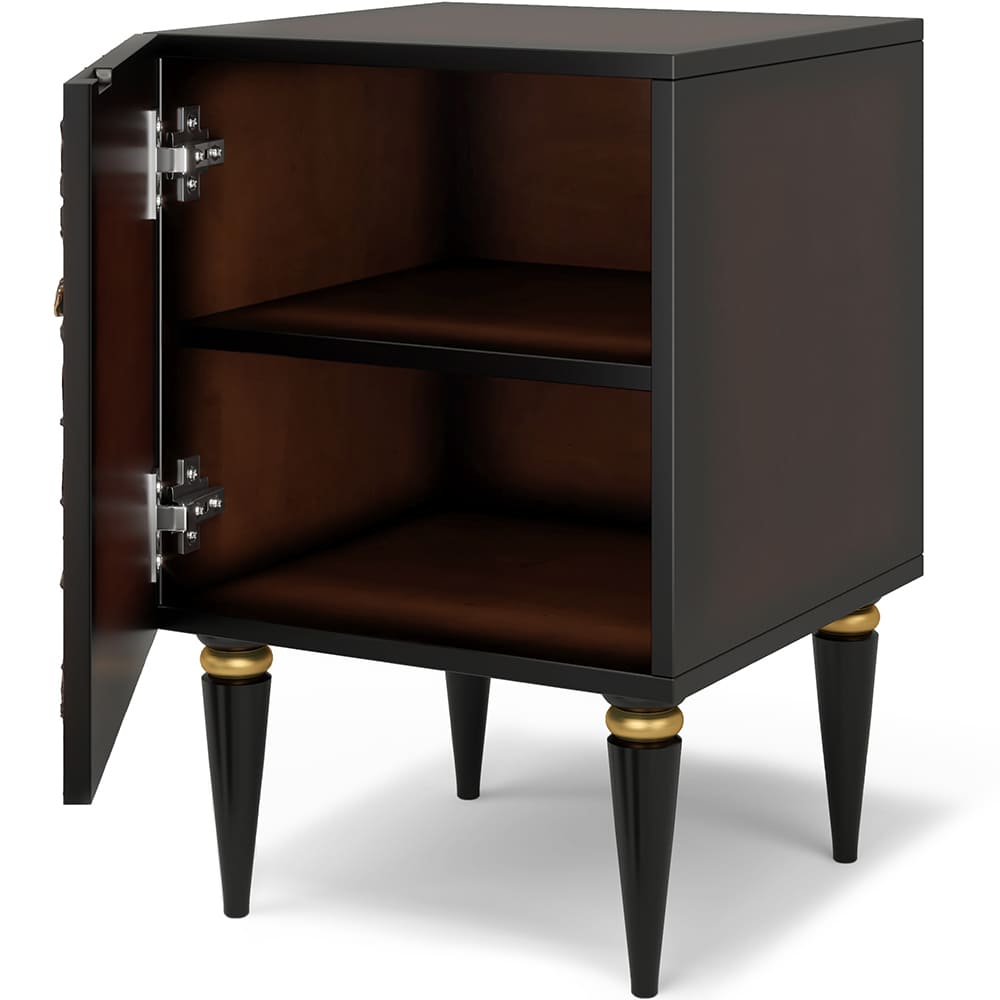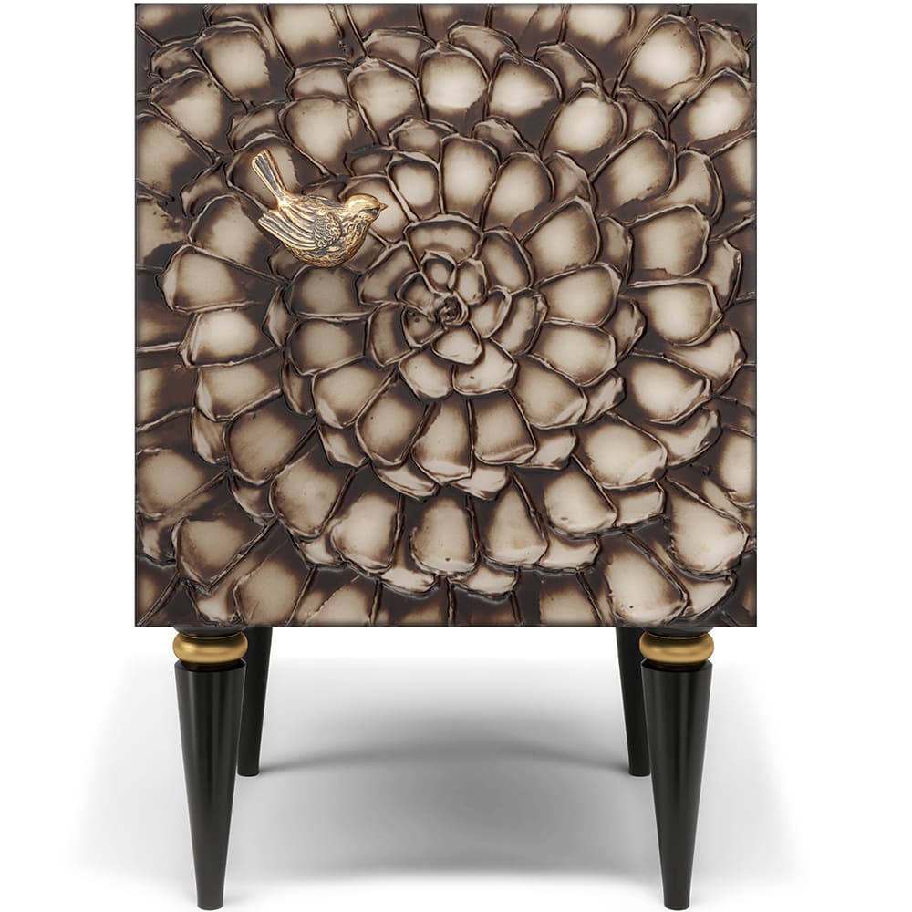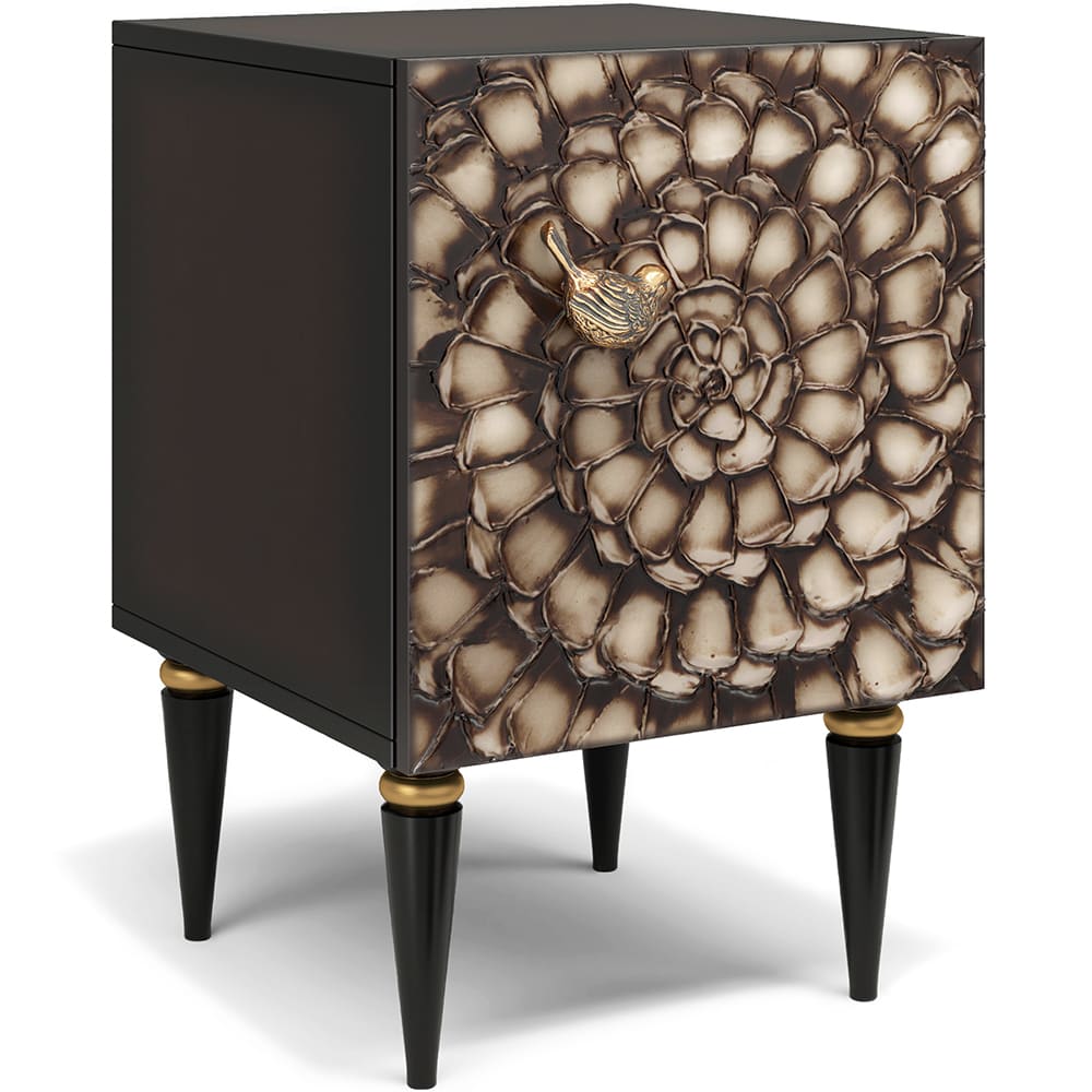 Тумба из мдф с распашной дверцей и двумя полками. Тумба совершенно нового формата позволяет преобразить дизайн и заполнить пространство природным шармом. Конические ножки прочно держат классическую форму изделия и добавляют изысканности интерьеру вашего дома. Тумба изготавливается из мдф. Декоративные элементы выполняются в технике мастихиновой живописи из натурального коелгинского мрамора мелкой фракции.