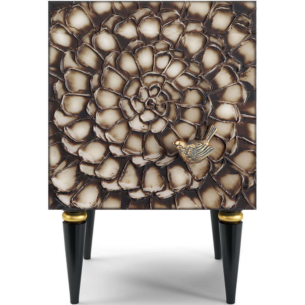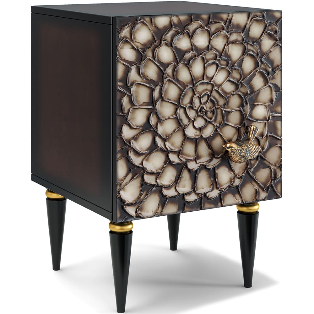 Тумба из мдф с распашной дверцей и двумя полками. Тумба совершенно нового формата позволяет преобразить дизайн и заполнить пространство природным шармом. Конические ножки прочно держат классическую форму изделия и добавляют изысканности интерьеру вашего дома. Тумба изготавливается из мдф. Декоративные элементы выполняются в технике мастихиновой живописи из натурального коелгинского мрамора мелкой фракции.