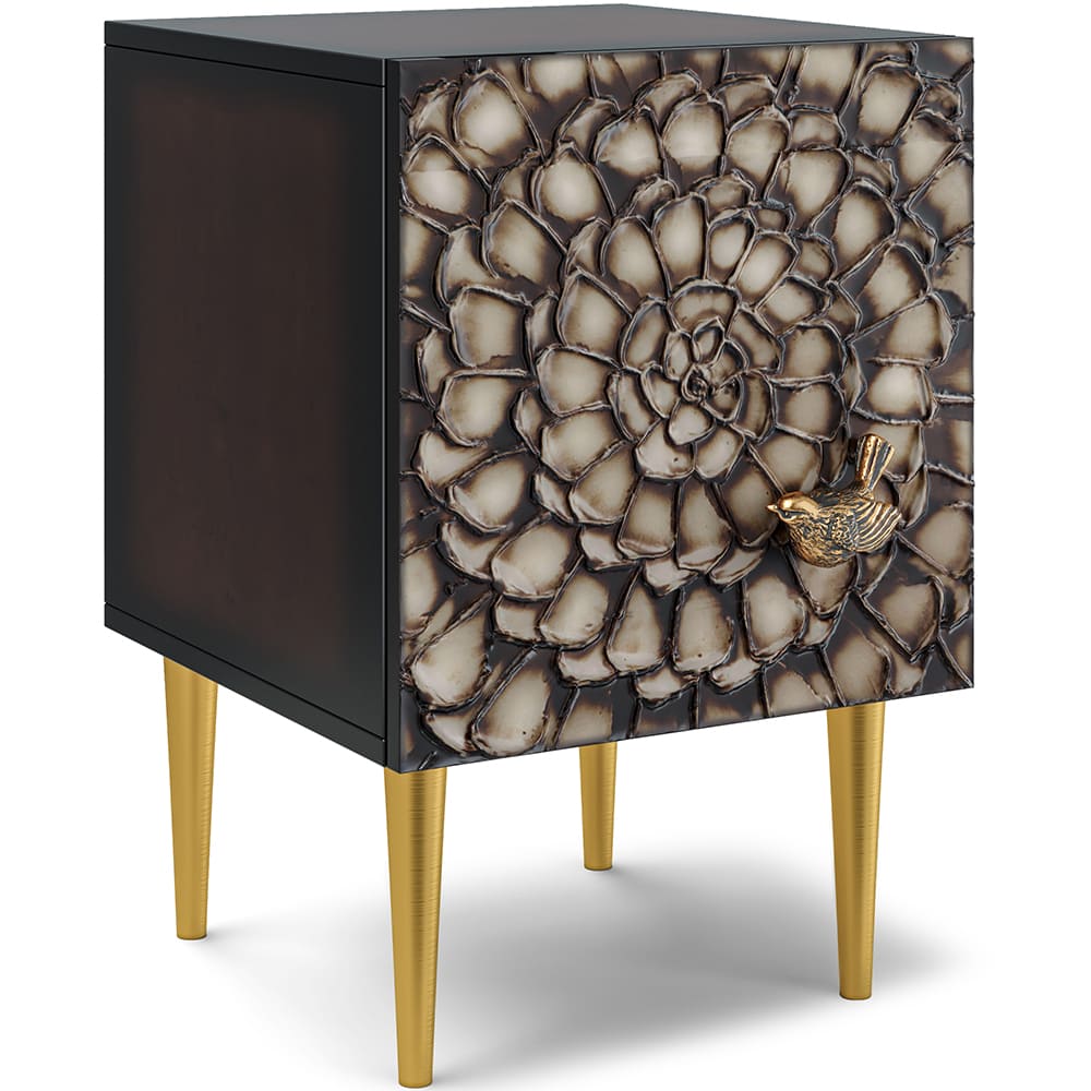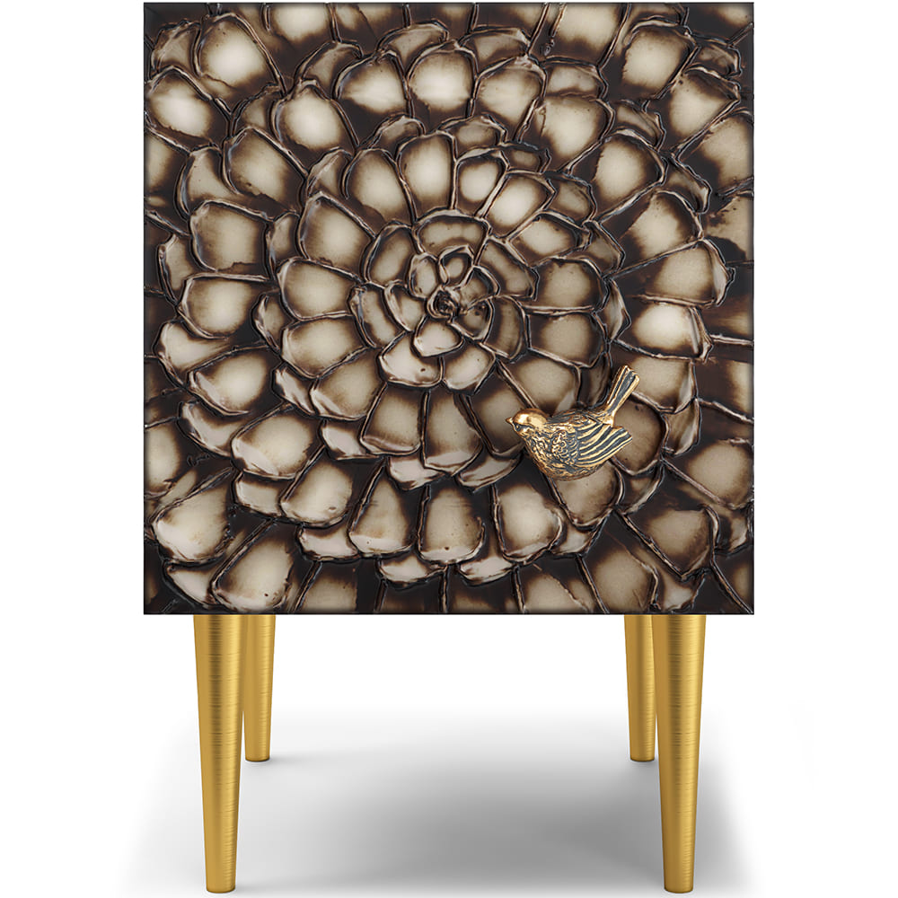 Тумба из мдф с распашной дверцей и двумя полками. Тумба совершенно нового формата позволяет преобразить дизайн и заполнить пространство природным шармом. Конические ножки прочно держат классическую форму изделия и добавляют изысканности интерьеру вашего дома. Тумба изготавливается из мдф. Декоративные элементы выполняются в технике мастихиновой живописи из натурального коелгинского мрамора мелкой фракции.
