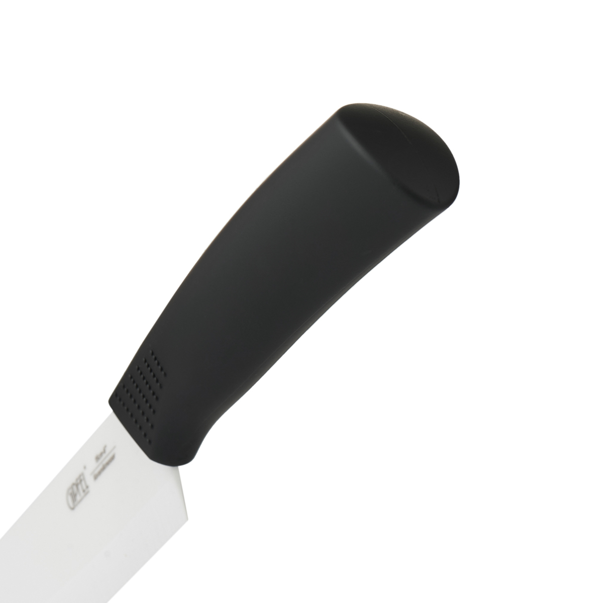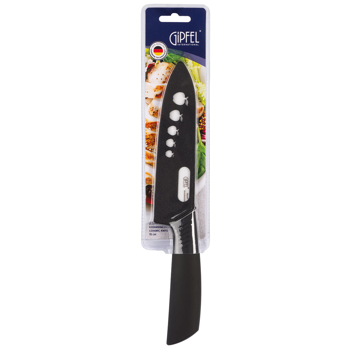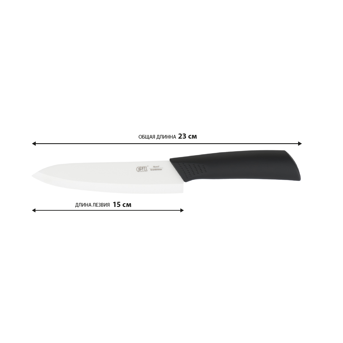 Универсальный нож Gipfel 8460 8460. Нож кухонный с керамическим лезвием. Длина лезвия 15 см. Длина ножа 23 см. Керамическое лезвие отличается превосходным сочетанием экологичности, остроты, гибкости и прочности. Бакелитовая ручка эргономична и не скользит в руке.