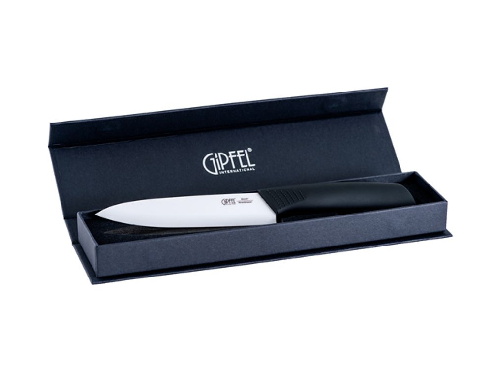 Универсальный нож Gipfel 8461. Лезвие длиной 12,7 см. Многофункциональный нож, который позволяет нарезать почти любой продукт: от зелени, овощей, фруктов до мякоти мяса или птицы. Керамическое лезвие отличается превосходным сочетанием экологичности, остроты, гибкости и прочности, то есть именно тем, чем и должен выделяться идеальный кухонный нож. Добавьте к этому удобную бакелитовую ручку, которая не выскальзывает при резке, и вы получите настоящий профессиональный нож. Острое лезвие легко очищается и не требует частой заточки.