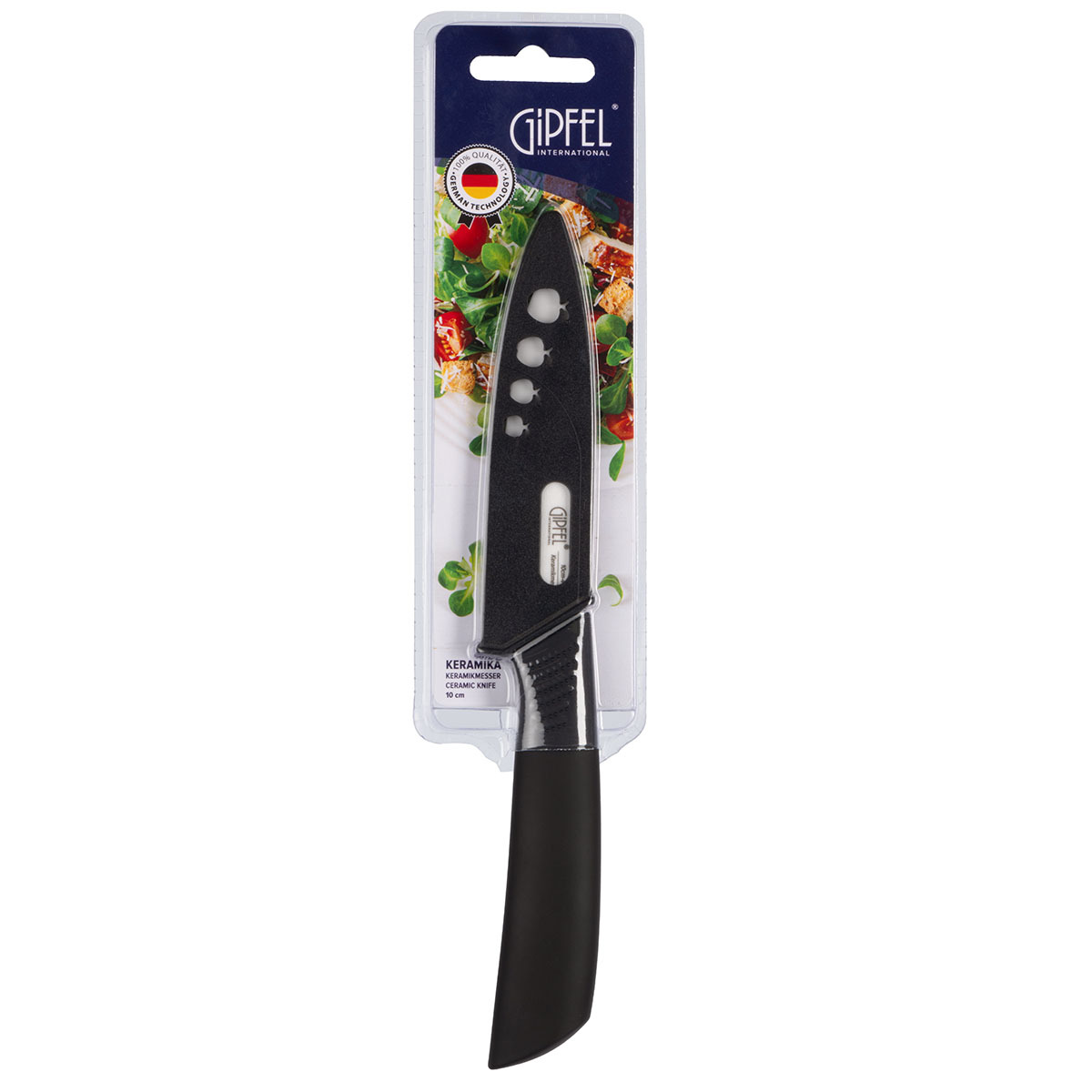 Универсальный нож Gipfel 8462. Многофункциональный нож, который позволяет нарезать почти любой продукт: от зелени, овощей, фруктов до мякоти мяса или птицы. Керамическое лезвие отличается превосходным сочетанием экологичности, остроты, гибкости и прочности, то есть именно тем, чем и должен выделяться идеальный кухонный нож. Добавьте к этому удобную бакелитовую ручку, которая не выскальзывает при резке, и вы получите настоящий профессиональный нож. Острое лезвие легко очищается и не требует частой заточки.