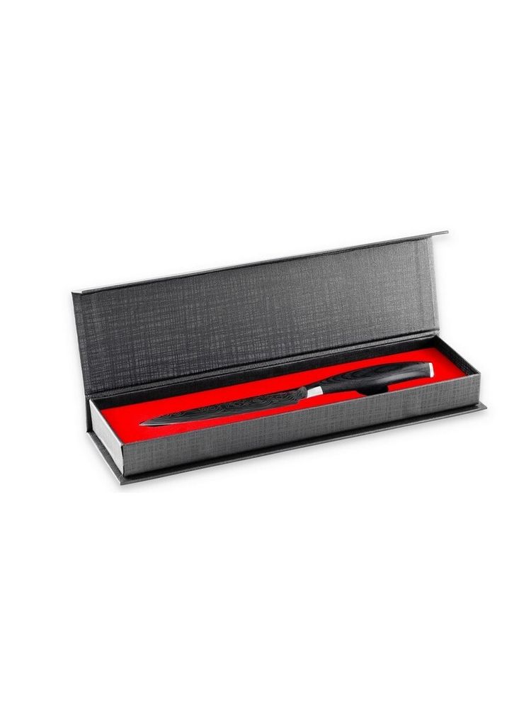 Универсальный нож Gipfel Barocco 9890 с лезвием 13 см и удобной черной ручкой с серыми продольными красивыми прожилками древеснослоистого пластика.
