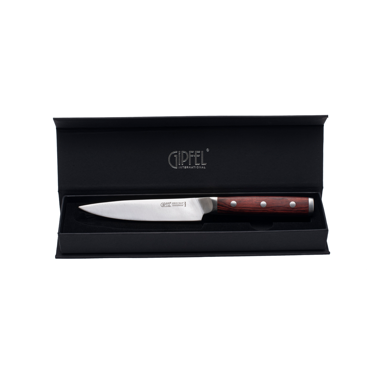 Универсальный нож Gipfel Grifo 9860. Длина лезвия 13 см. Материал лезвия: нержавеющая сталь 3Cr14. Материал ручки: дерево. Толщина лезвия 1,8 мм.