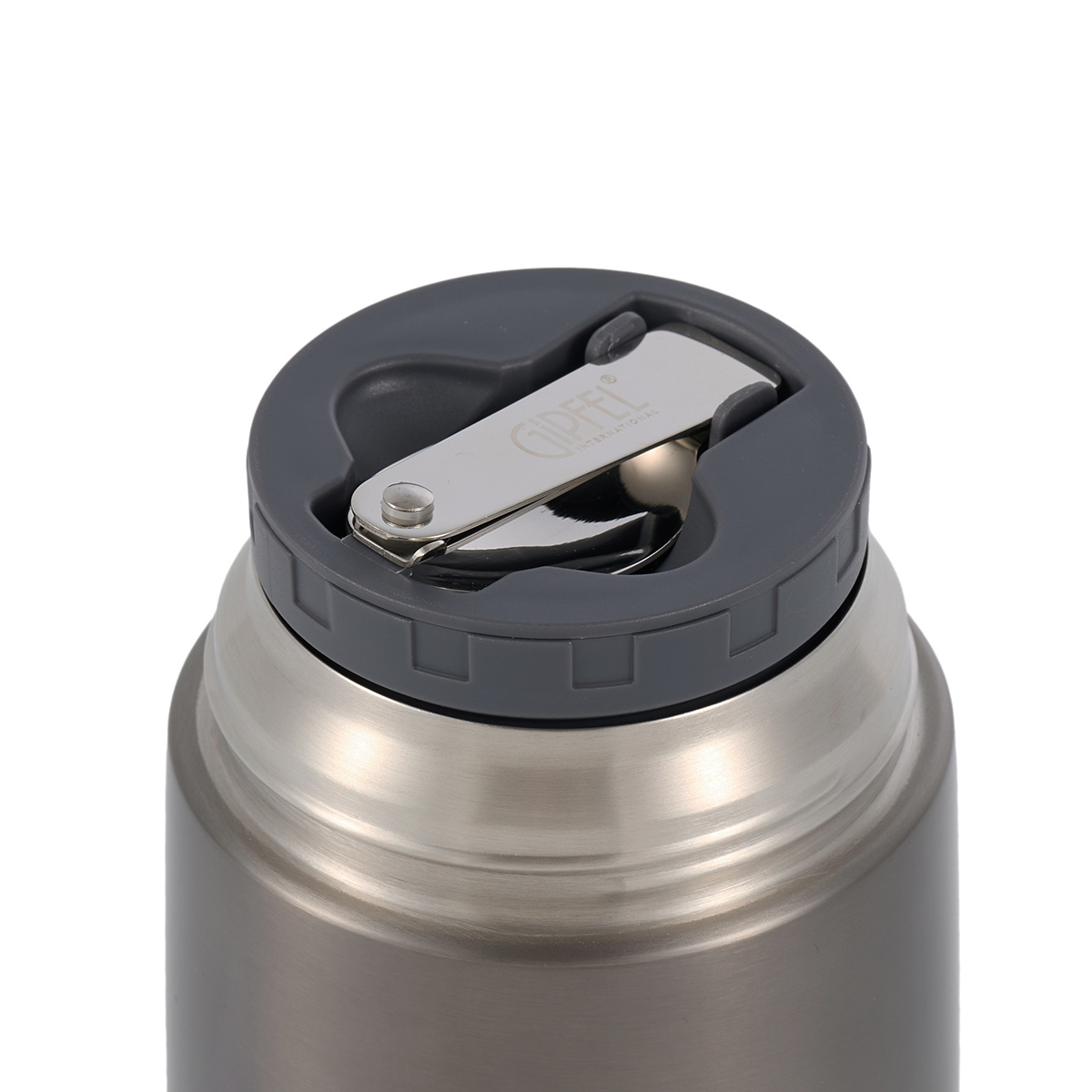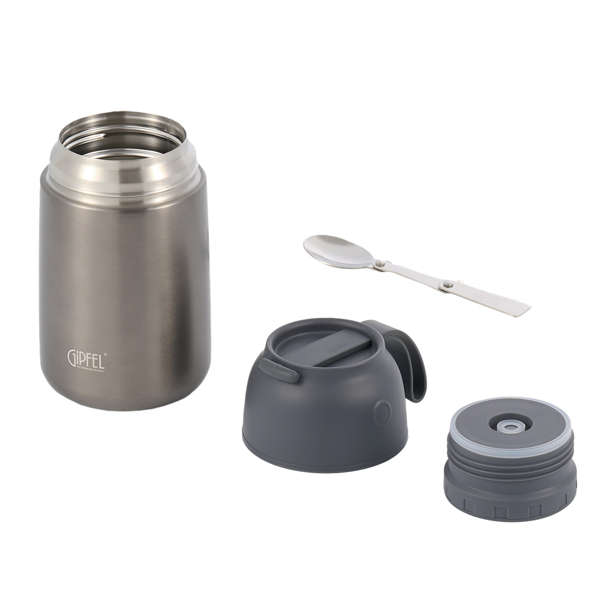 Вакуумный термос для еды Gipfel Berlin 52865 700 мл. Изготовлен из нержавеющей стали 18/10, пластика и силикона. Цвет серый. Термос герметичный с широким горлом, со складной ложкой из нержавеющей стали, крышкой-чашкой и силиконовым противоскользящим основанием.