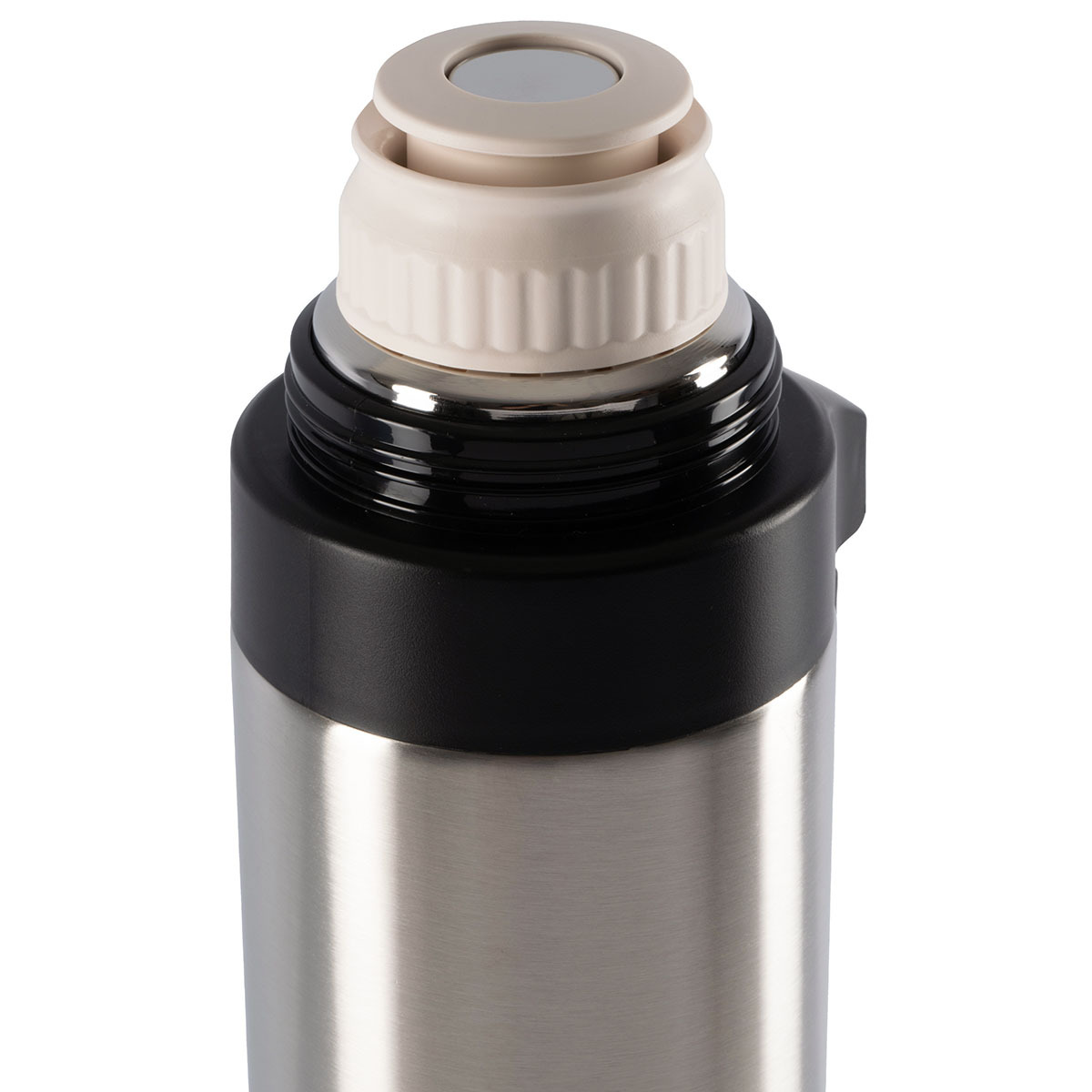 Термос имеет узкое горло с завинчивающимся клапаном и герметичную пресс-крышку. Крышку можно использовать как чашку.