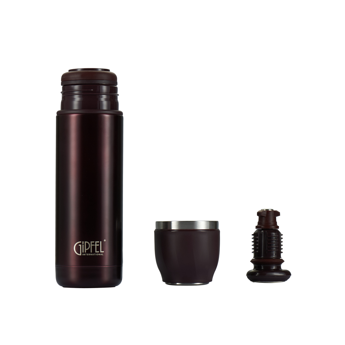 Термос вакуумный GIPFEL KLOSS 8214 объемом 500мл. Материал: нержавеющая сталь 18/10, пластик, силикон. Крышка снаружи сделана из пластика, изнутри нержавеющая сталь, крышку можно использовать в качестве чашки. Внутри у термоса есть сито, что удобно при заваривании чая. Высота 26 см, диаметр дна 6,5 см. Термос уплотнен силиконовыми прокладками, что дает ему хорошую герметичность. Цвет насыщенный бордовый. На дне силиконовая противоскользящая накладка.