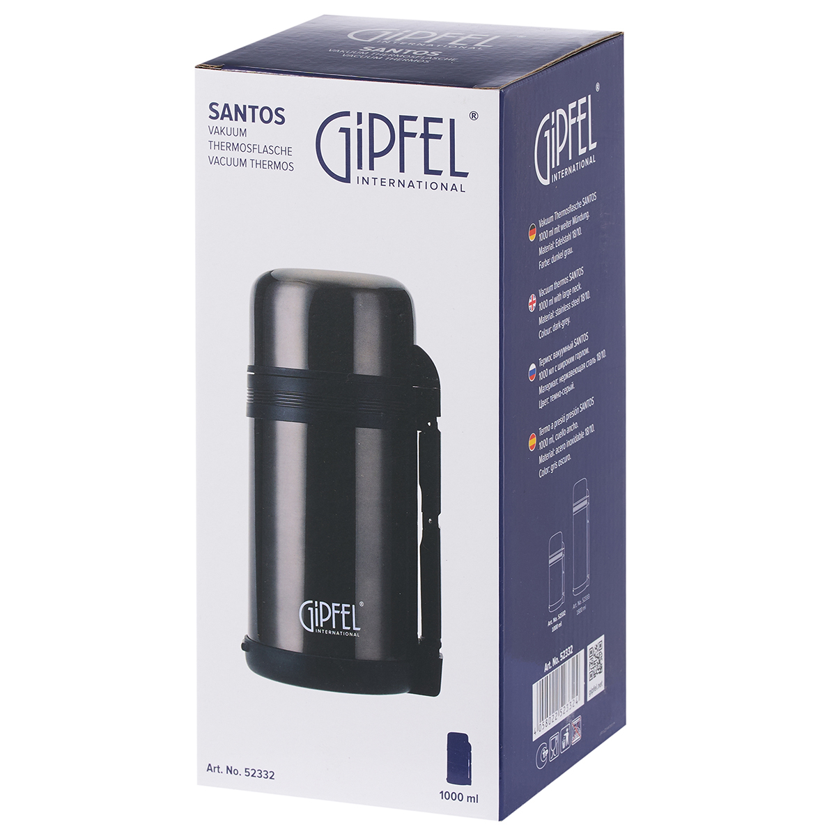 Вакуумный термос Gipfel Santos 52332. Объем 1 л. Корпус изготовлен из нержавеющей стали 18/10, материала прочного, безопасного для здоровья и долговечного.