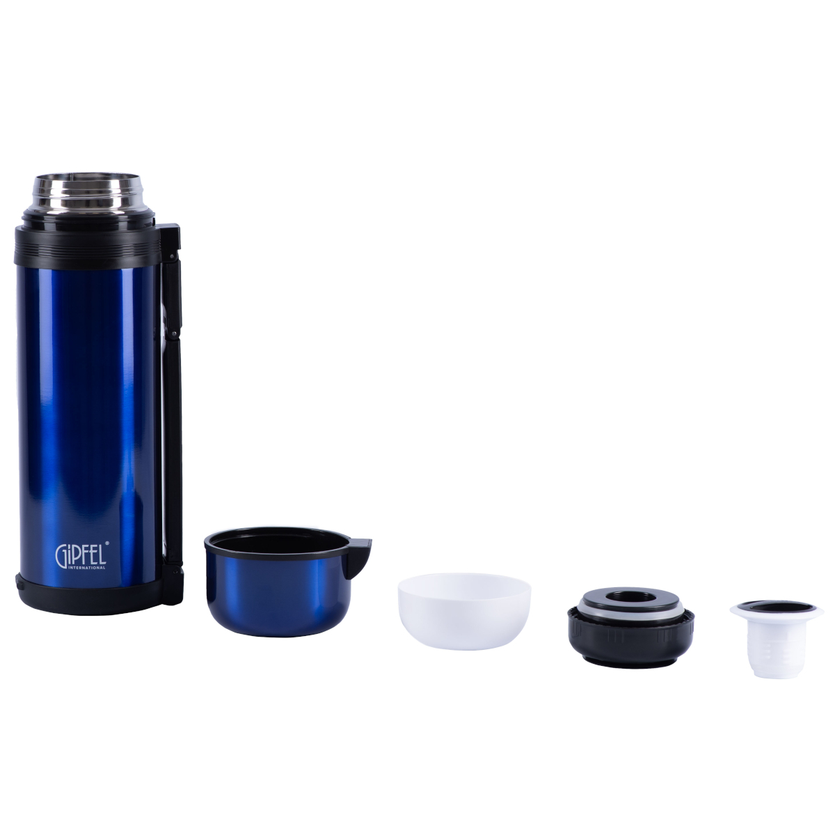 Термос вакуумный Gipfel Santos 8228. Стильный термос синего цвета имеет большой объем и подойдет для долгих походов или пикников. У термоса две крышки, которые можно использовать в качестве кружек. Вдоль стенки расположена большая выдвигающаяся ручка.