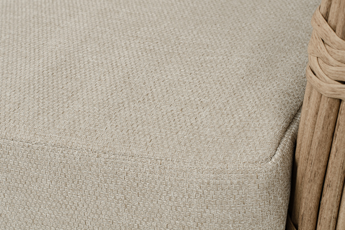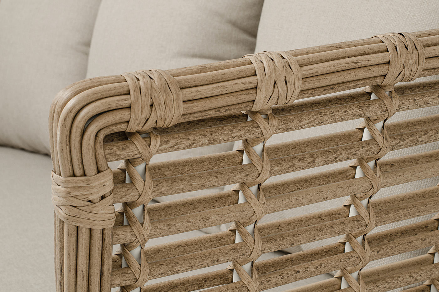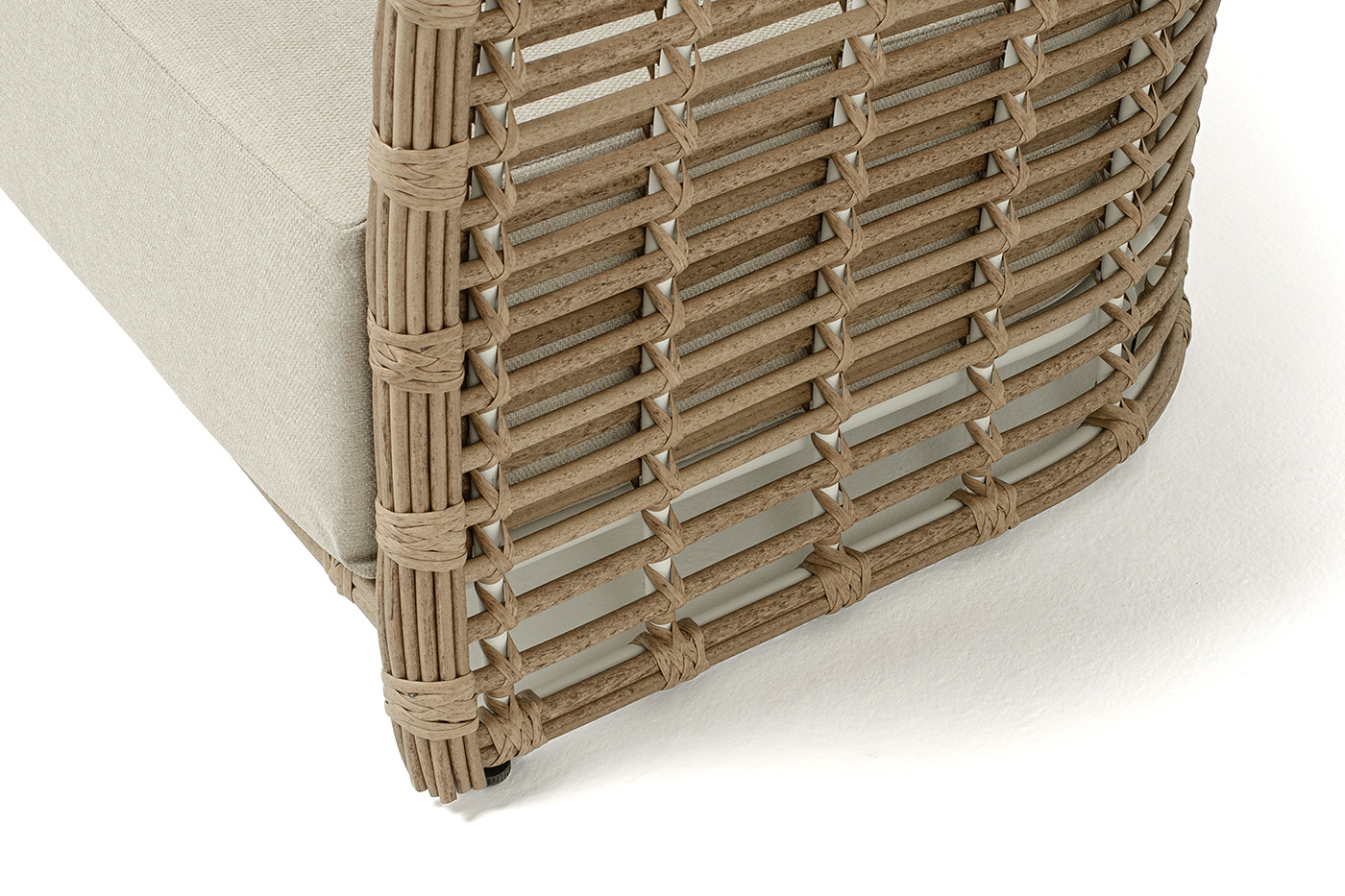Ручное круглое плетение является основным декоративным элементом мебели. Оно выполнено из искусственного ротанга в соломенном цвете.