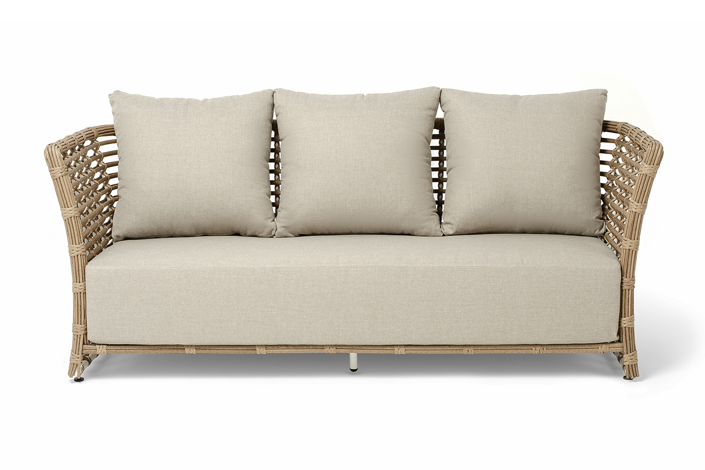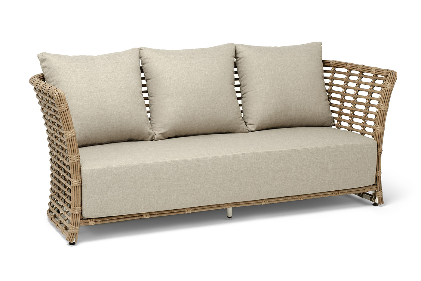 В комплекте с трехместным диваном идут мягкие подушки для комфортного расположения. Чехлы съёмные бежевого цвета из высококлассного полиэстера с плотностью 300гр/м2. Защитные свойства ткани усиливаются при помощи влагоотталкивающей пропитки.