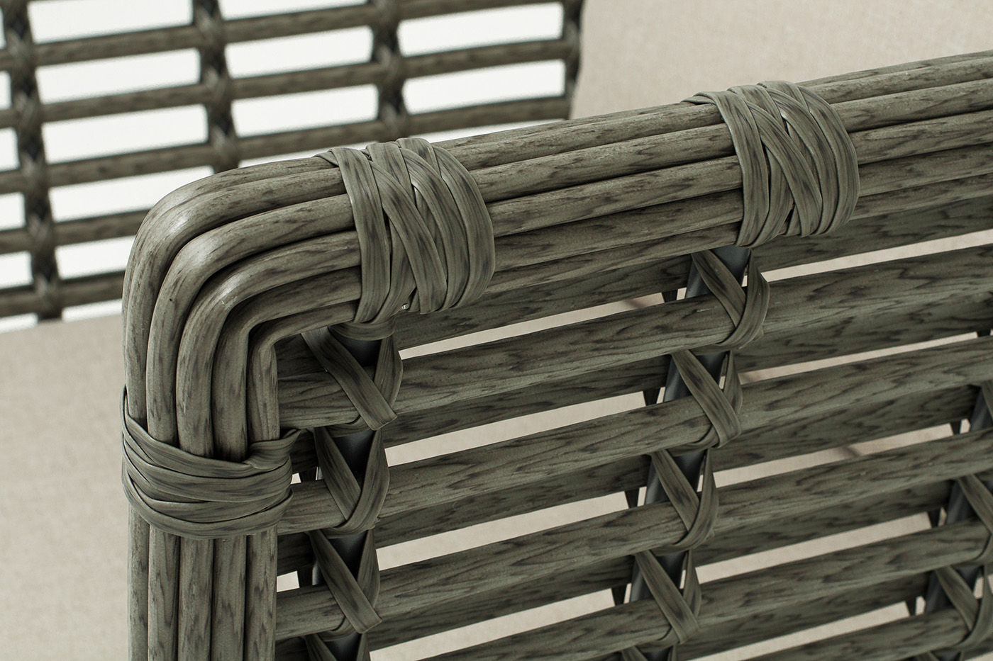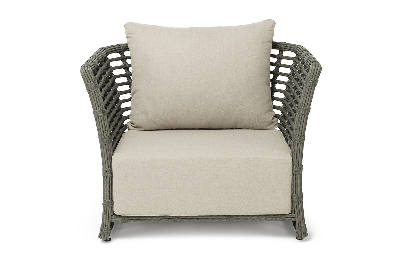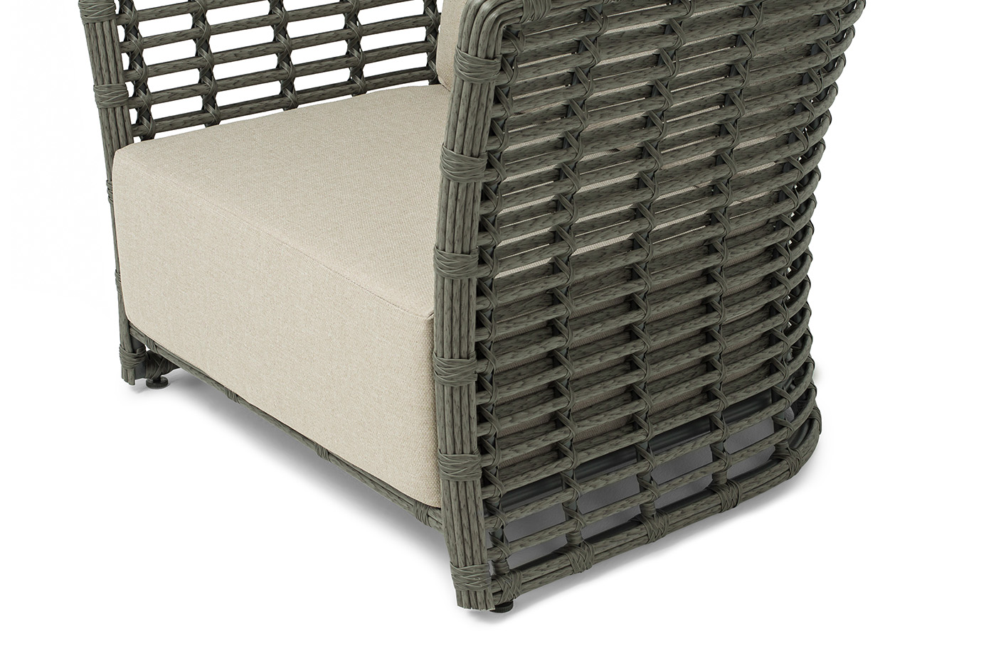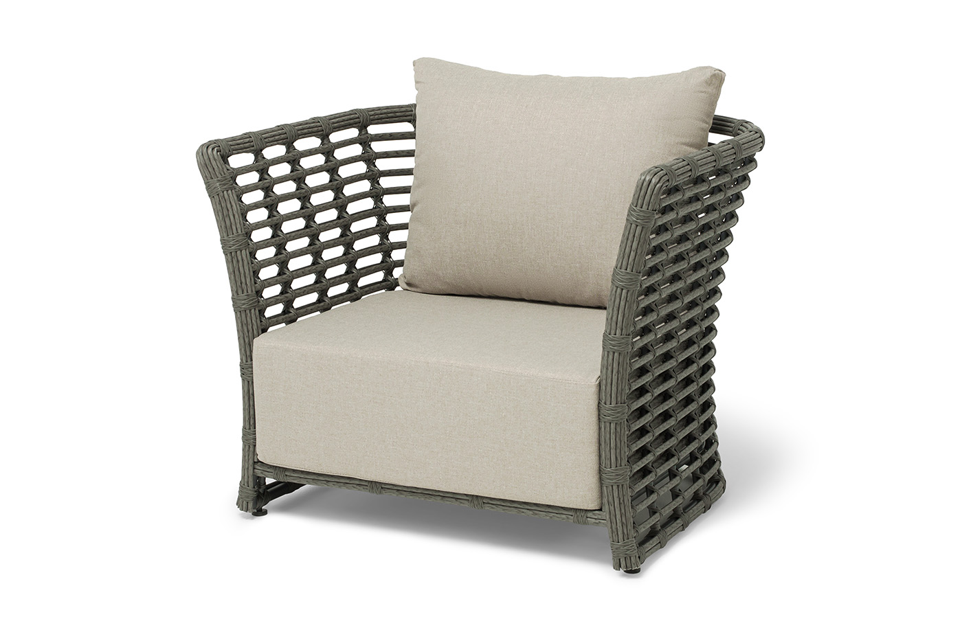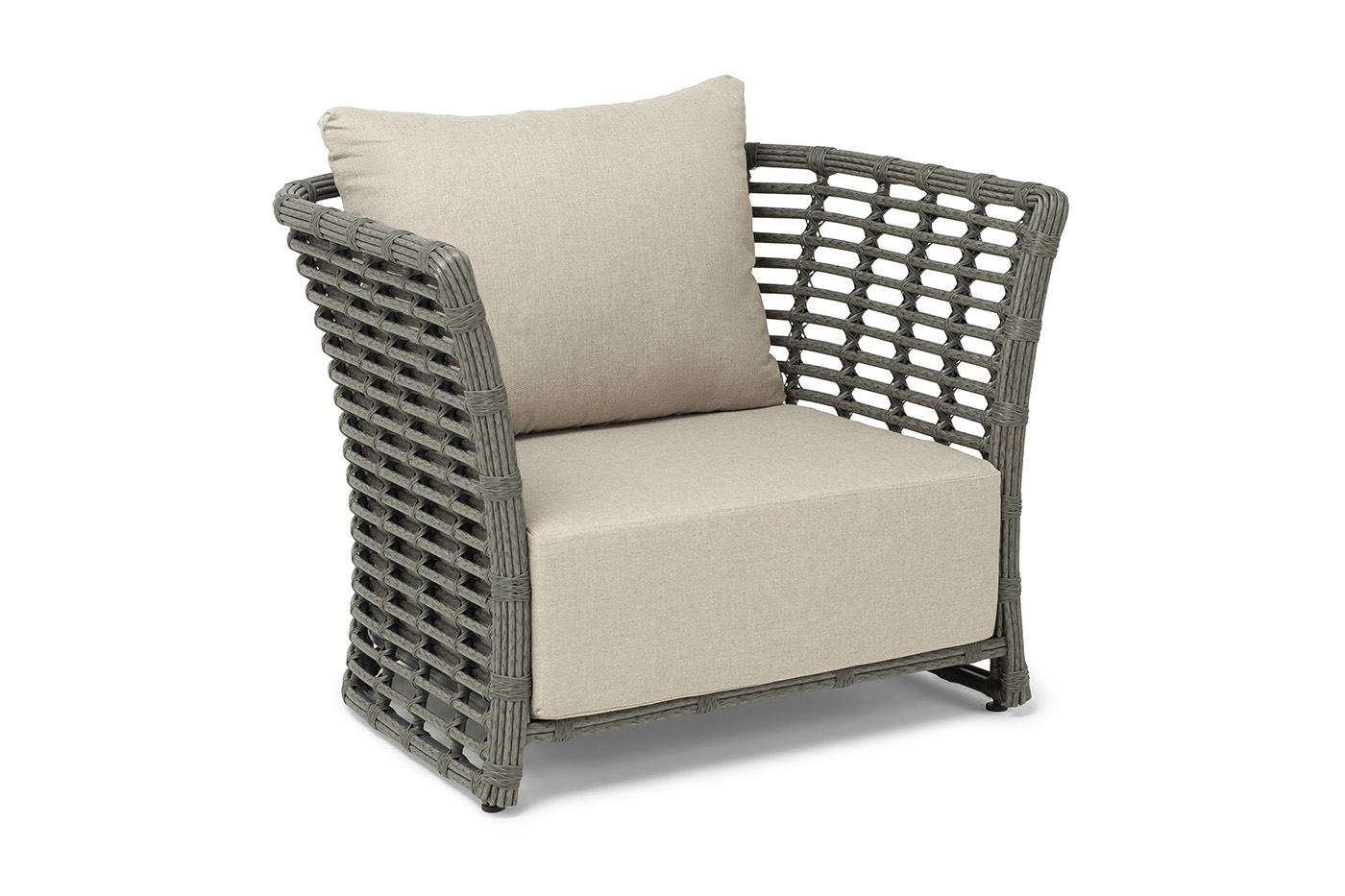 Кресло оснащено каркасом из прочного алюминия, ручное круглое плетение является основным декоративным элементом мебели. Оно выполнено из искусственного ротанга в сером цвете.