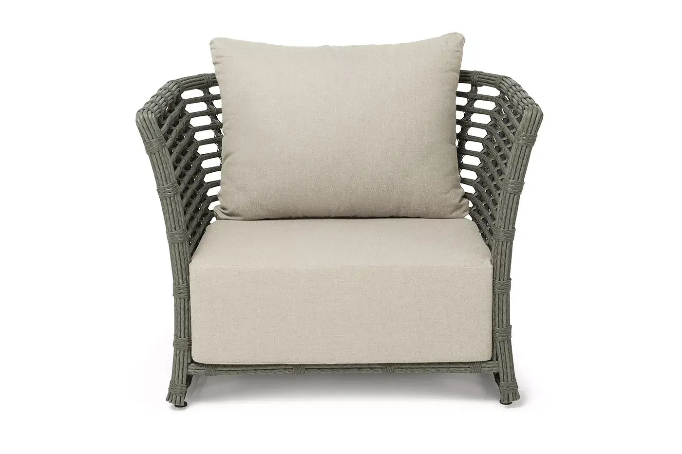 Кресло оснащено каркасом из прочного алюминия, ручное круглое плетение является основным декоративным элементом мебели. Оно выполнено из искусственного ротанга в сером цвете.