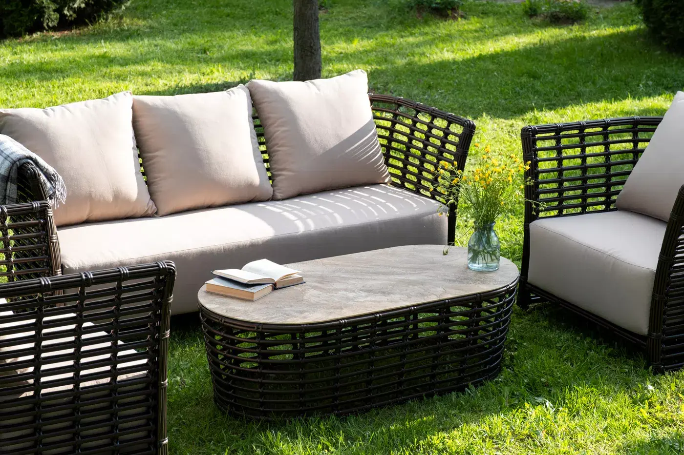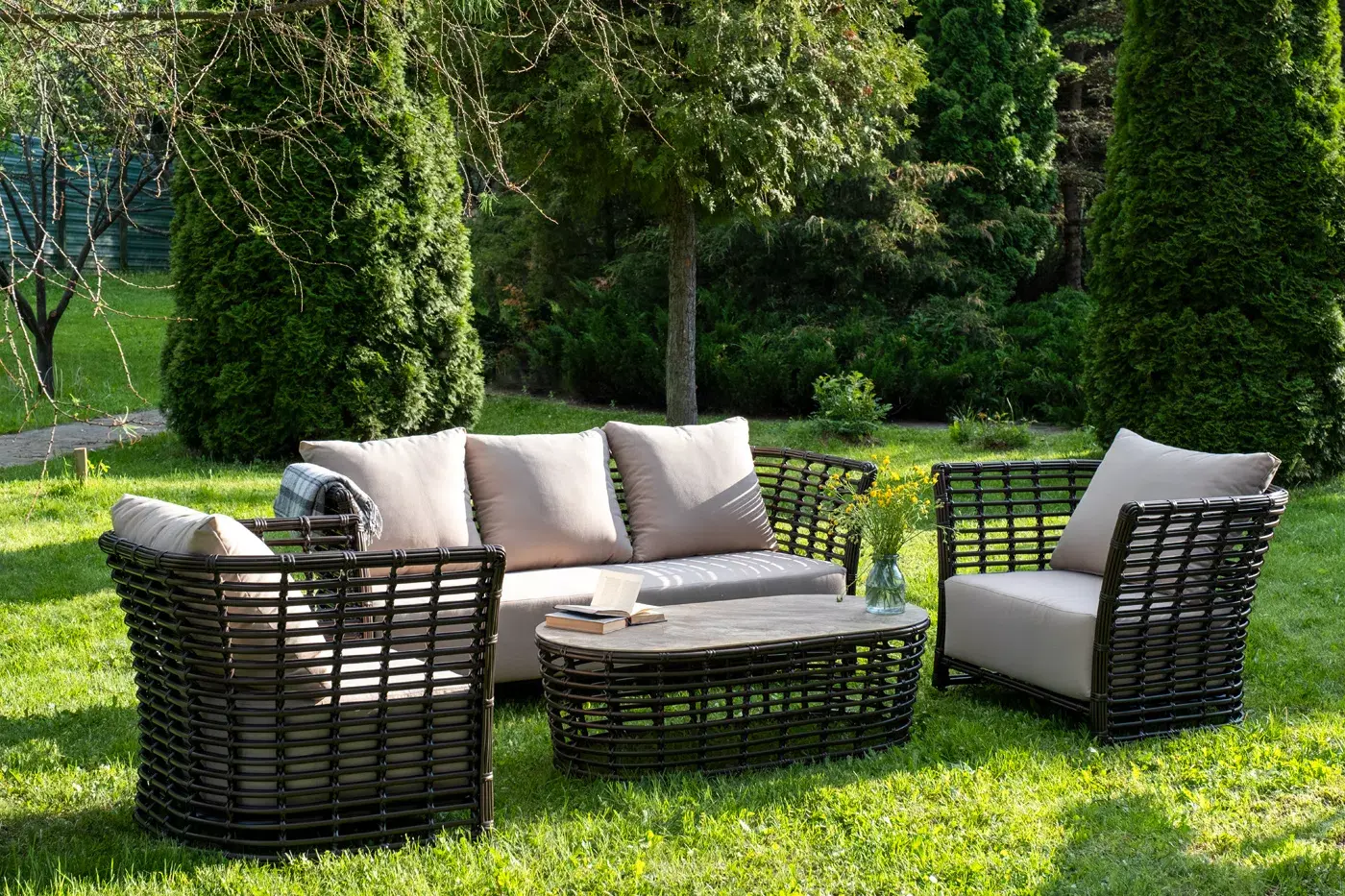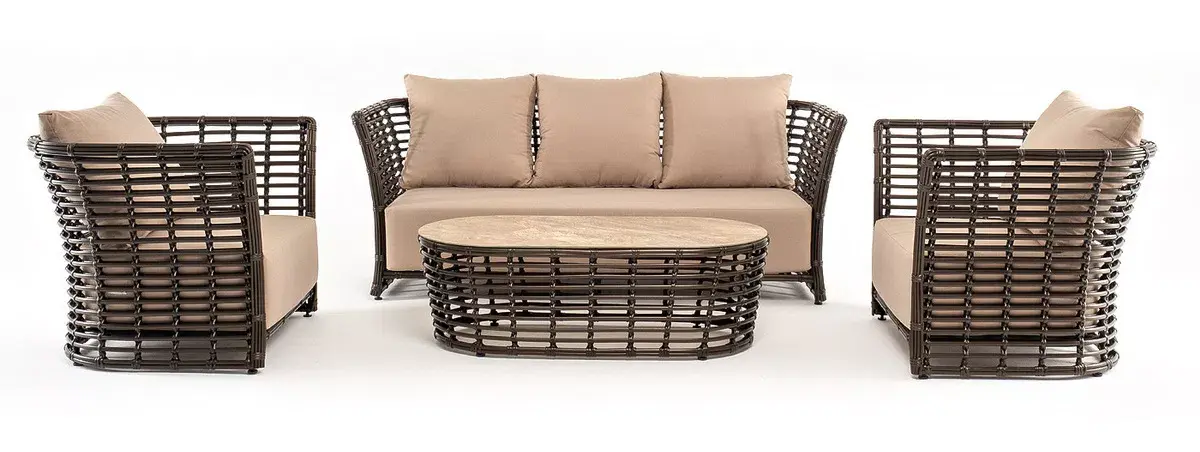 Плетеная мебель дополнена удобными подушками в бежевых чехлах. При их изготовлении используют полиэстер, плотность – 300гр/м2. Он обрабатывается влагоотталкивающей пропиткой для повышения защитных свойств материала.
