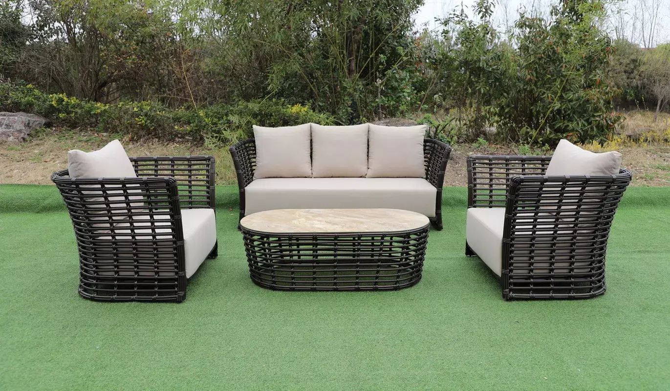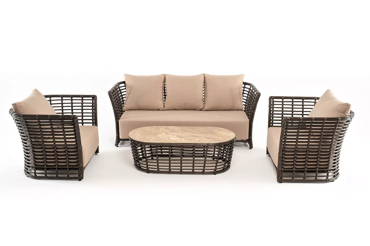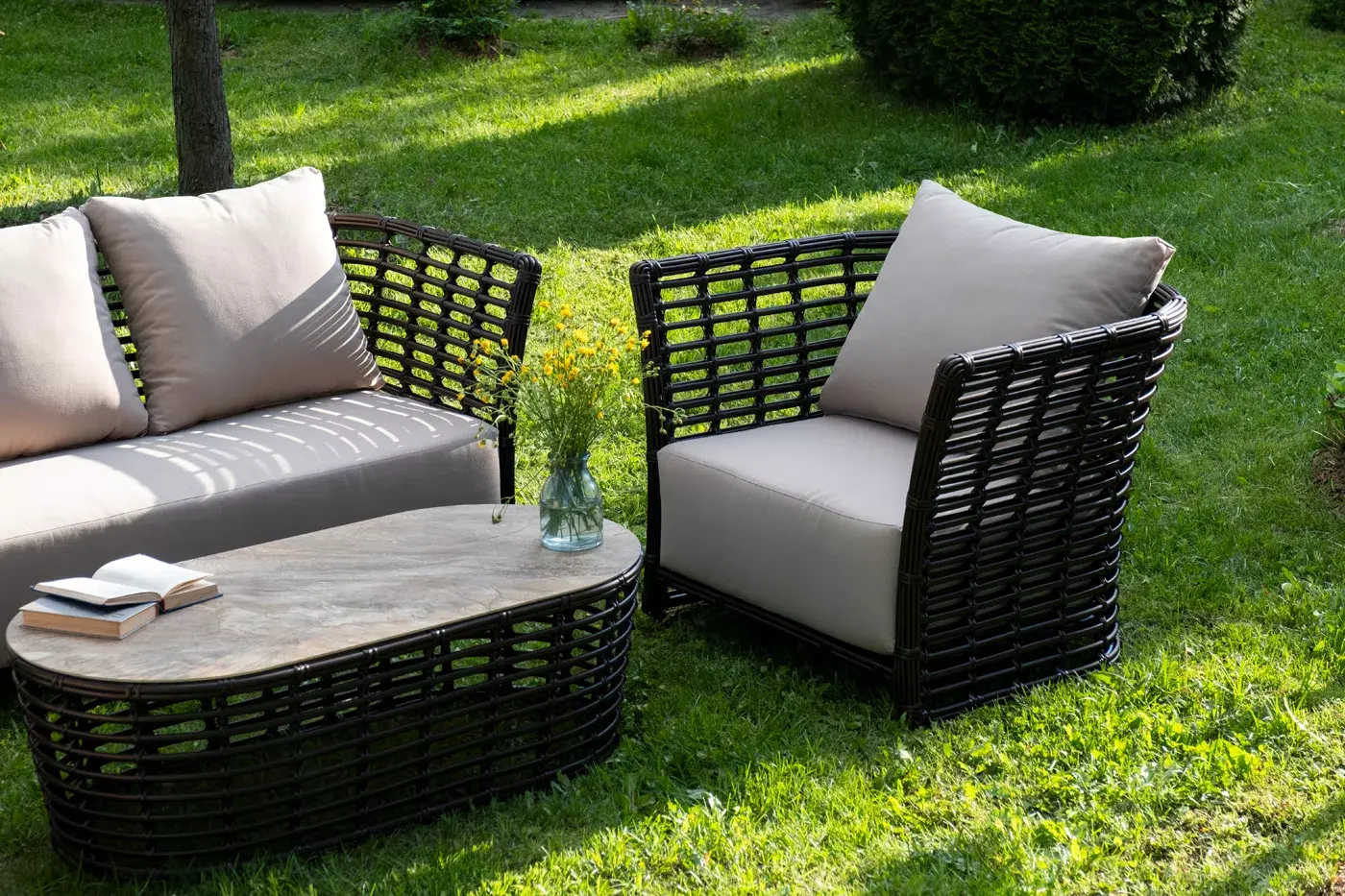 Плетеная мебель дополнена удобными подушками в бежевых чехлах. При их изготовлении используют полиэстер, плотность – 300гр/м2. Он обрабатывается влагоотталкивающей пропиткой для повышения защитных свойств материала.