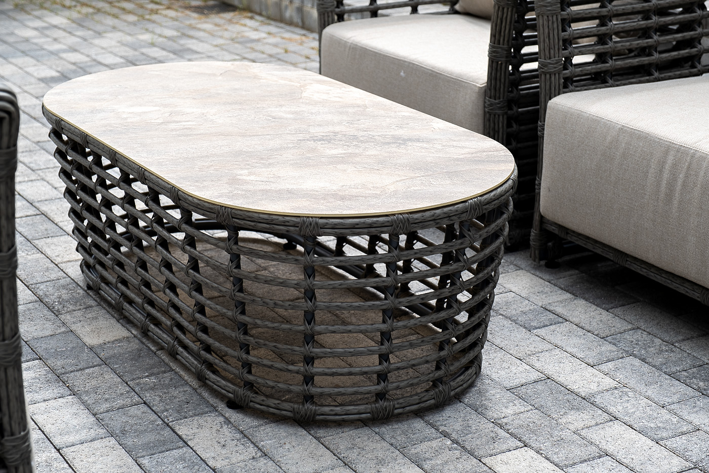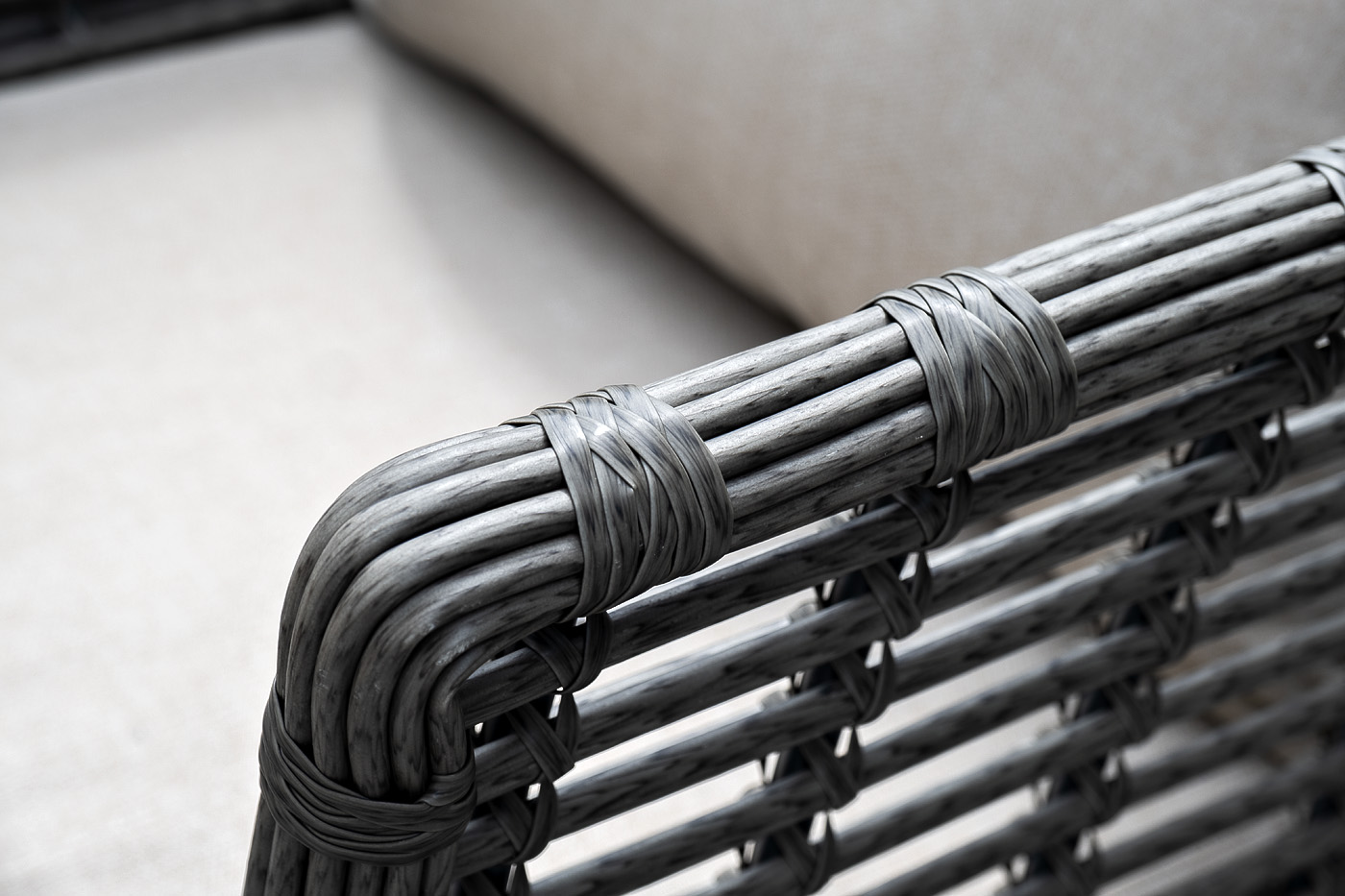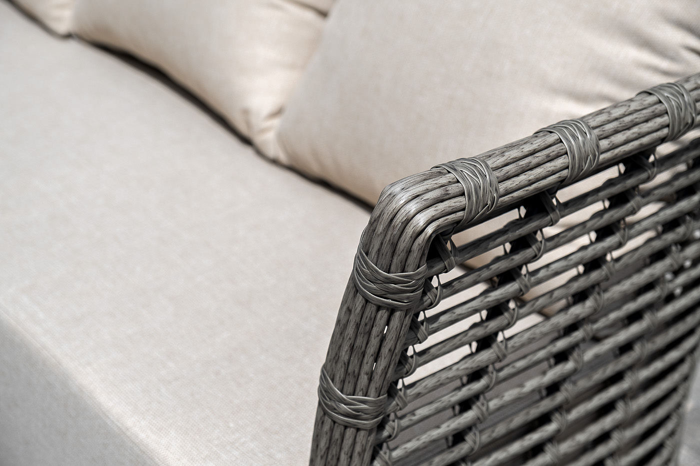 Модели имеют алюминиевый каркас, который оплетен вручную искусственным ротангом серого цвета.
