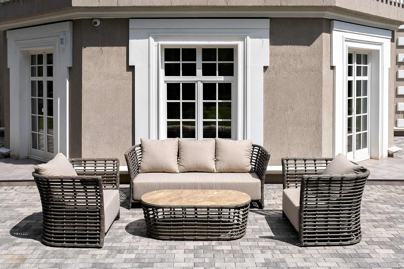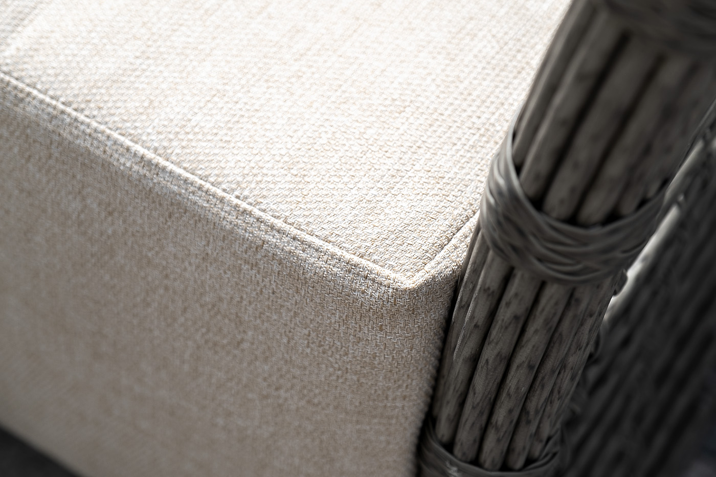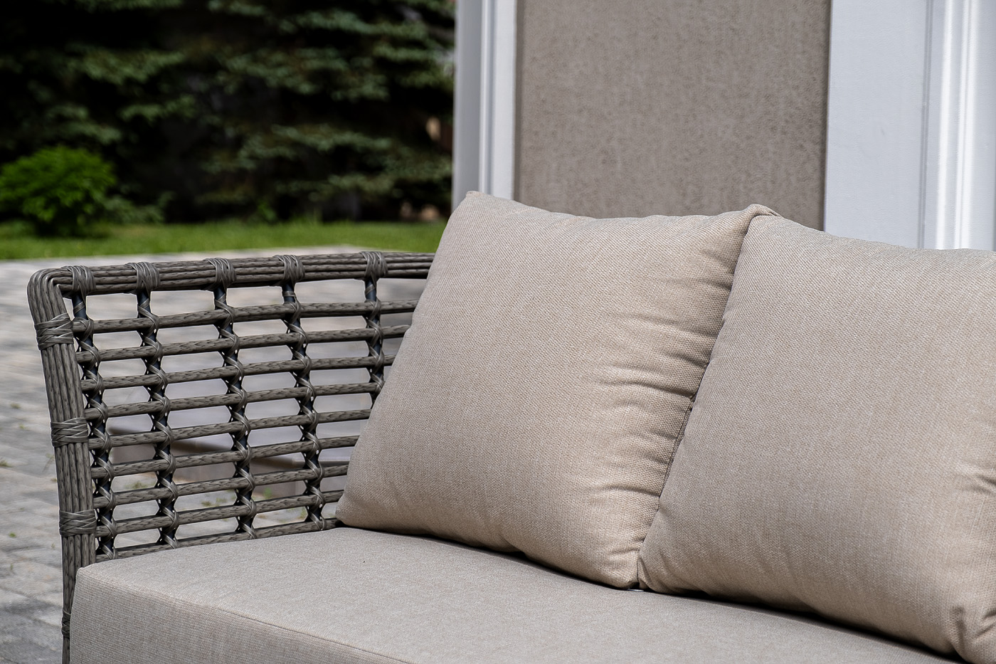 Плетеная мебель дополнена удобными подушками в бежевых чехлах. При их изготовлении используют полиэстер, плотность – 300гр/м2. Он обрабатывается влагоотталкивающей пропиткой для повышения защитных свойств материала.