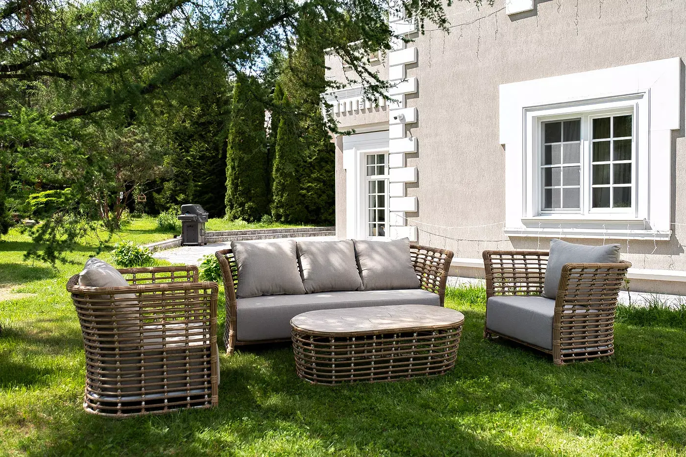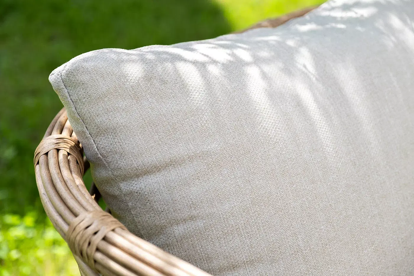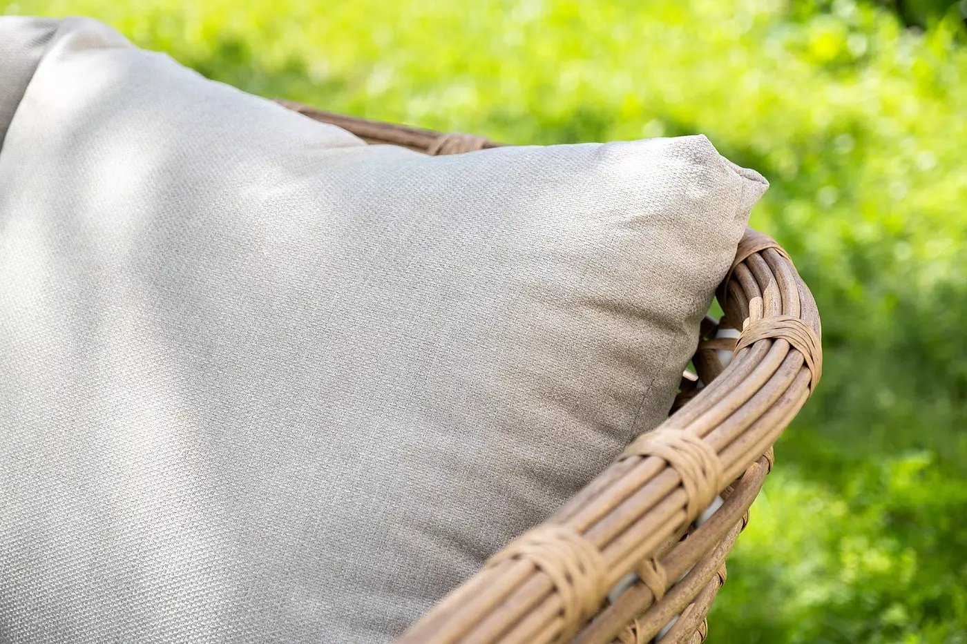 Плетеная мебель дополнена удобными подушками в бежевых чехлах. При их изготовлении используют полиэстер, плотность – 300гр/м2. Он обрабатывается влагоотталкивающей пропиткой для повышения защитных свойств материала.