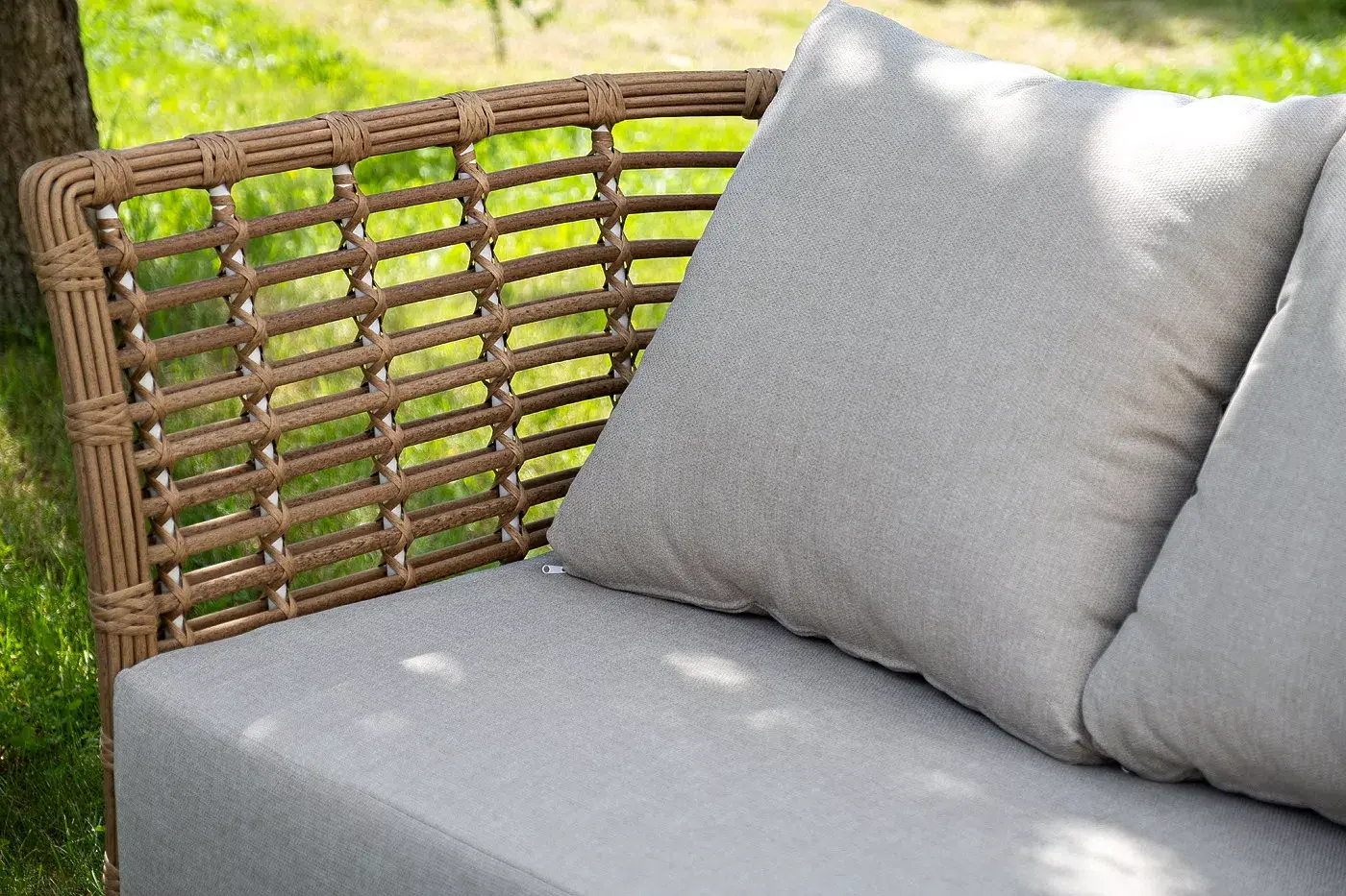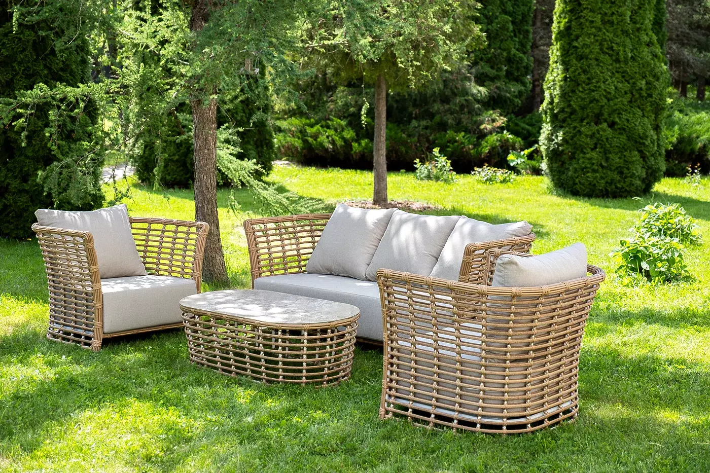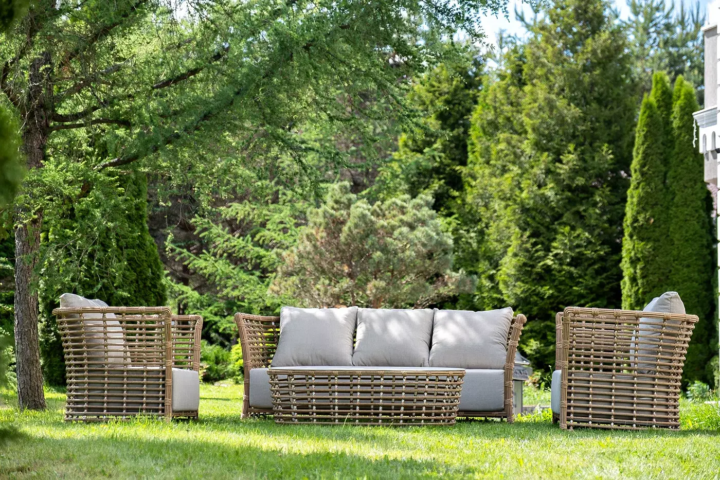 Плетеная мебель дополнена удобными подушками в бежевых чехлах. При их изготовлении используют полиэстер, плотность – 300гр/м2. Он обрабатывается влагоотталкивающей пропиткой для повышения защитных свойств материала.