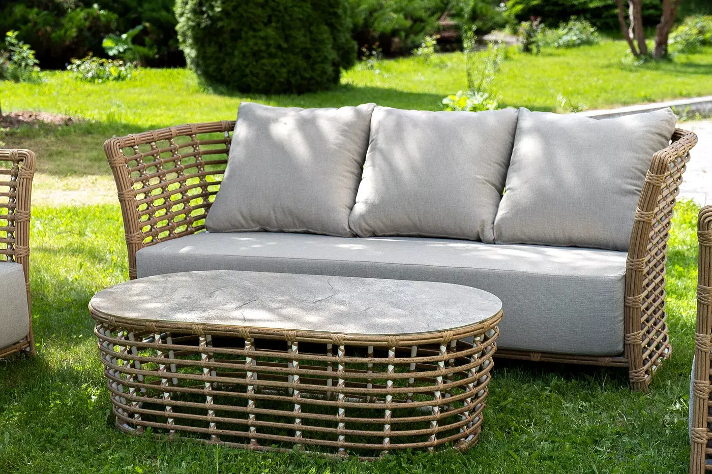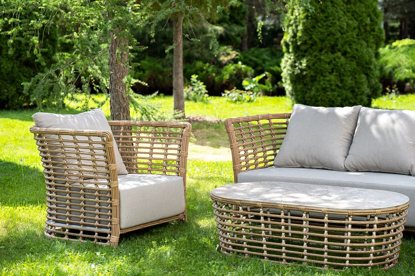 Модели имеют алюминиевый каркас, который оплетен вручную искусственным ротангом соломенного цвета.