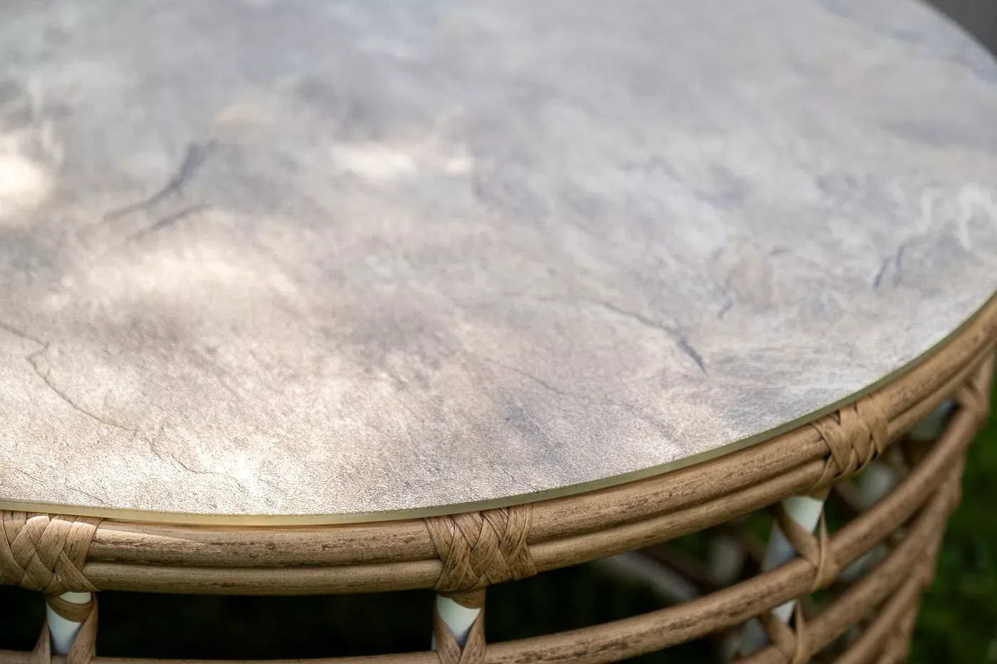 Журнальный столик выполнен из алюминия, вручную оплетенного круглым искусственным ротангом. Столешница из закаленного стекла толщиной 5 мм. Благодаря износостойким материалам, стол пригоден для использования на улице при любой погоде и не требует специальных условий хранения.