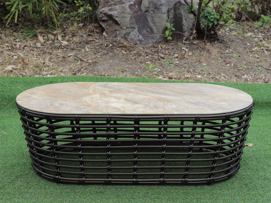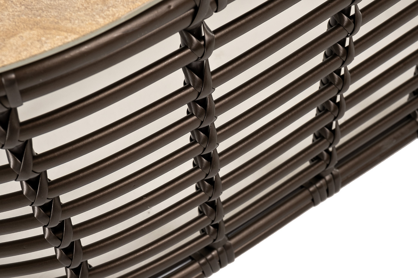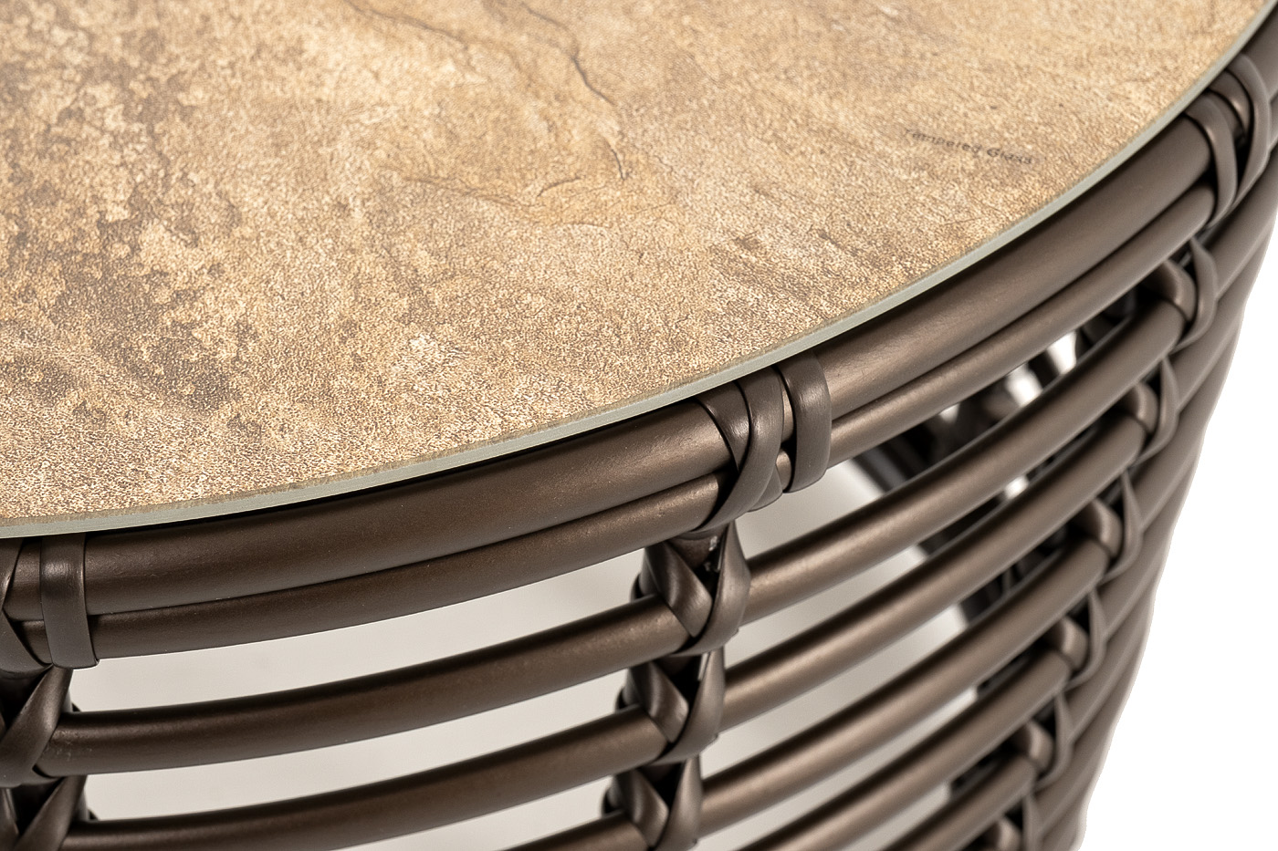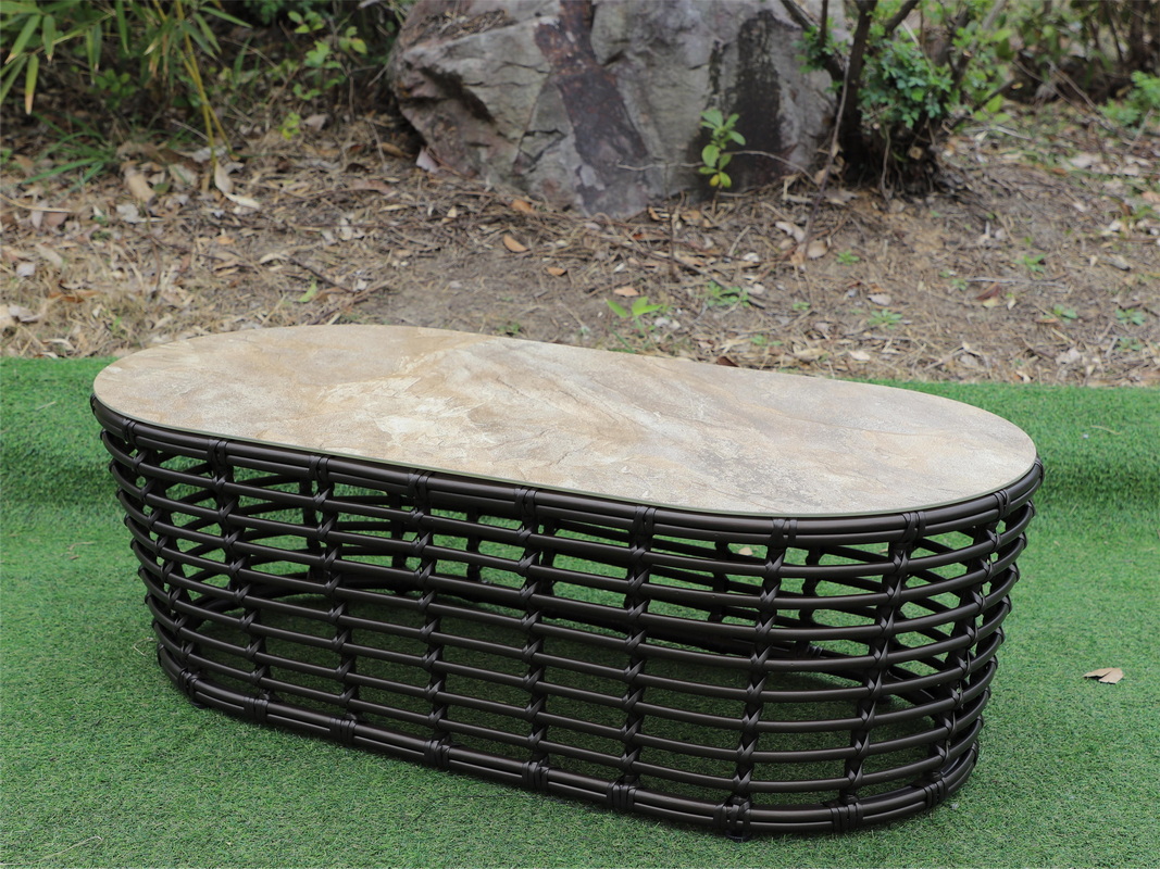 Каркас столика изготовлен из алюминия, вручную оплетенного круглым искусственным ротангом.