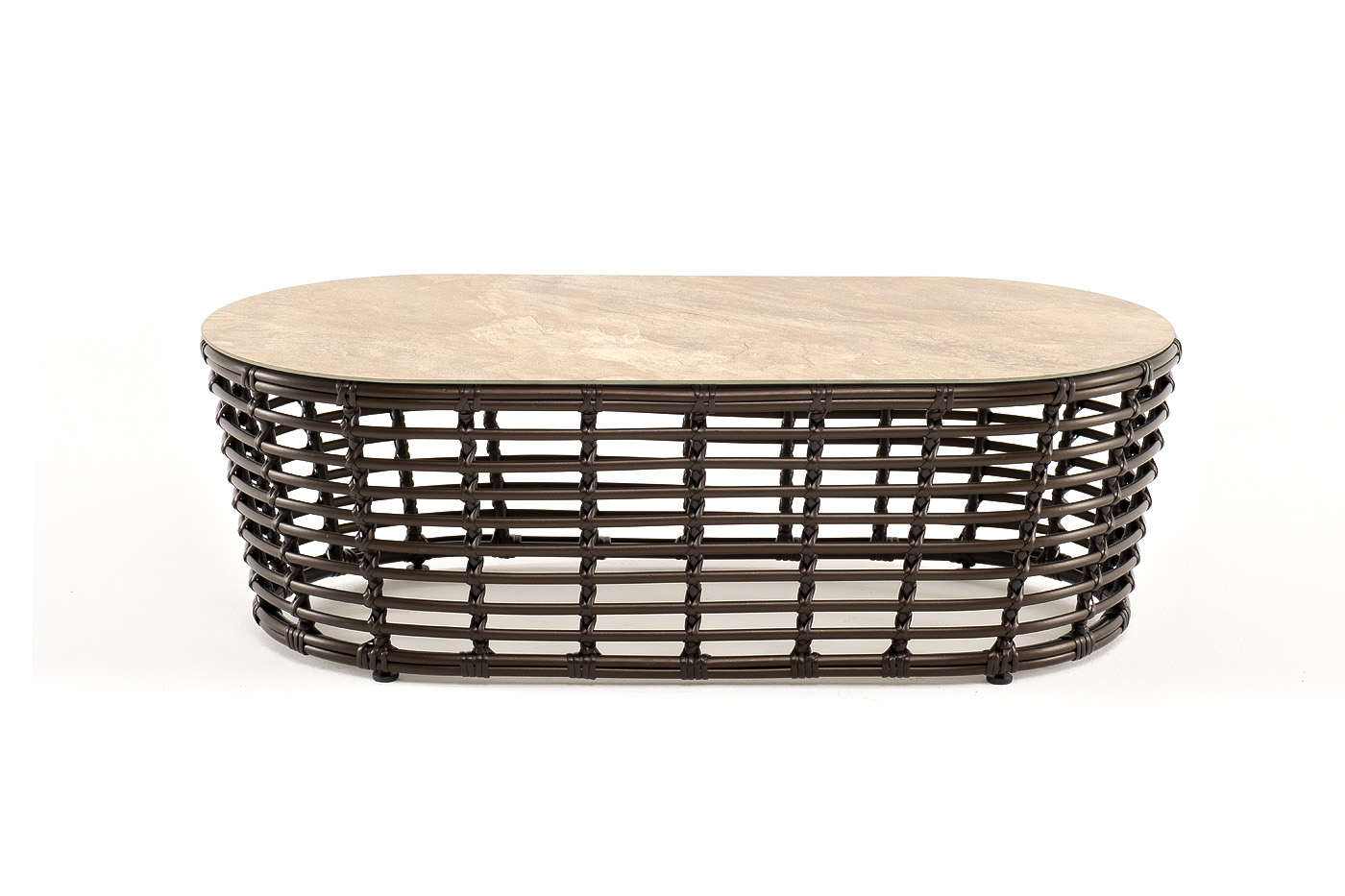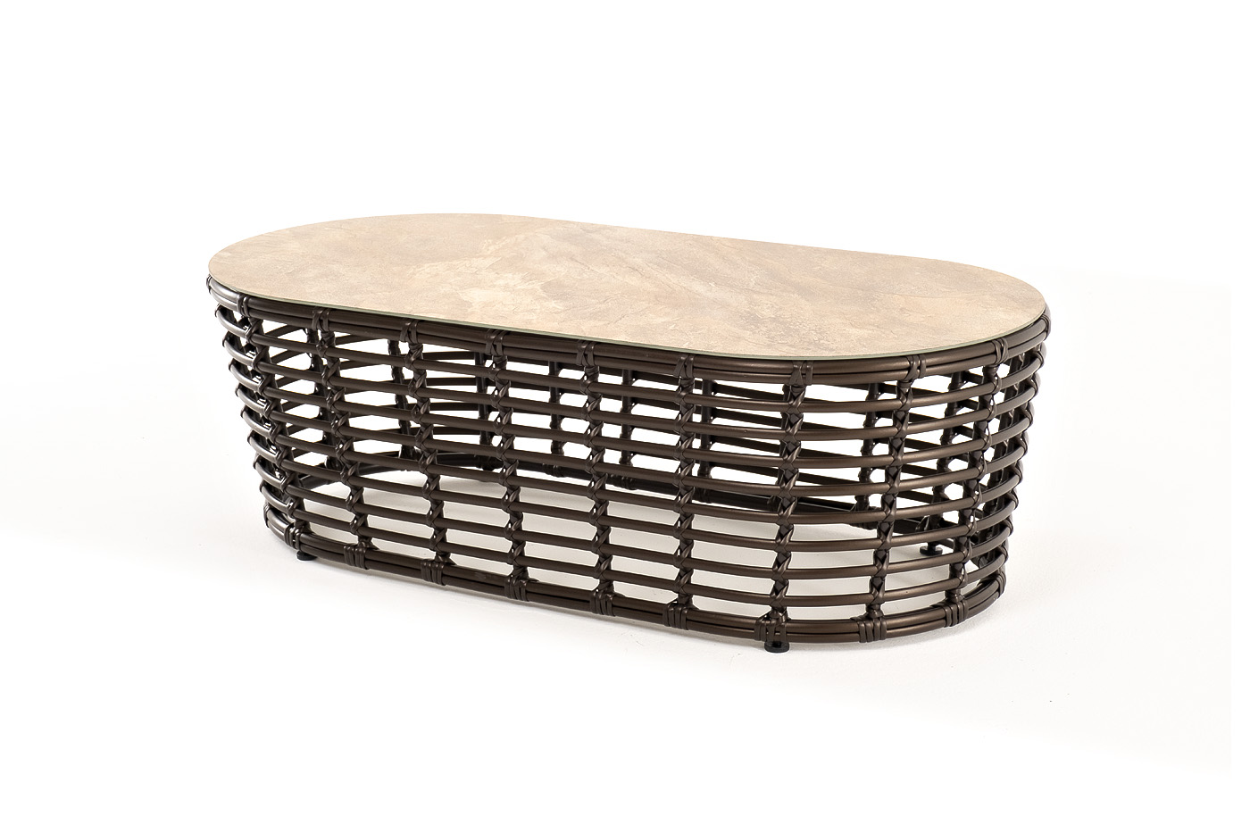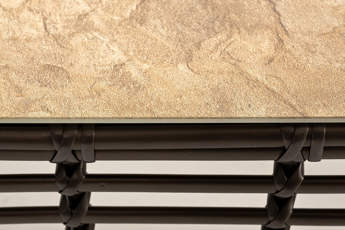 Каркас столика изготовлен из алюминия, вручную оплетенного круглым искусственным ротангом.