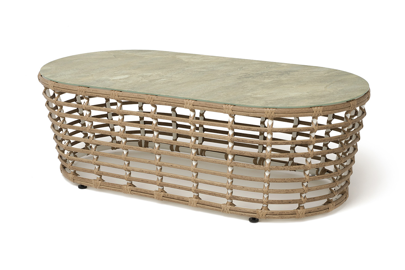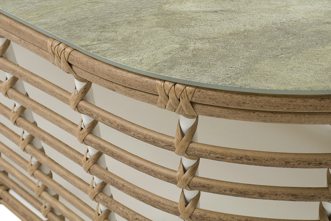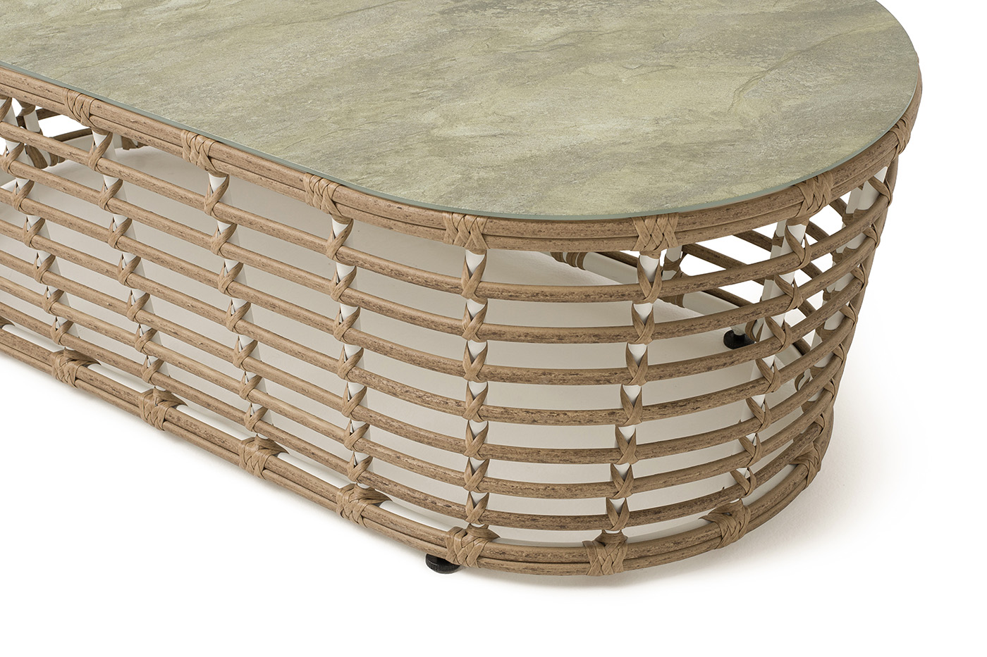 Каркас столика изготовлен из алюминия, вручную оплетенного круглым искусственным ротангом.