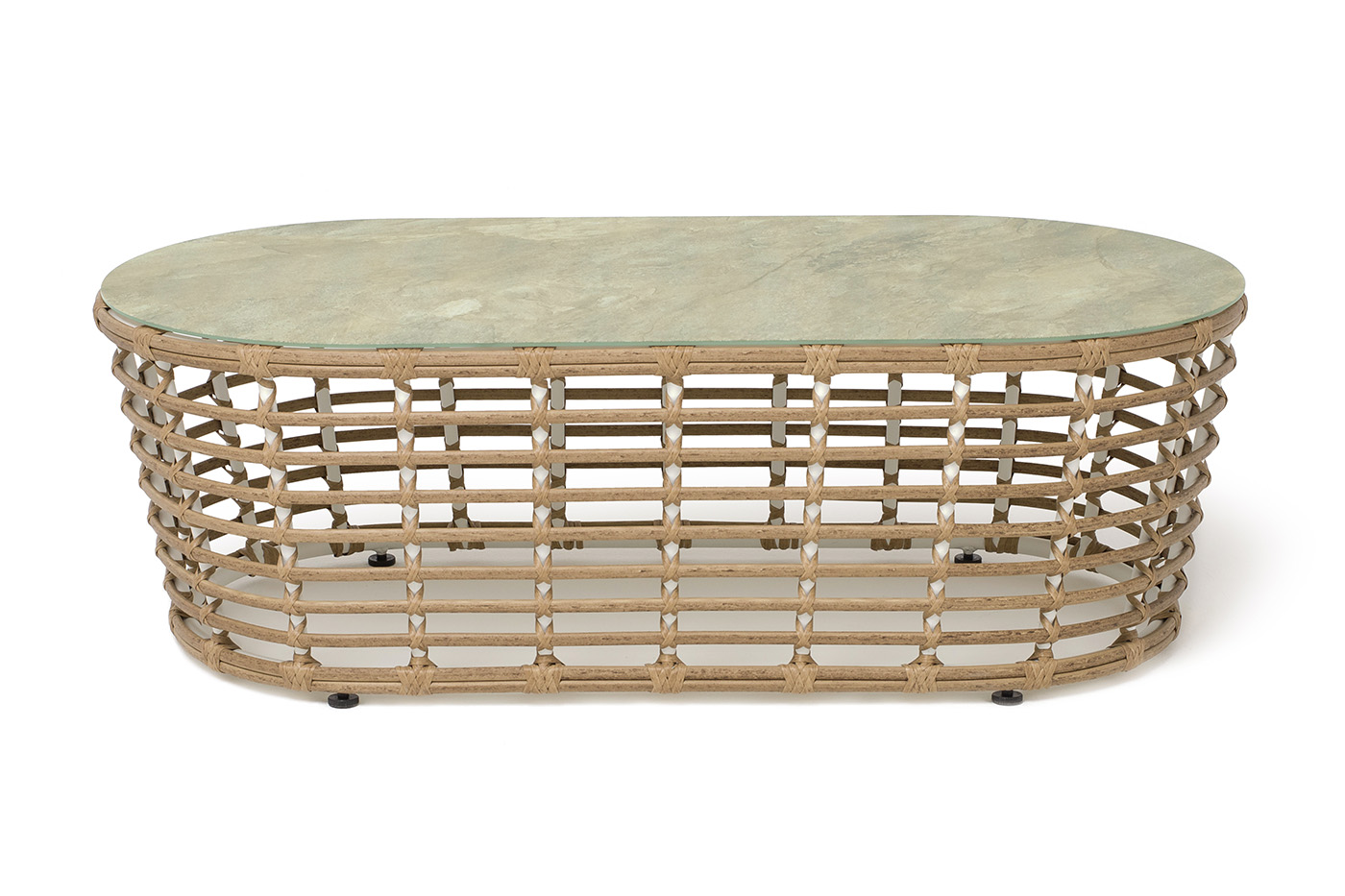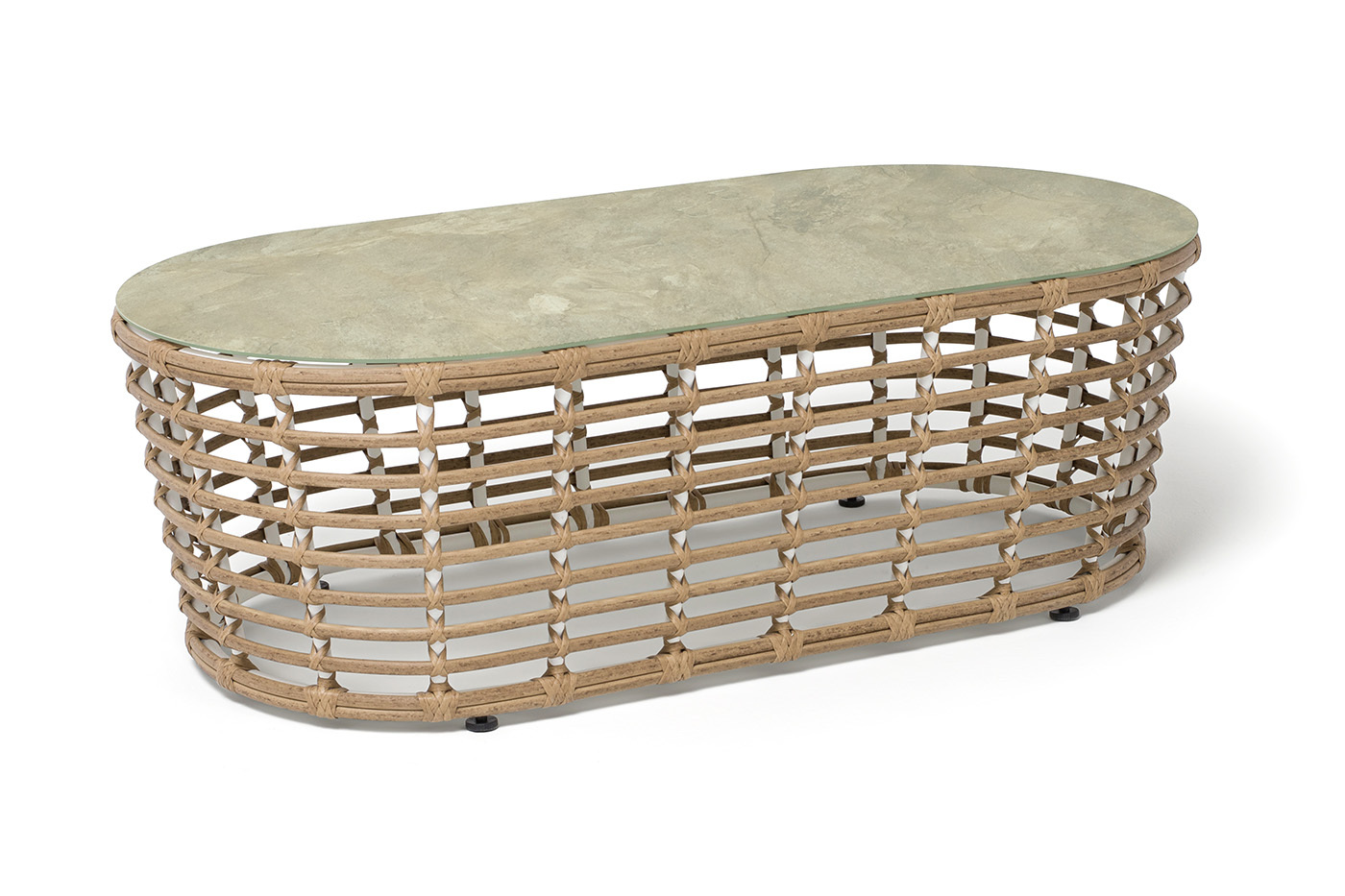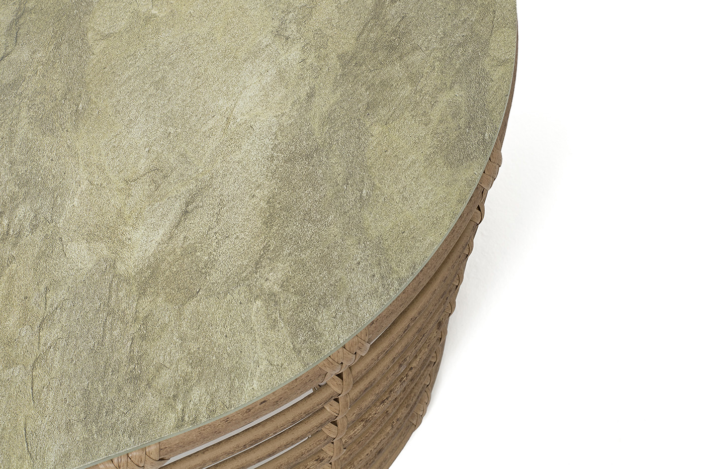Каркас столика изготовлен из алюминия, вручную оплетенного круглым искусственным ротангом.