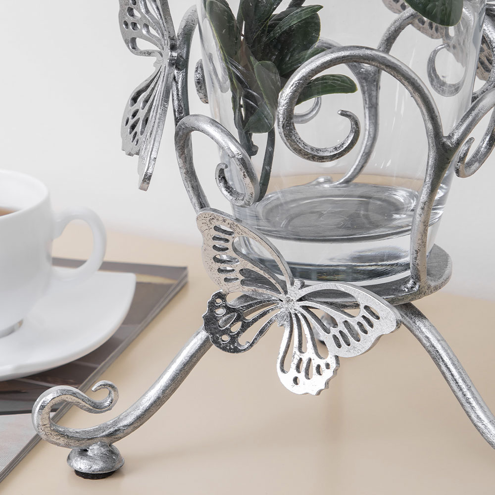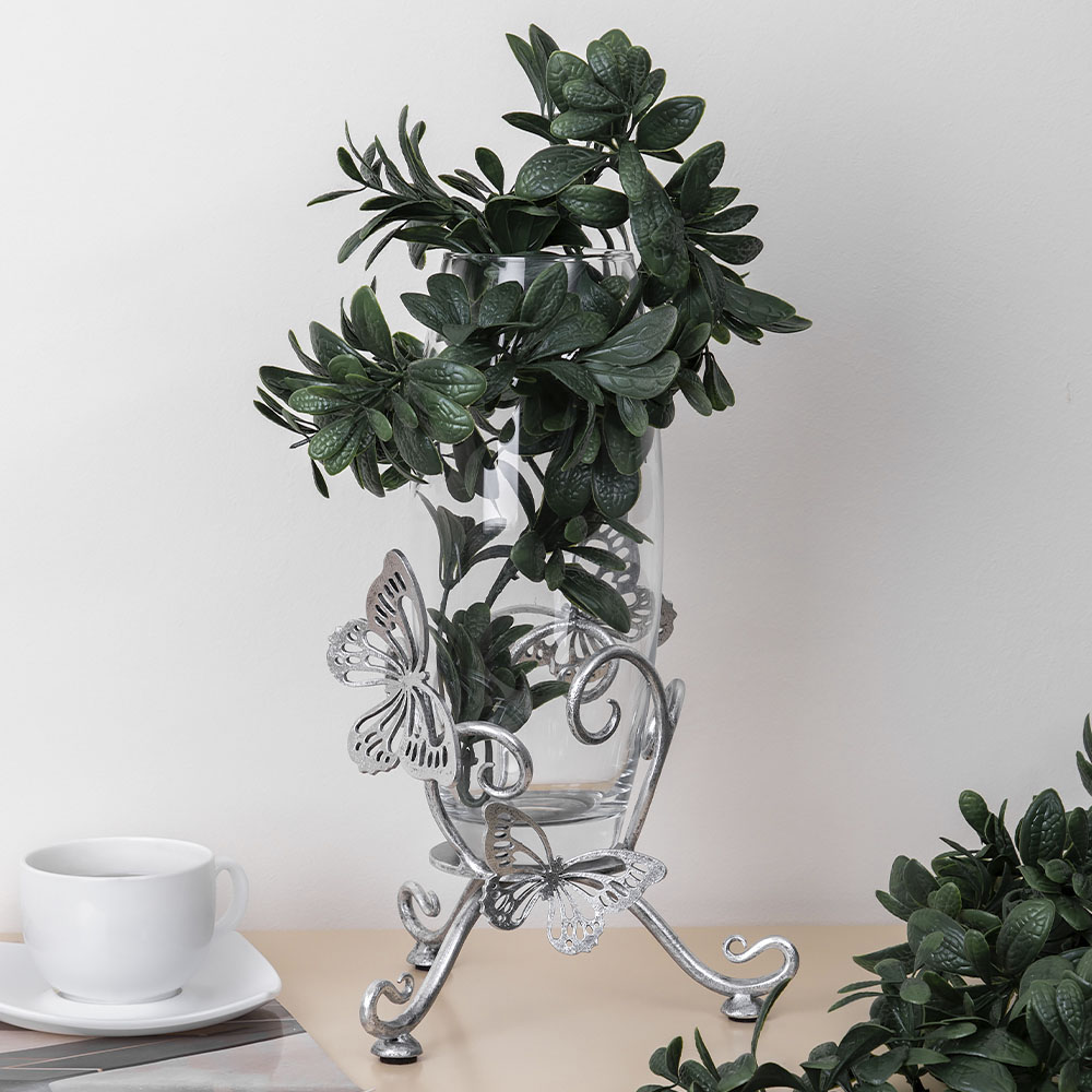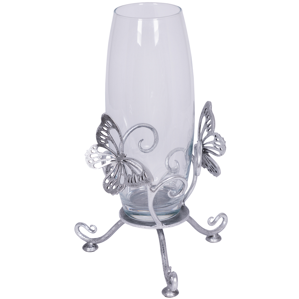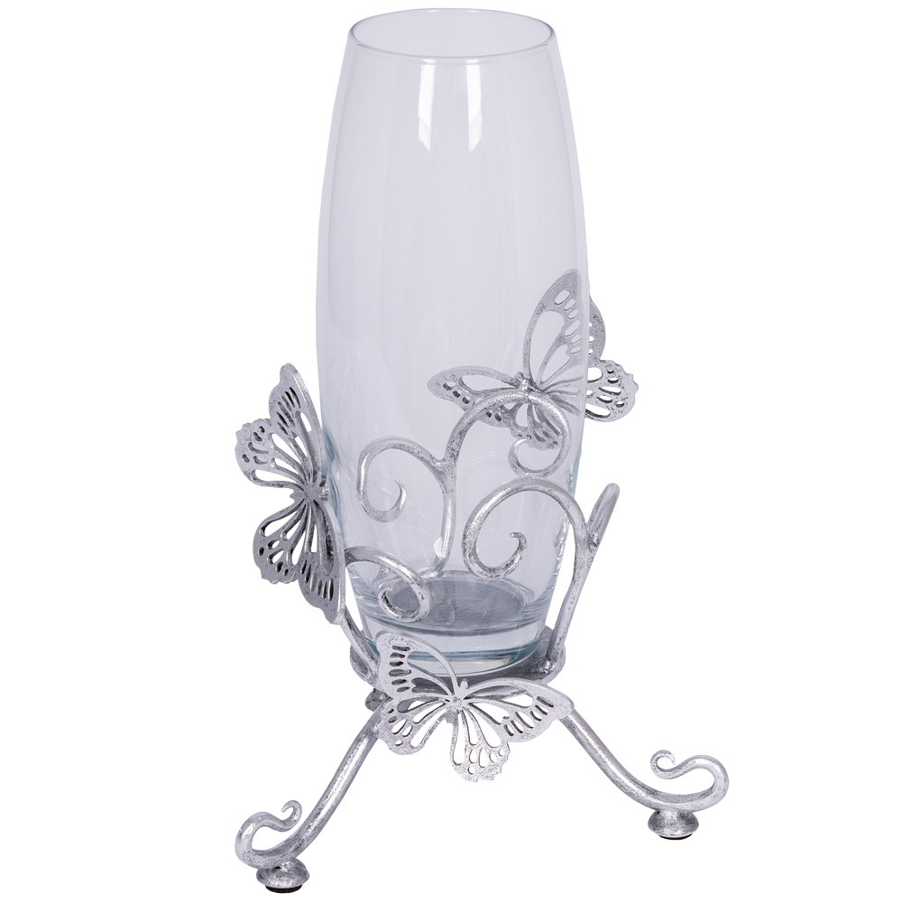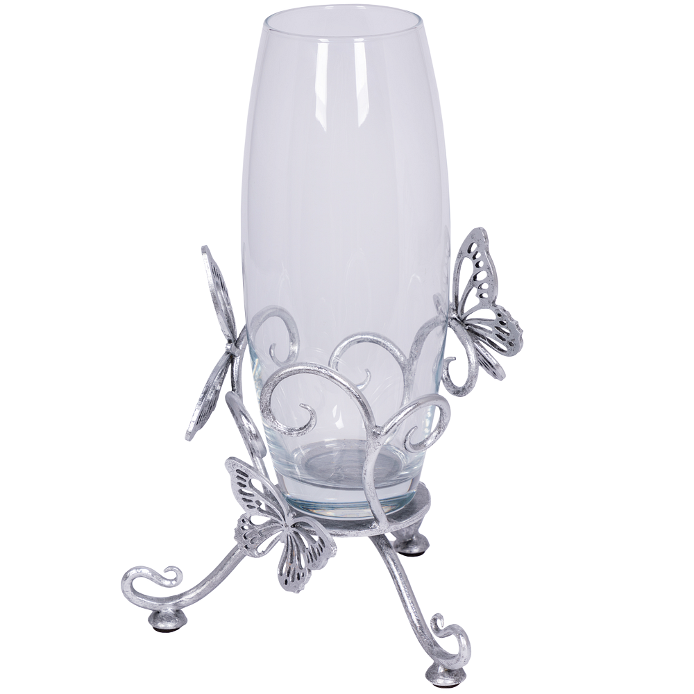 Классическая форма вазы Бабочка Эир. Серебристый цвет и необычное основание на широкой подставке привлекают внимание всех, кто видит интерьерные вазы BOGACHO. Эклектичный ансамбль придаёт изделию эксклюзивный шарм.Добавьте благородства своему интерьеру в классическом или современном стиле.Подставка вазы изготовлена из легированной стали, отшлифована и патинирована вручную.