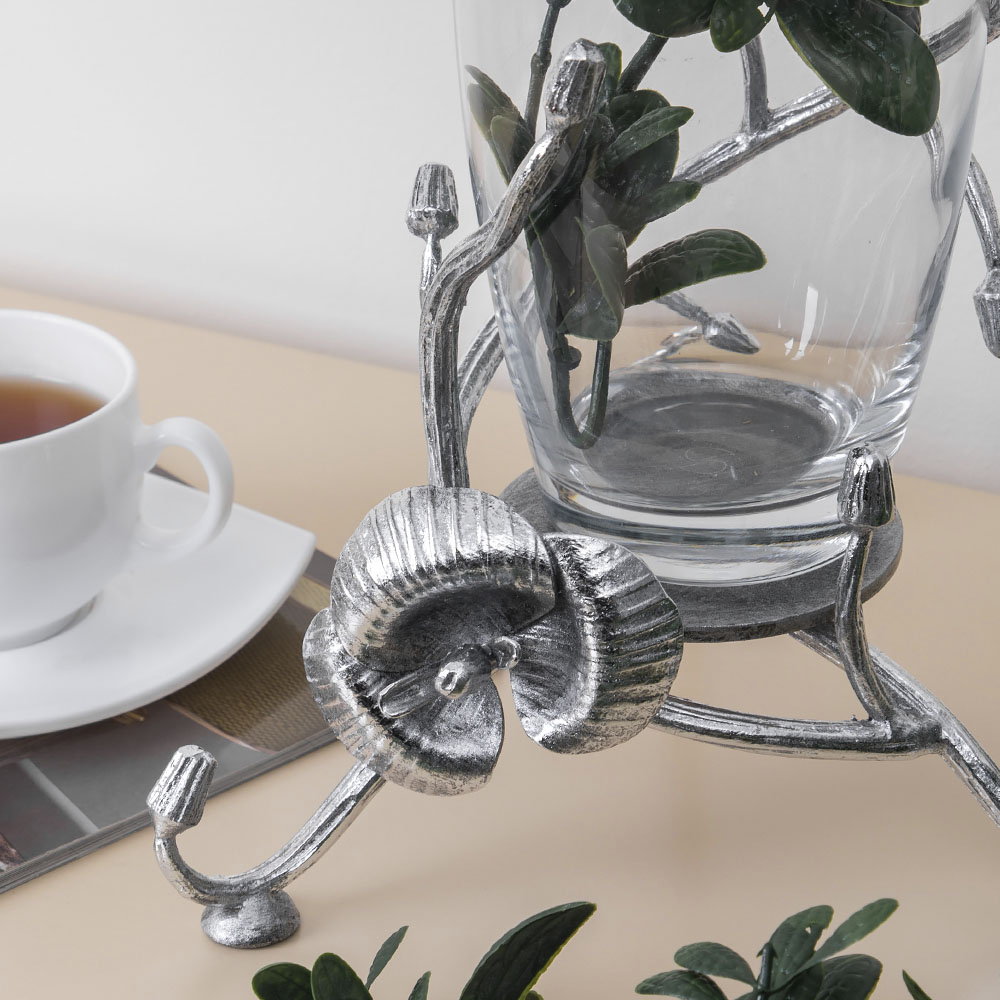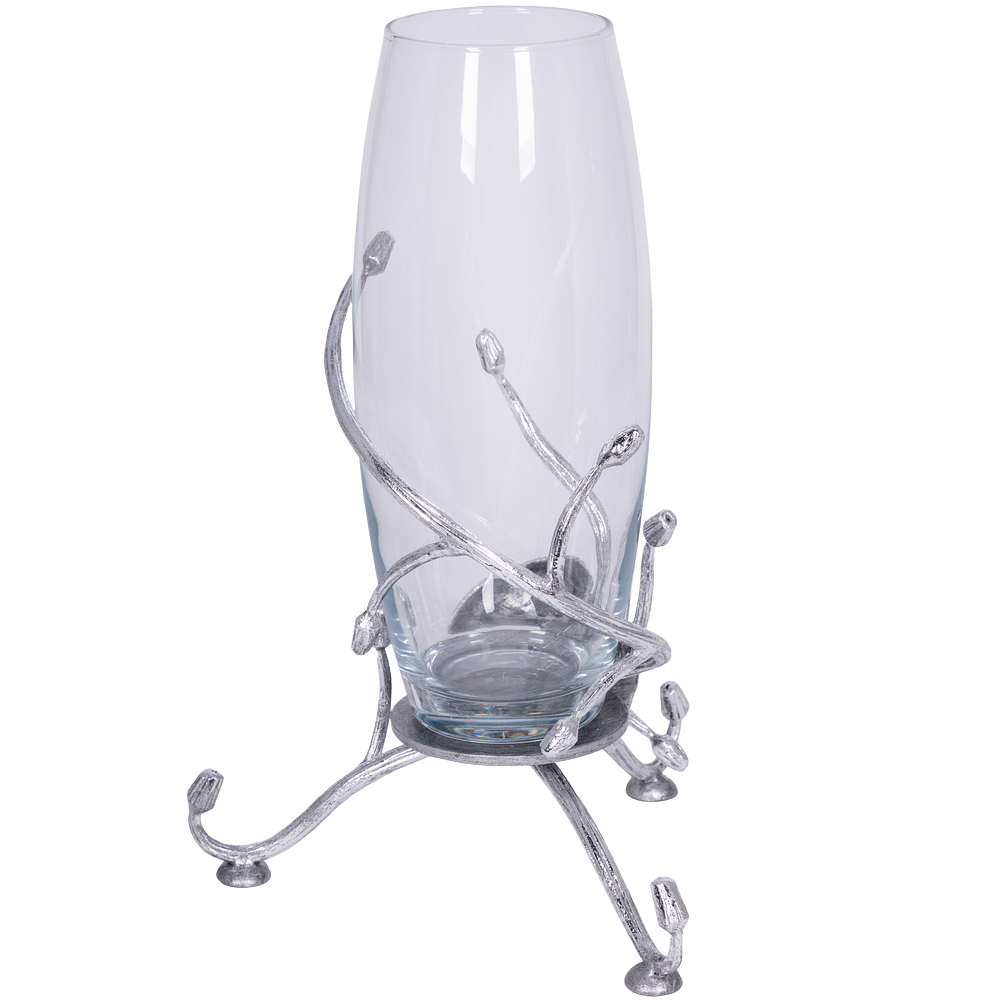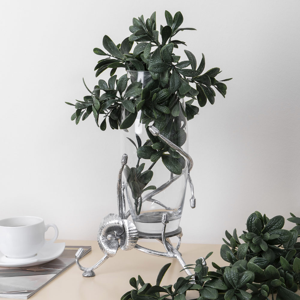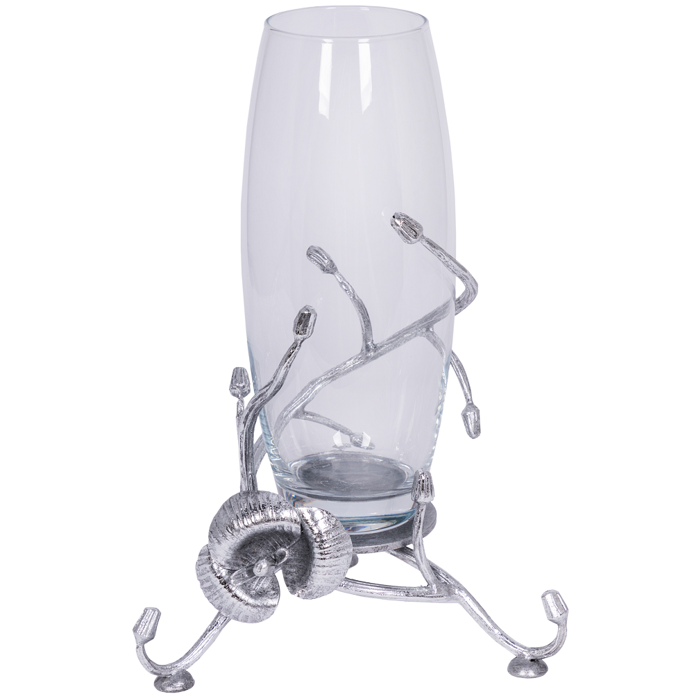 Классическая форма вазы Орхидея Найс. Серебристый цвет и необычное основание на широкой подставке привлекают внимание всех, кто видит интерьерные вазы BOGACHO. Эклектичный ансамбль придаёт изделию эксклюзивный шарм.Добавьте благородства своему интерьеру в классическом или современном стиле.Подставка вазы изготовлена из легированной стали, отшлифована и патинирована вручную.