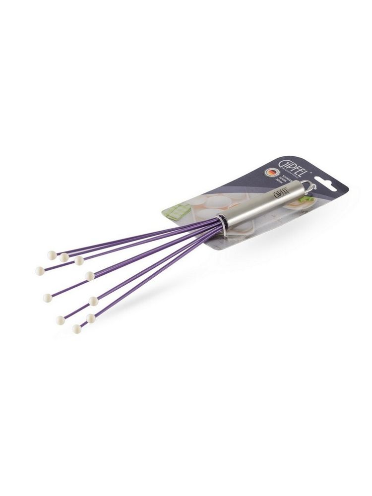 Венчик GIPFEL 9309. Размер венчика 30см. Венчик имеет оригинальное дизайнерское решение: его рабочая поверхность состоит из десяти пластиковых прутьев с шариками на концах. Его очень легко очищать от остатков взбиваемого продукта, будь то омлет, крем или тесто. Ручка сделана из нержавеющей стали. На ручке имеется петля для подвешивания аксессуара. Рабочая поверхность сделана из пластика и силикона.