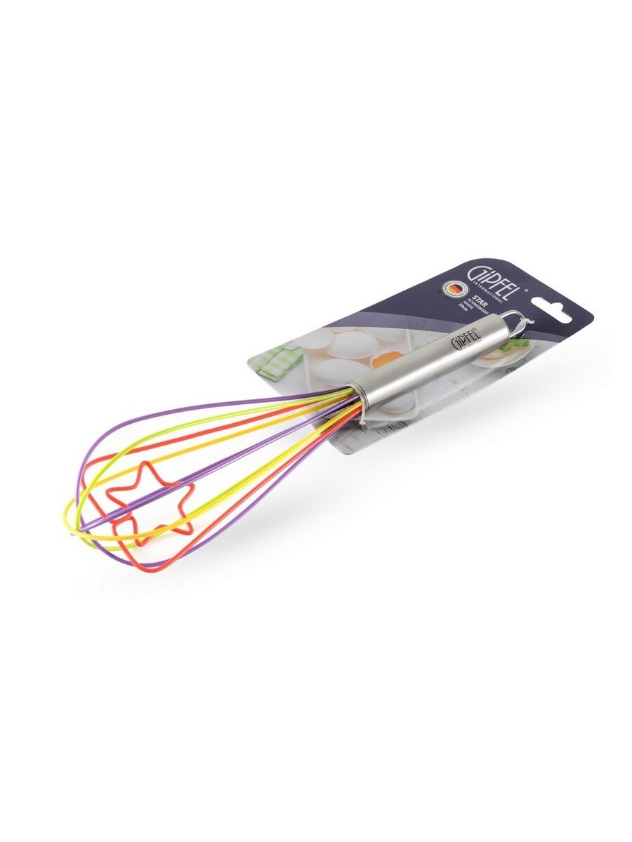 Венчик GIPFEL STAR 9310. Размер венчика 29см. Венчик прекрасно подойдет для взбивания омлета, белков, перемешивания теста, приготовления крема. Ручка сделана из нержавеющей стали. Венчик имеет оригинальное дизайнерское решение: его рабочая поверхность состоит из разноцветных силиконовых прутьев, формирующих внутри звездочку.