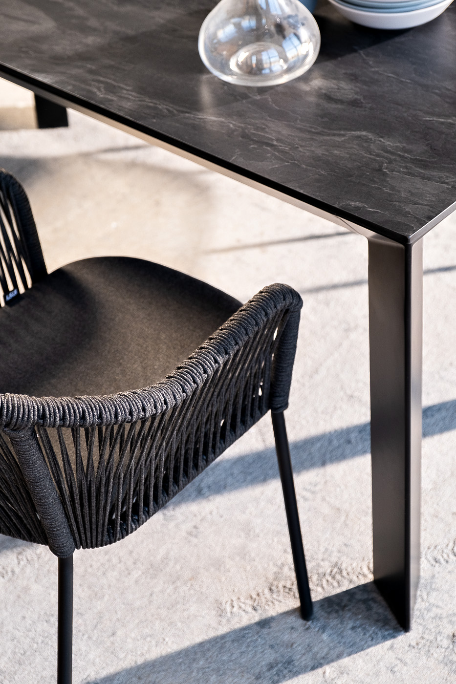 - 4 плетеных стульев «Лион» из роупа, размером - 570×620×820 мм, цвет роупа - темно-серый, каркас стальной, окрашен порошковой краской в темно-серый (RAL7024) оттенок.