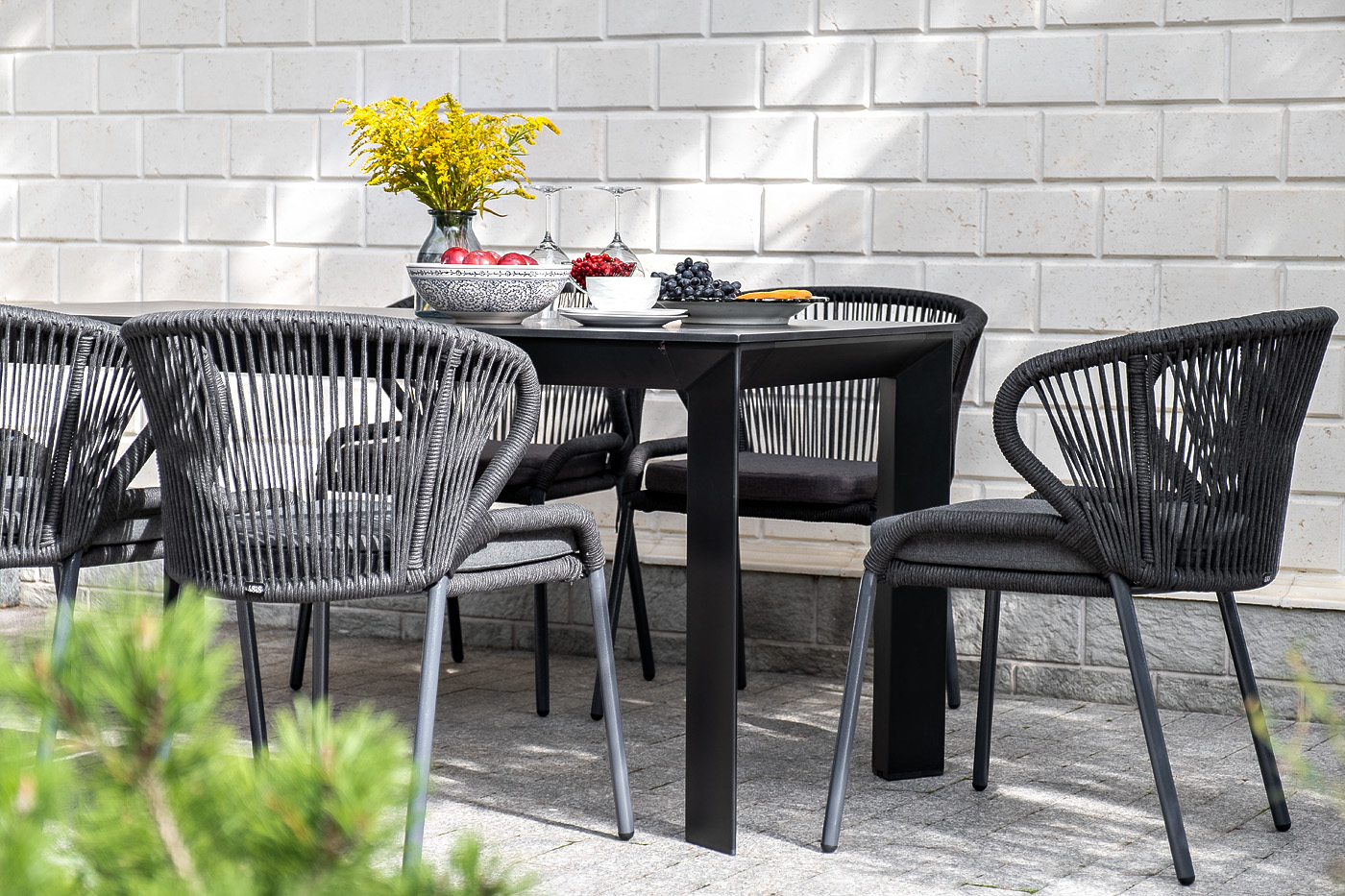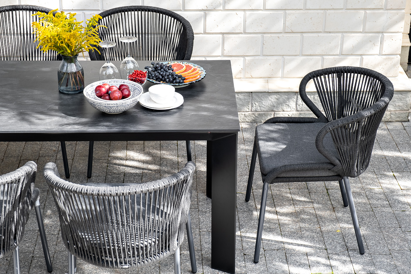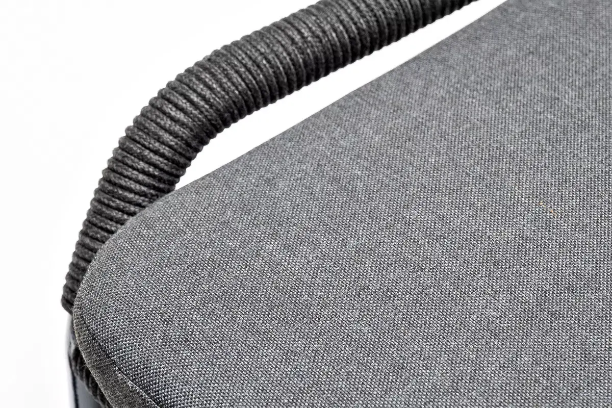Стулья «Милан» выполнены из роупа темно-серого цвета, который гармонируют с общим дизайном комплекта. Размер каждого стула составляет 570×620×795 мм. Каркас из алюминия придает стульям легкость и прочность, а порошковое окрашивание защищает металл от коррозии и увеличивает срок службы мебели.