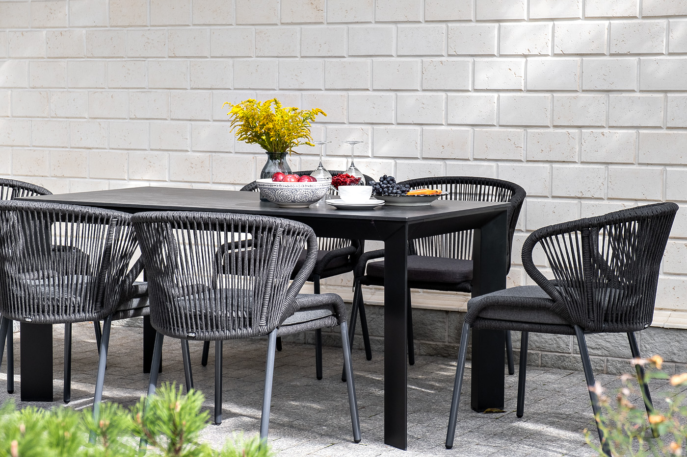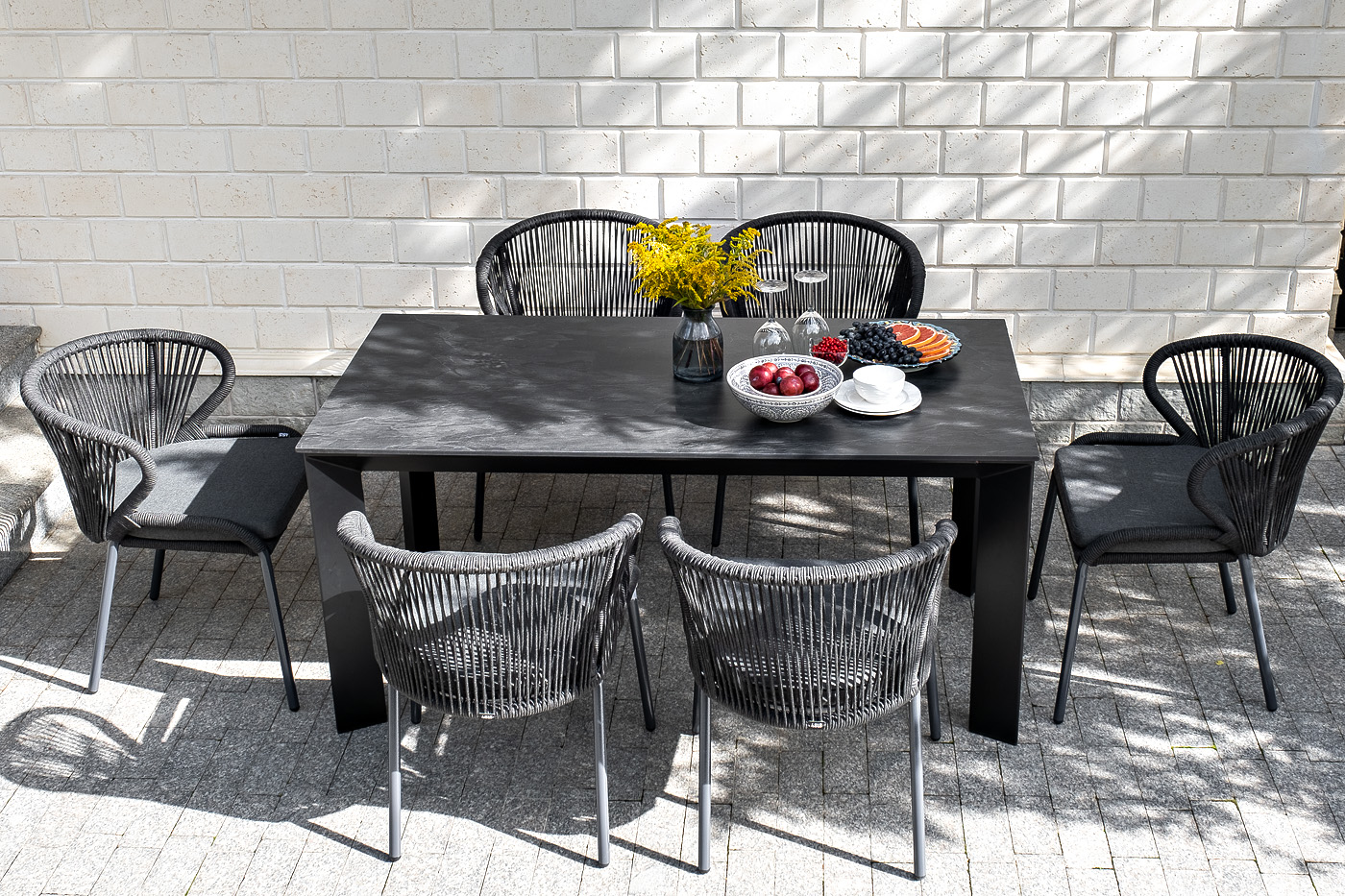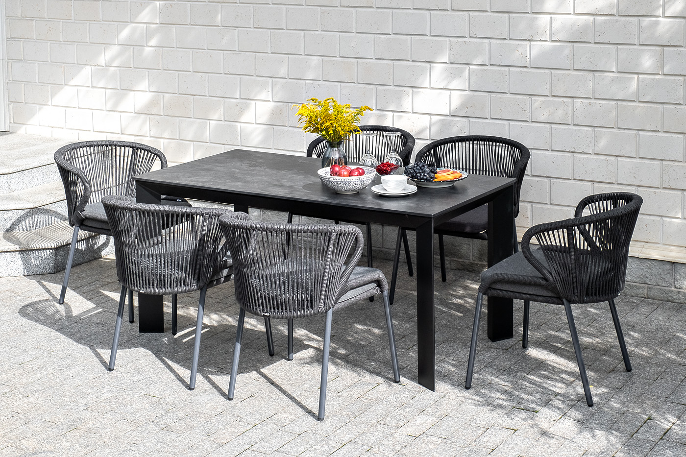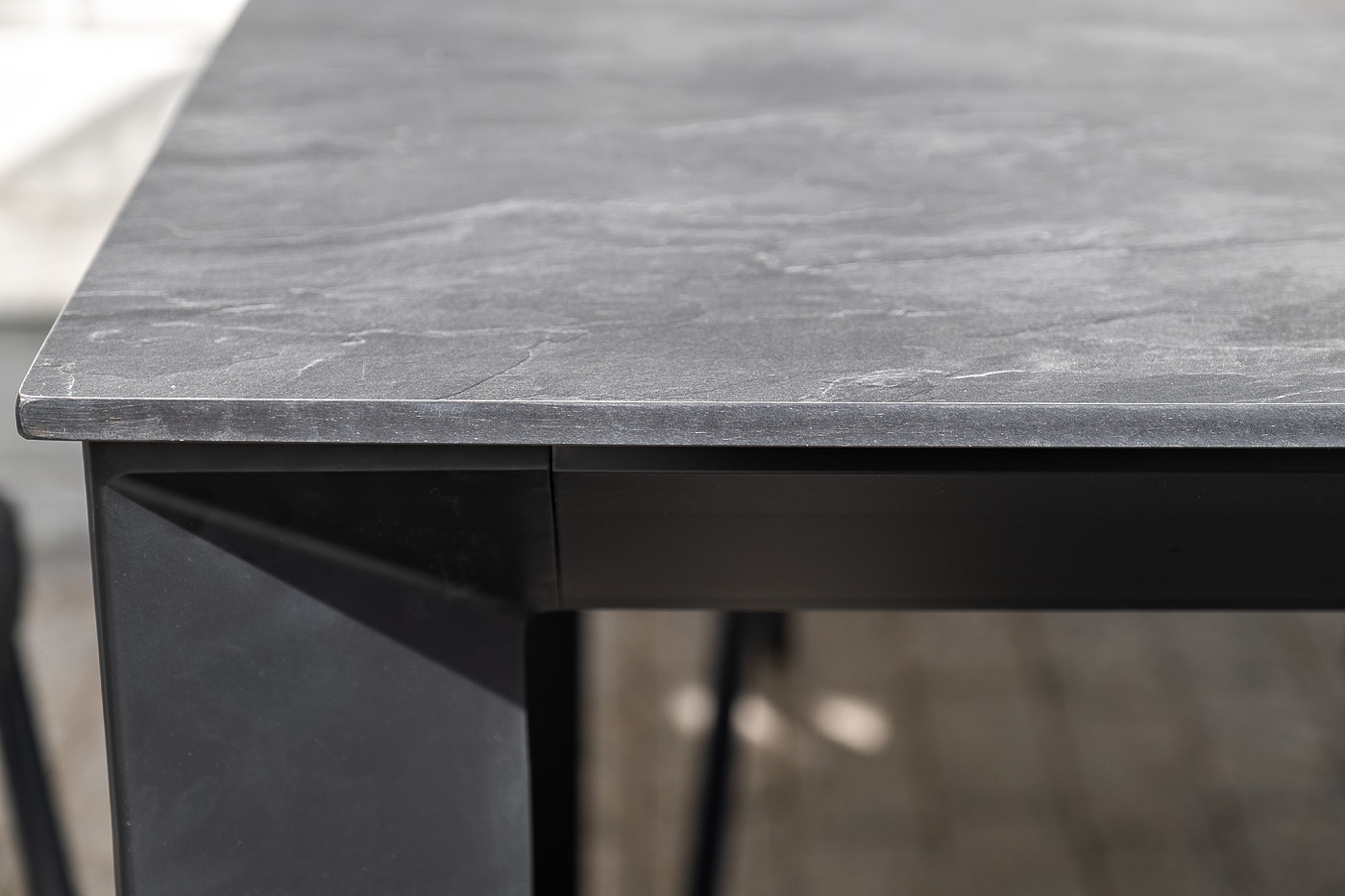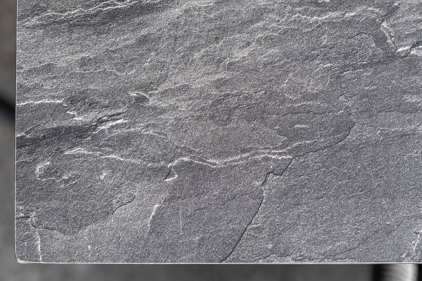 Столешница выполнена из современного высококачественного монолитного компакт-пластик HPL, толщиной 12 мм в цвете «серый гранит». Материал устойчив к высоким температурам, попаданию влаги и может использоваться как в помещении, так и на открытом пространстве. Подстолье изготовлено из крашеного алюминия черного цвета.
