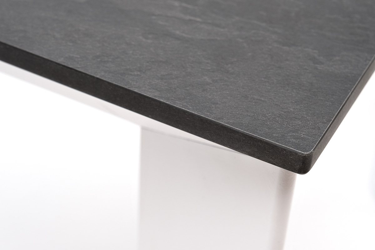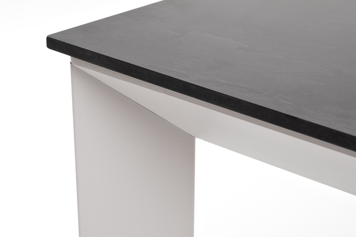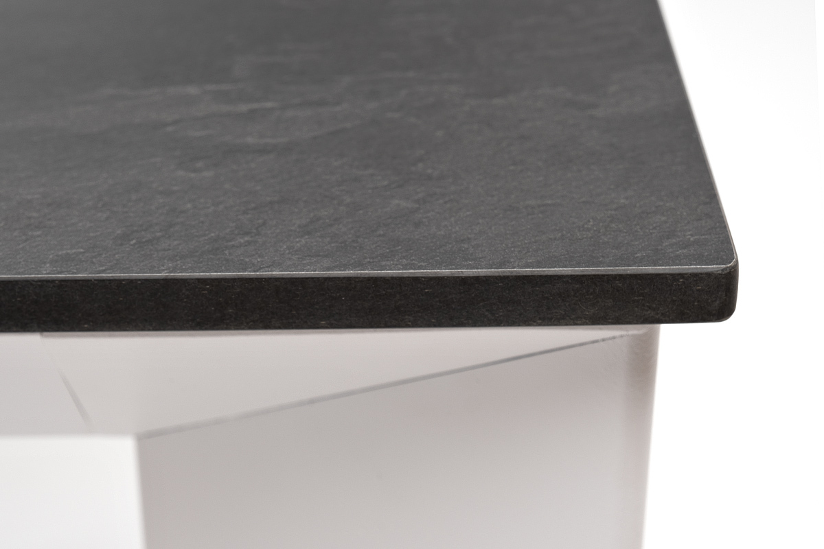 Столешница выполнена из современного высококачественного монолитного компакт-пластик HPL, толщиной 12 мм в цвете «серый гранит». Материал устойчив к высоким температурам, попаданию влаги и может использоваться как в помещении, так и на открытом пространстве. Подстолье изготовлено из крашеного алюминия белого цвета.