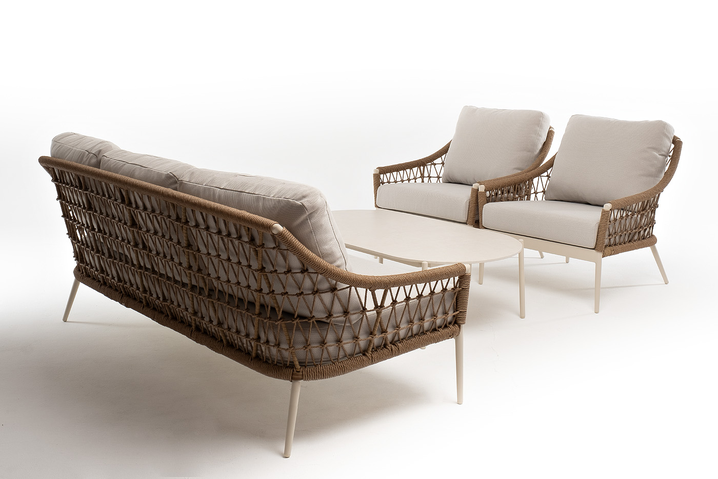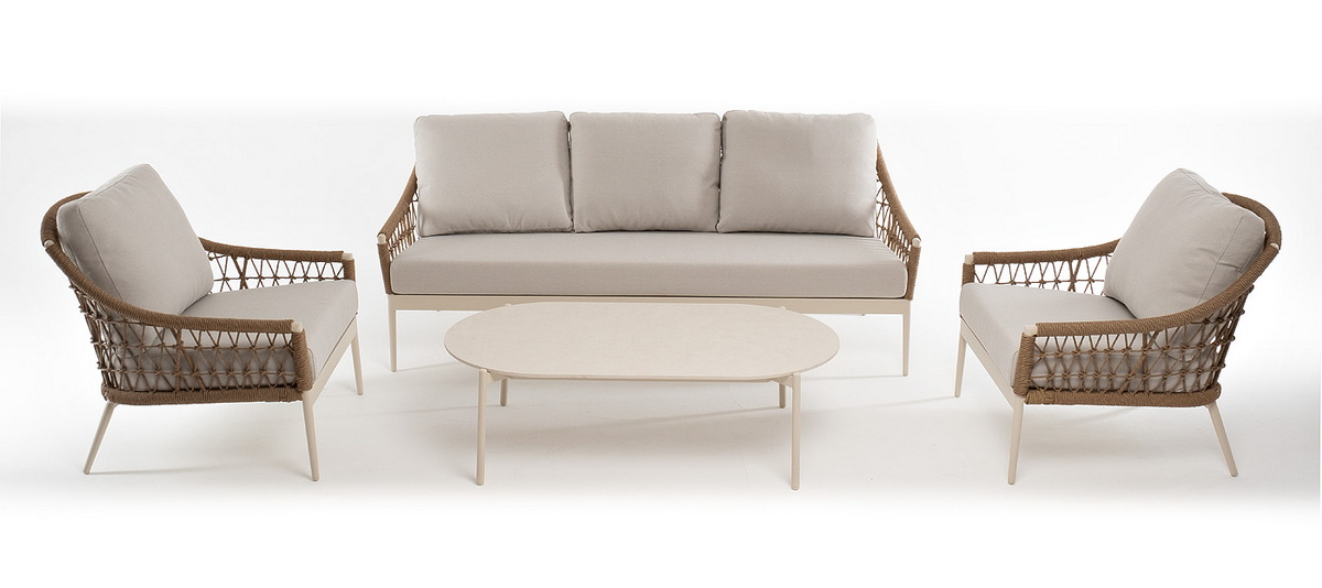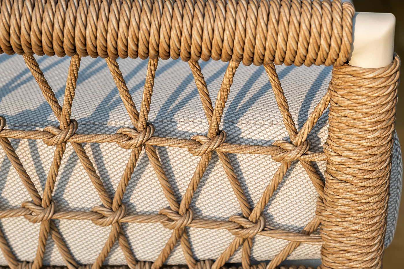 Модели имеют алюминиевый каркас, который оплетен вручную искусственным ротангом натурального соломенного цвета.