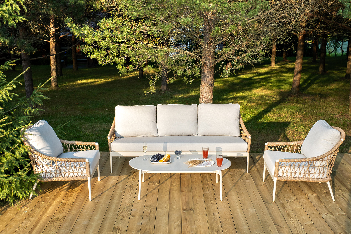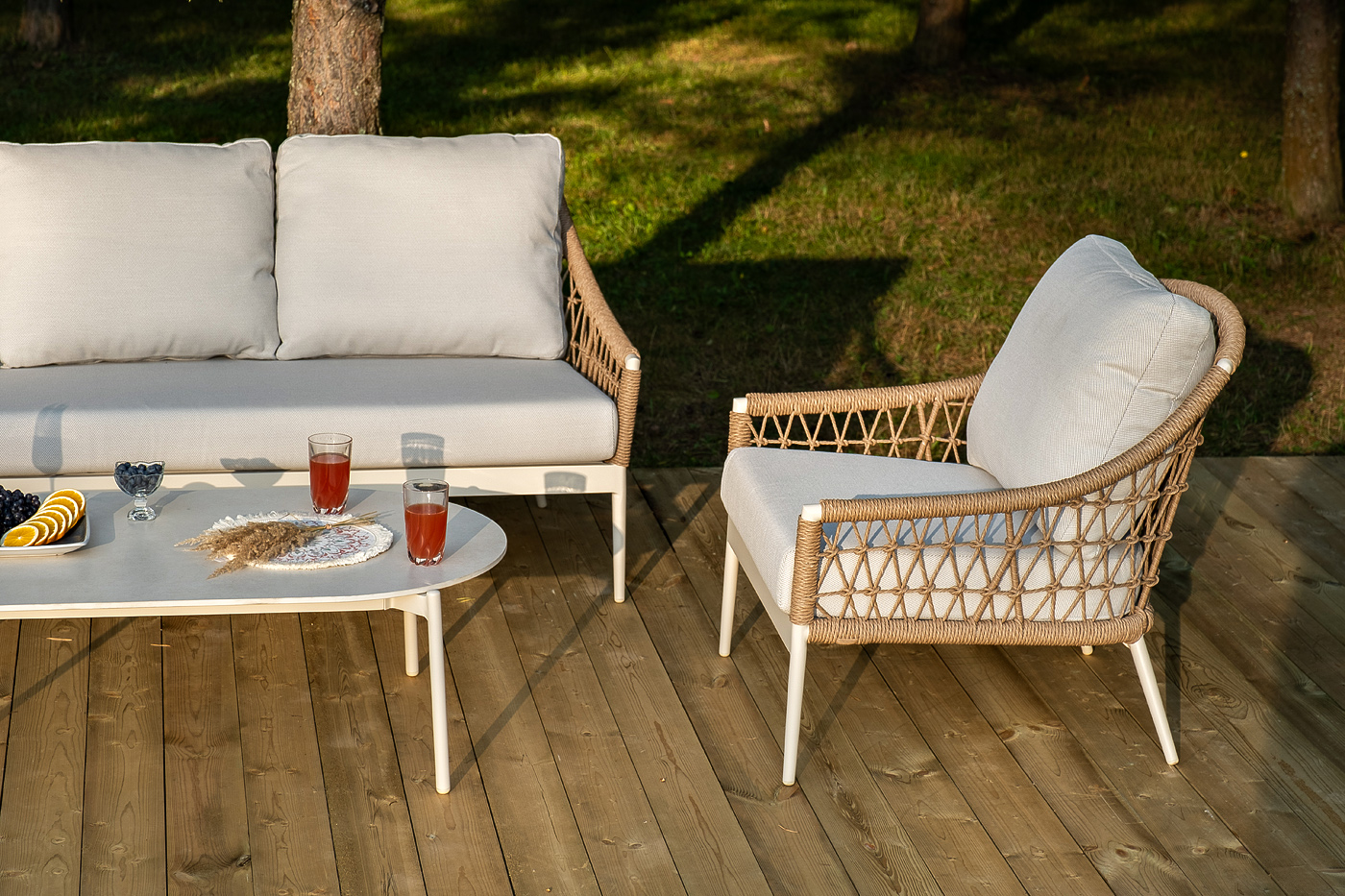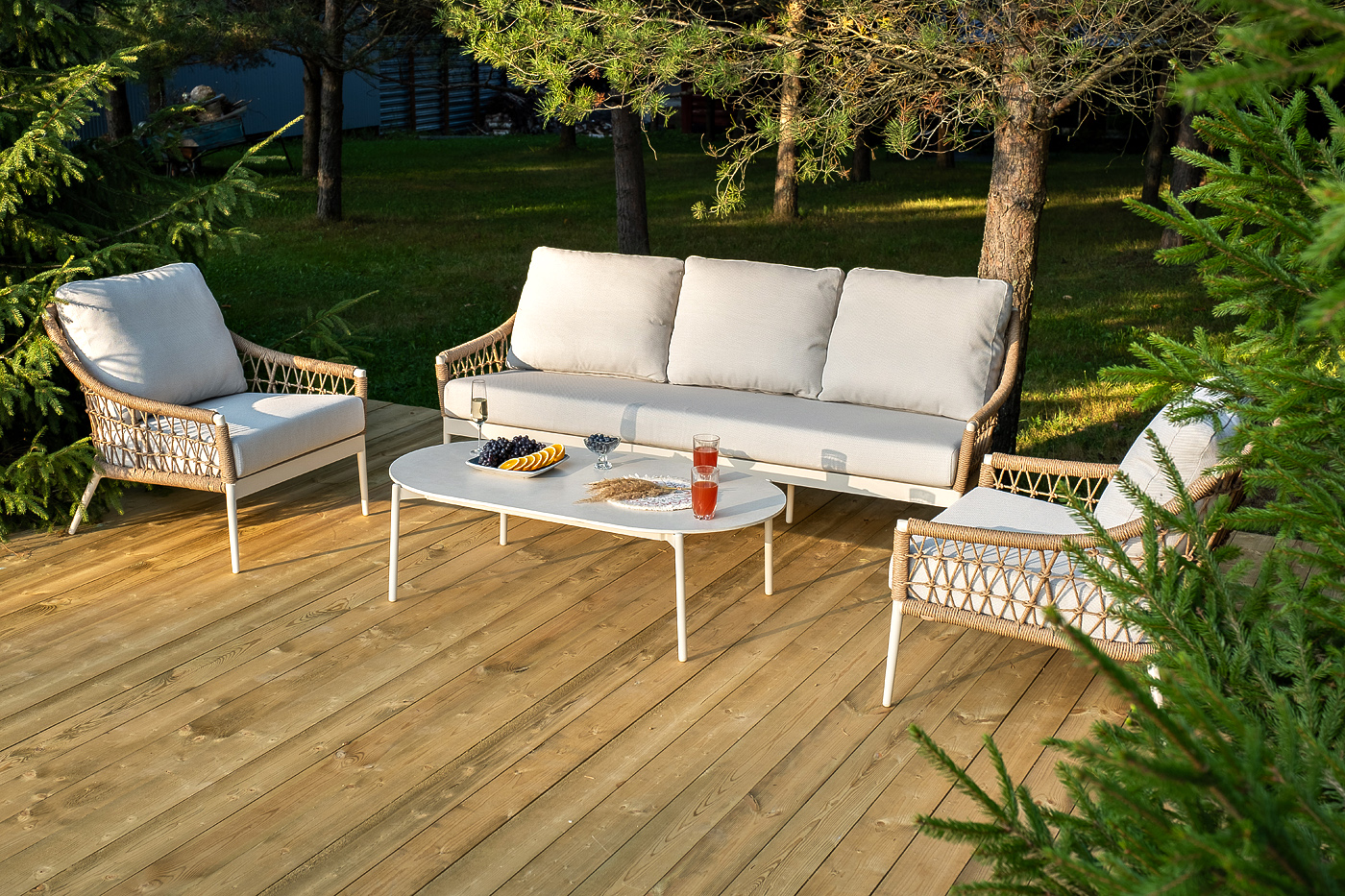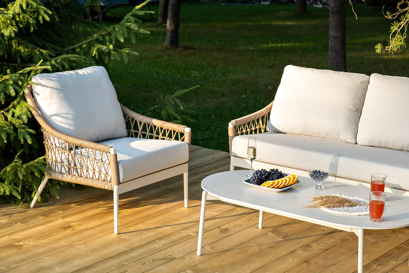 Плетеная мебель дополнена удобными подушками в бежевых чехлах. При их изготовлении используют полиэстер, плотность – 300гр/м2. Он обрабатывается влагоотталкивающей пропиткой для повышения защитных свойств материала.