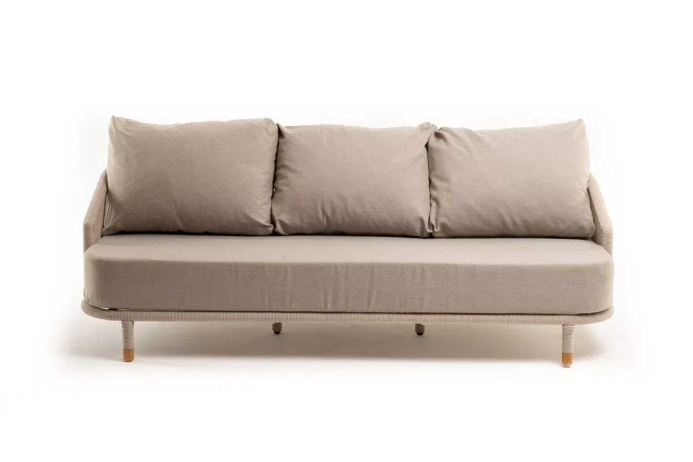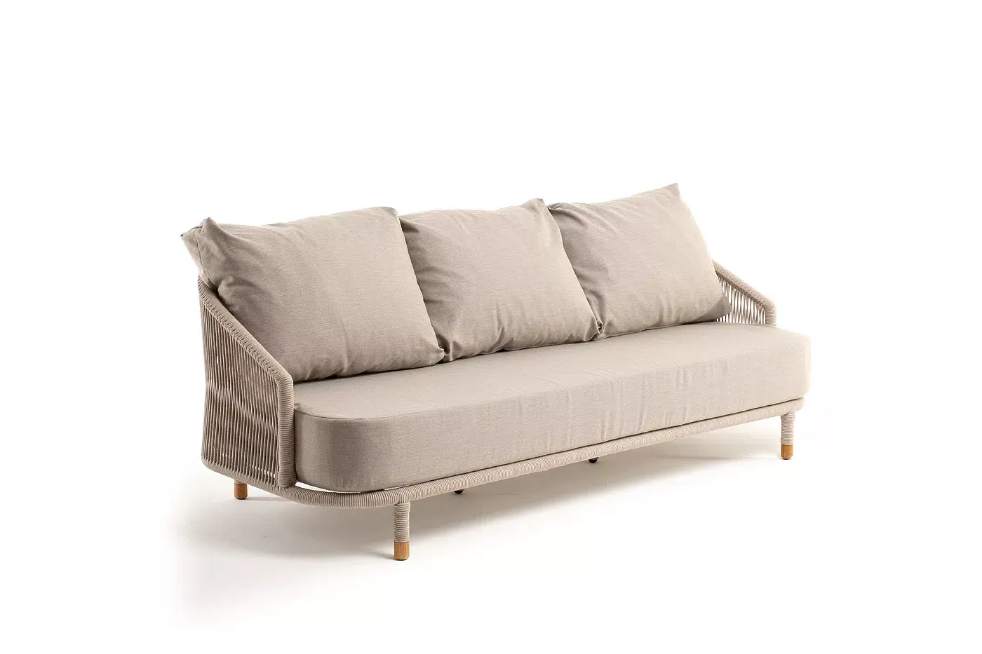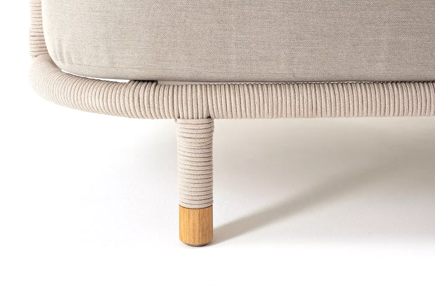 Диван имеет алюминиевый каркас, окрашенный порошковой краской в белый цвет. Боковины каркаса и спинка вручную оплетены роупом - эластичными синтетическими лентами, изготовленными из высокопрочных полиэфирных волокон. Цвет оплетки в тон каркасу - бежевый. На ножках дивана идут дубовые наконечники (заглушки).