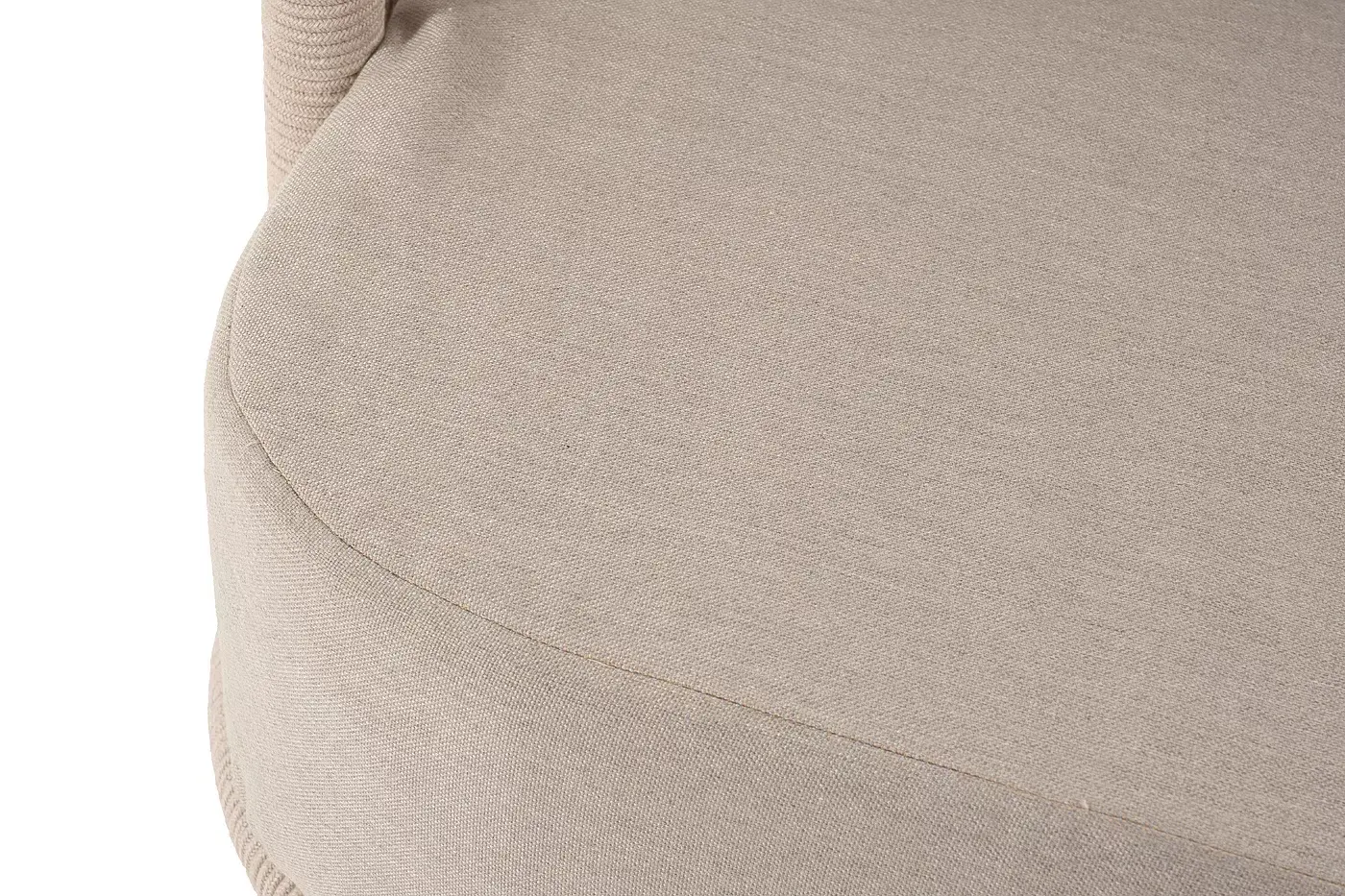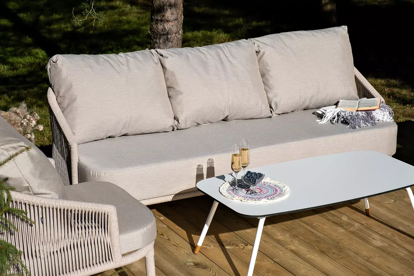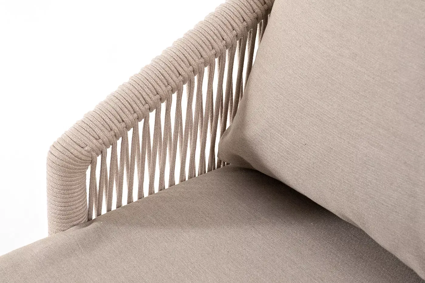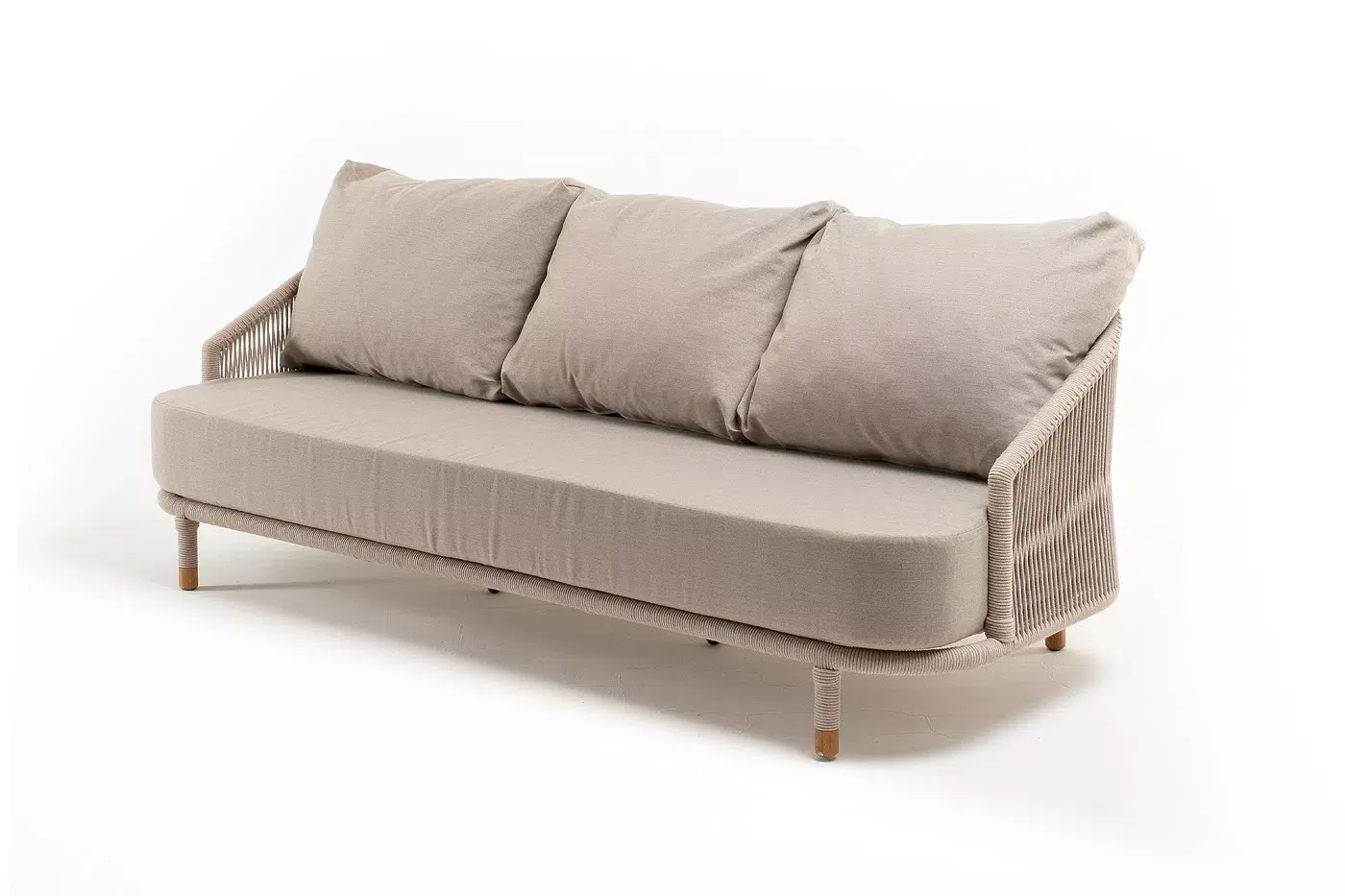 Диван имеет алюминиевый каркас, окрашенный порошковой краской в белый цвет. Боковины каркаса и спинка вручную оплетены роупом - эластичными синтетическими лентами, изготовленными из высокопрочных полиэфирных волокон. Цвет оплетки в тон каркасу - бежевый. На ножках дивана идут дубовые наконечники (заглушки).