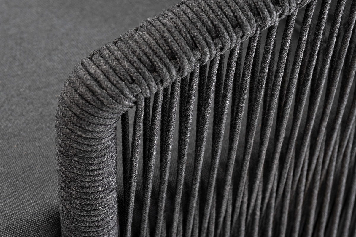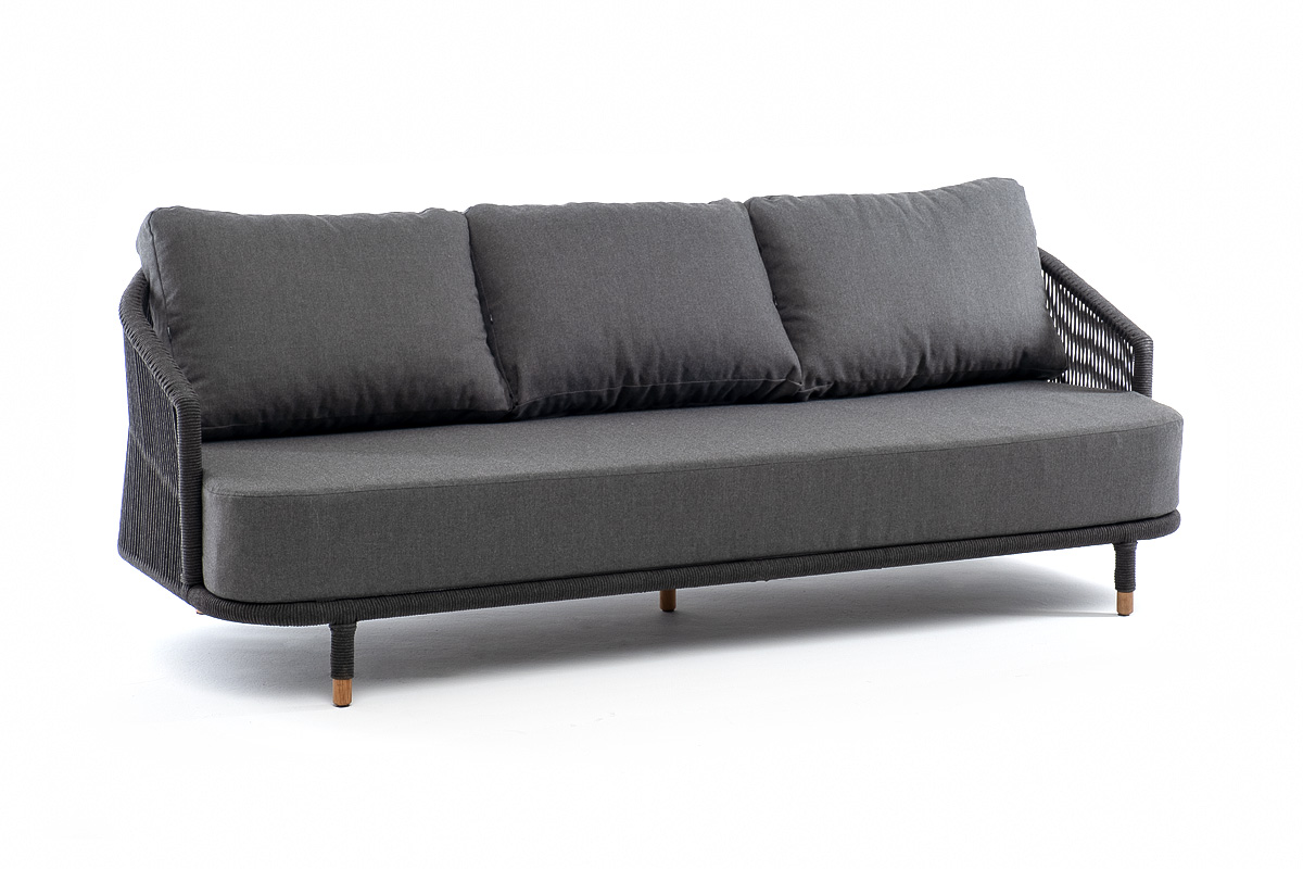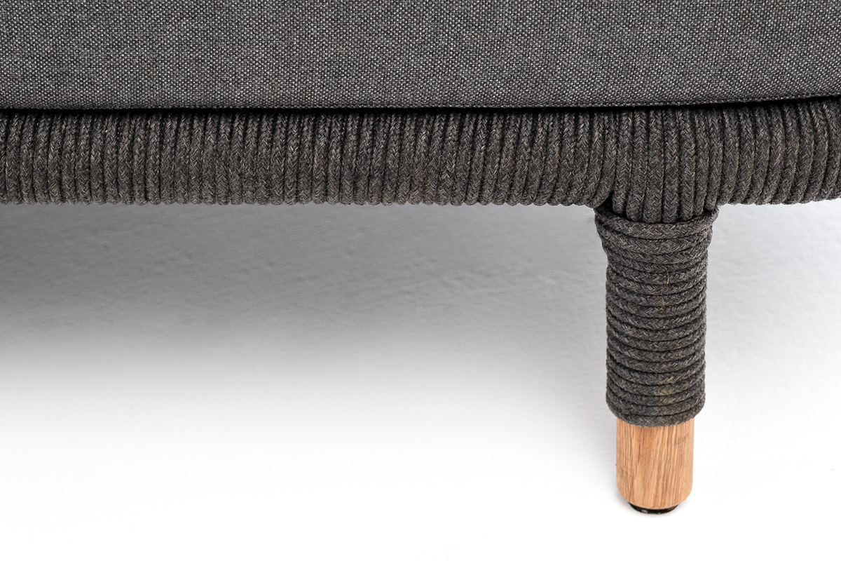 Диван имеет алюминиевый каркас, окрашенный порошковой краской в темно-серый (RAL7024) цвет. Боковины каркаса и спинка вручную оплетены роупом - эластичными синтетическими лентами, изготовленными из высокопрочных полиэфирных волокон. Цвет оплетки в тон каркасу - темно-серый. На ножках дивана идут дубовые наконечники (заглушки).