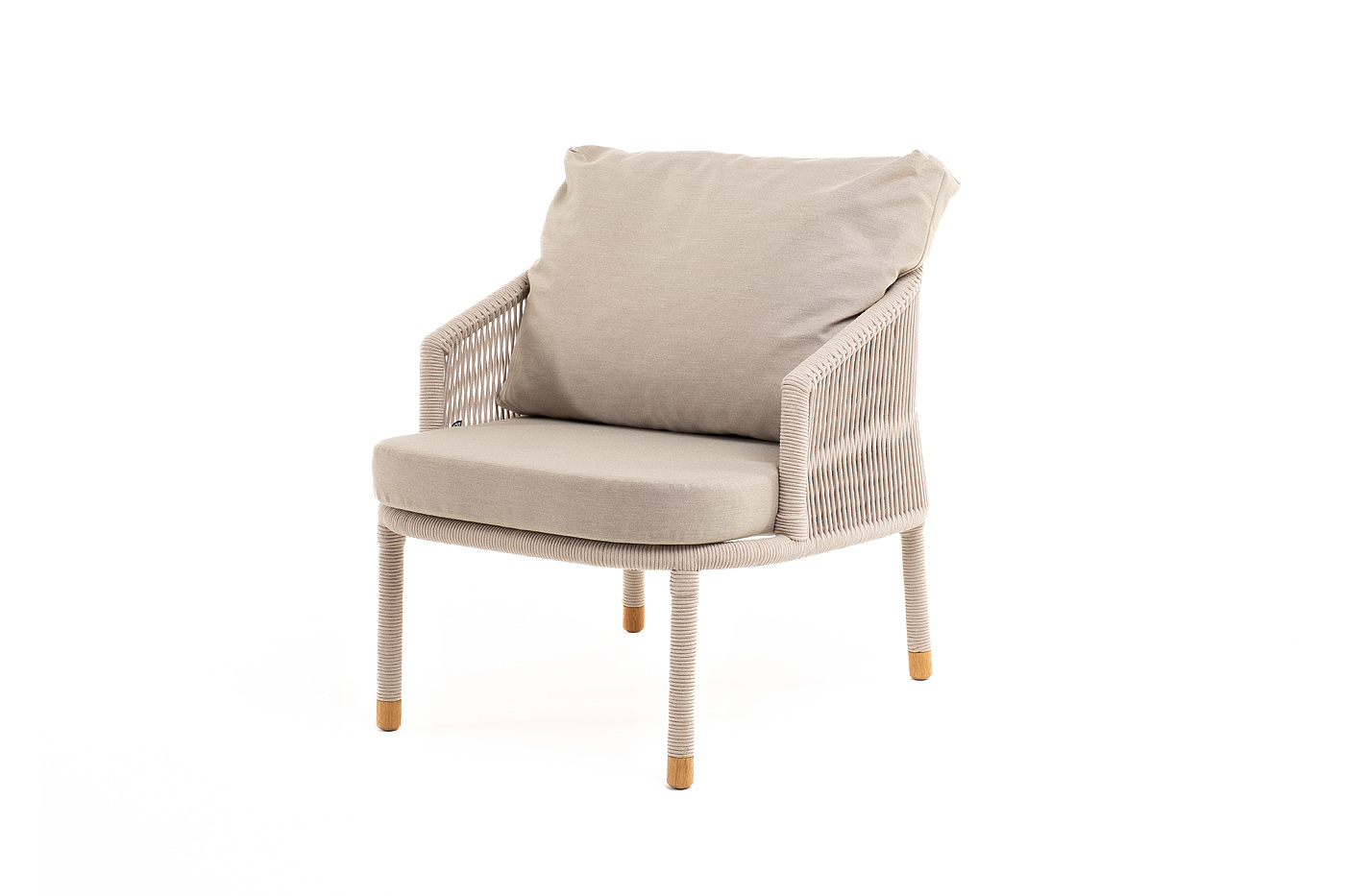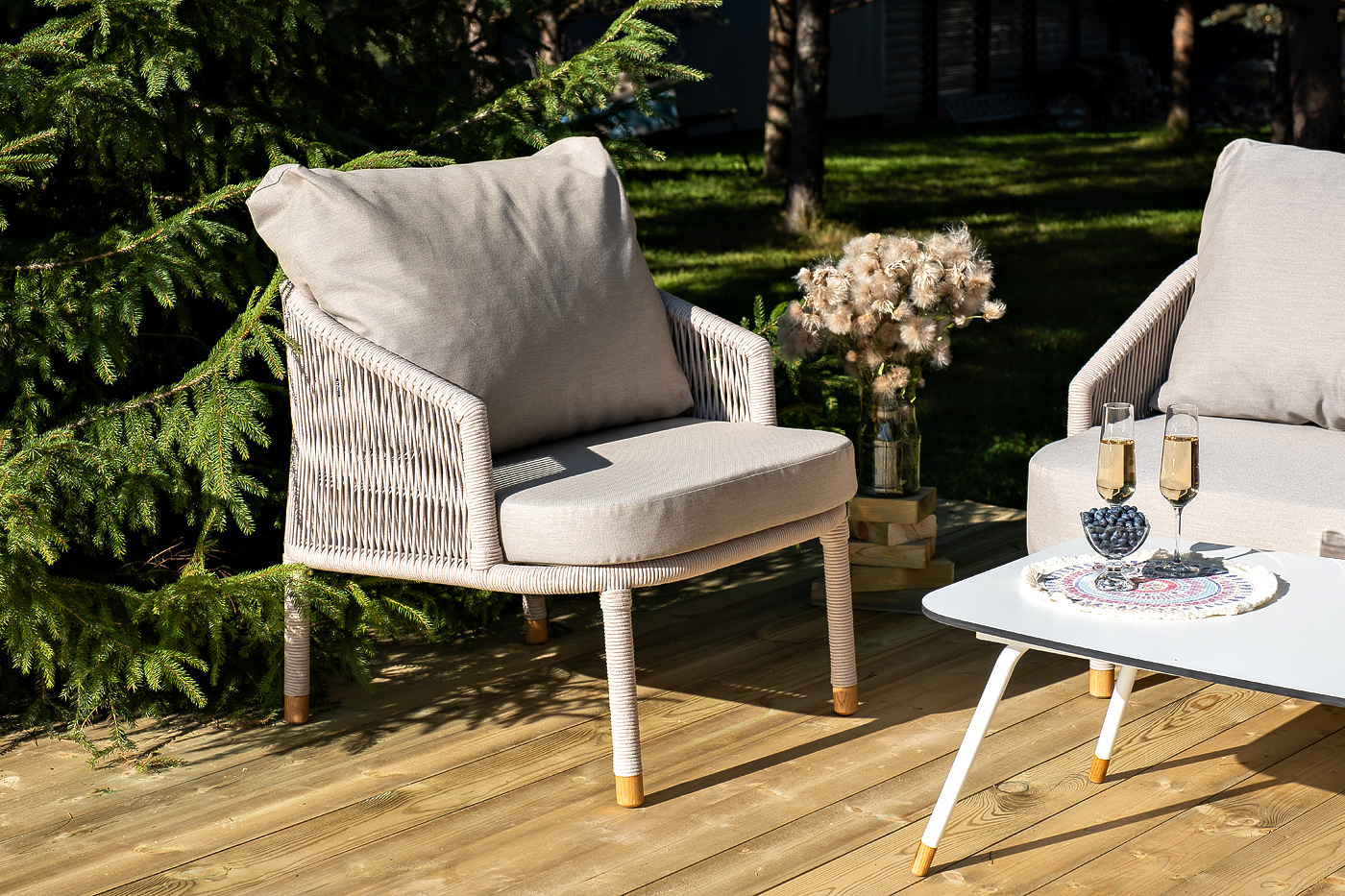 Плетеное кресло «Верона» с подушками в комплекте. Кресло имеет алюминиевый каркас, окрашенный порошковой краской в белый цвет. Боковины каркаса вручную оплетены роупом - эластичными синтетическими лентами, изготовленными из высокопрочных полиэфирных волокон. Цвет оплетки - бежевый. На ножках кресла идут дубовые наконечники (заглушки). Подушки со съёмными чехлами, которые обработаны влагоотталивающей пропиткой. Материал - 100% полиэстер, плотностью 300гр/м2. Размер садового кресла: 760x840х730 мм.
