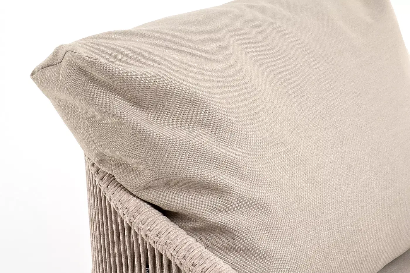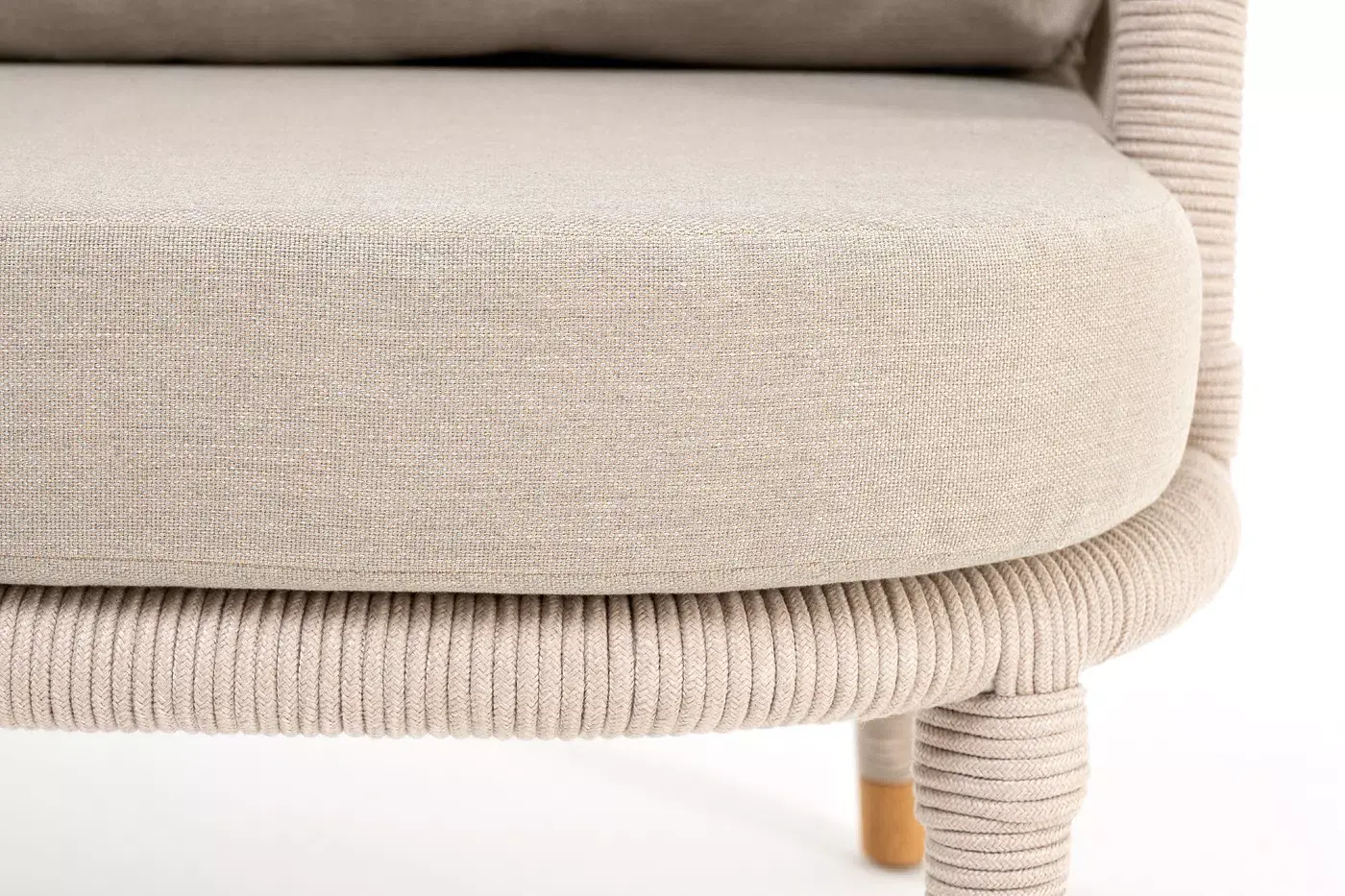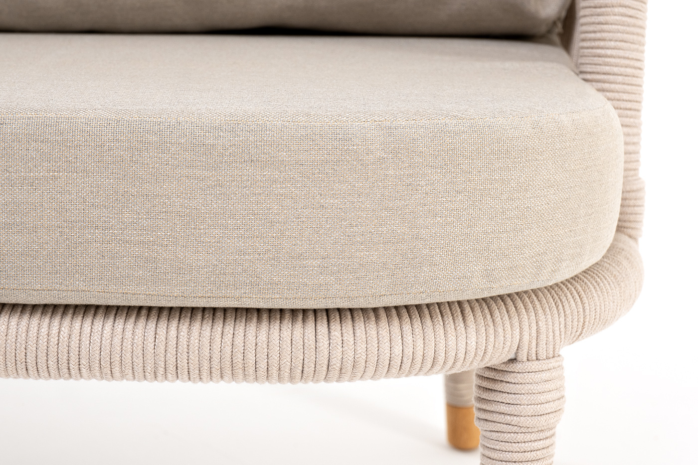 Кресло имеет алюминиевый каркас, окрашенный порошковой краской в белый цвет. Боковины каркаса вручную оплетены роупом - эластичными синтетическими лентами, изготовленными из высокопрочных полиэфирных волокон. Цвет оплетки - бежевый. На ножках кресла идут дубовые наконечники (заглушки).