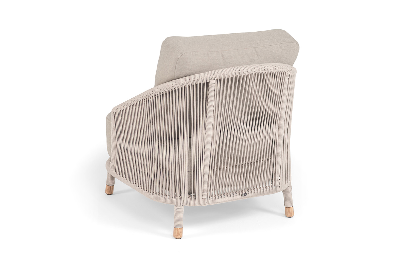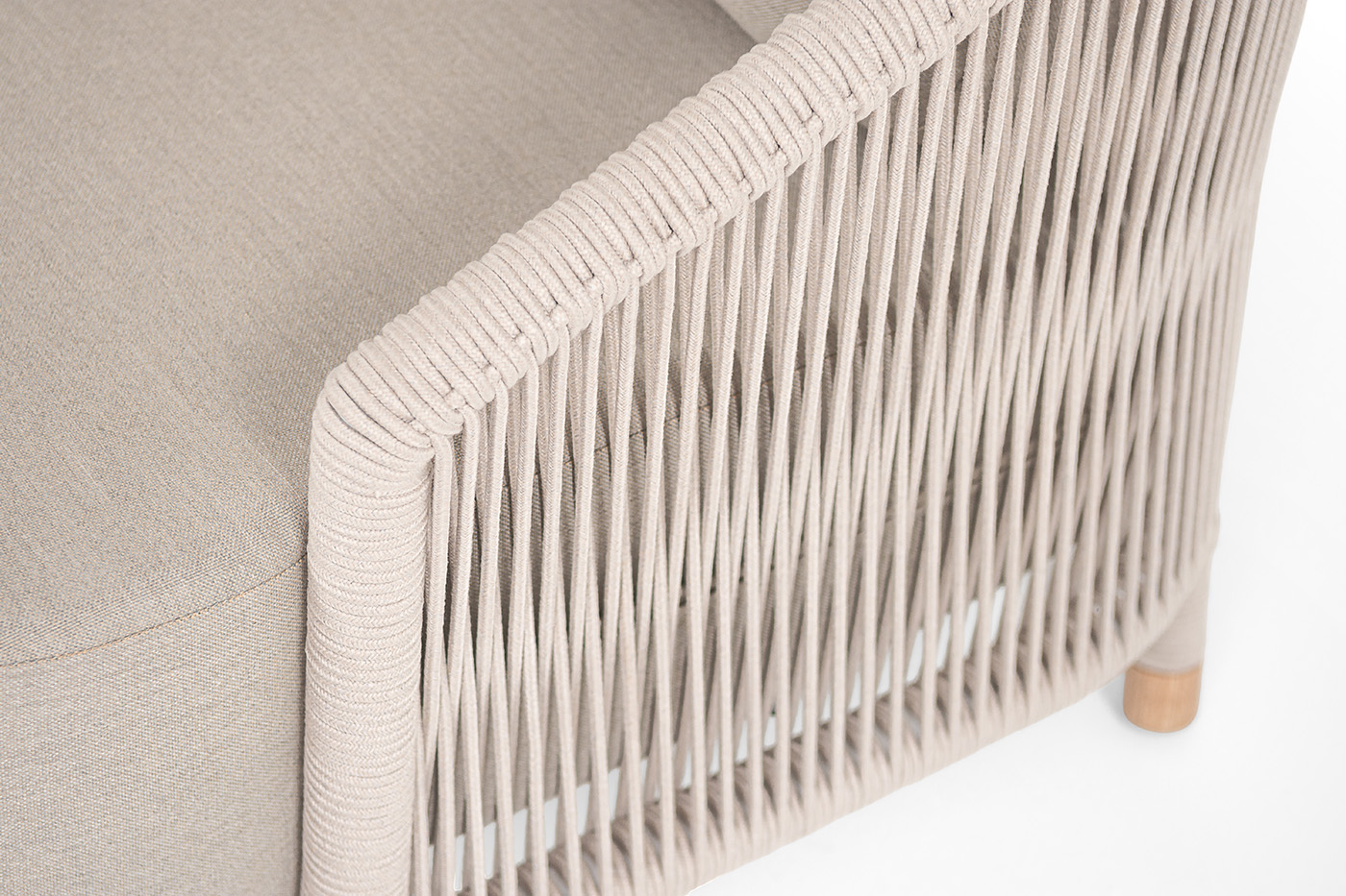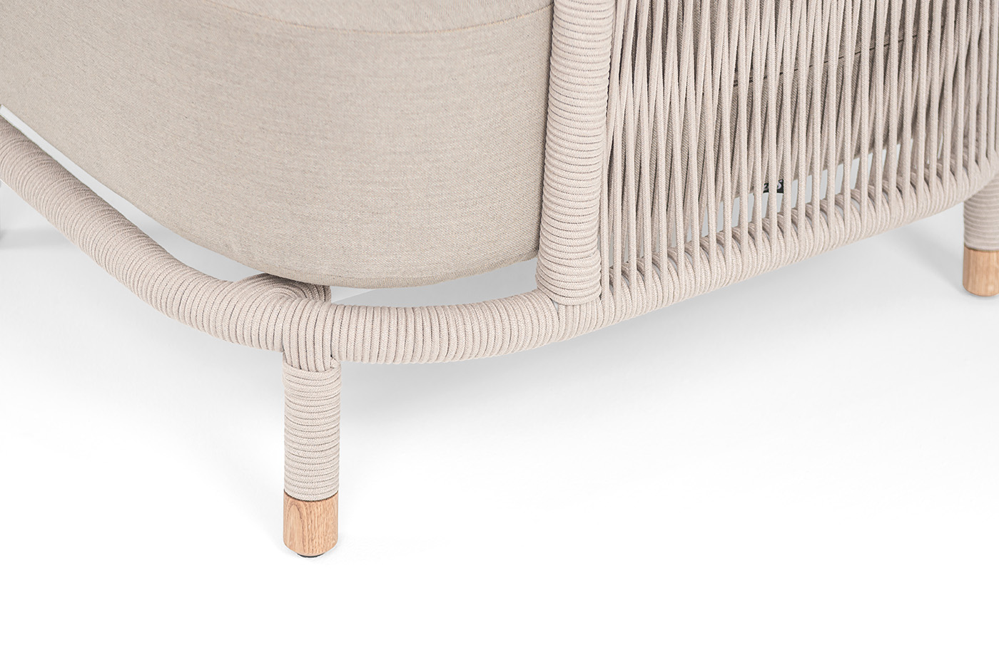 Кресло имеет алюминиевый каркас, окрашенный порошковой краской в белый цвет. Боковины каркаса вручную оплетены роупом - эластичными синтетическими лентами, изготовленными из высокопрочных полиэфирных волокон. Цвет оплетки - бежевый. На ножках кресла идут дубовые наконечники (заглушки).