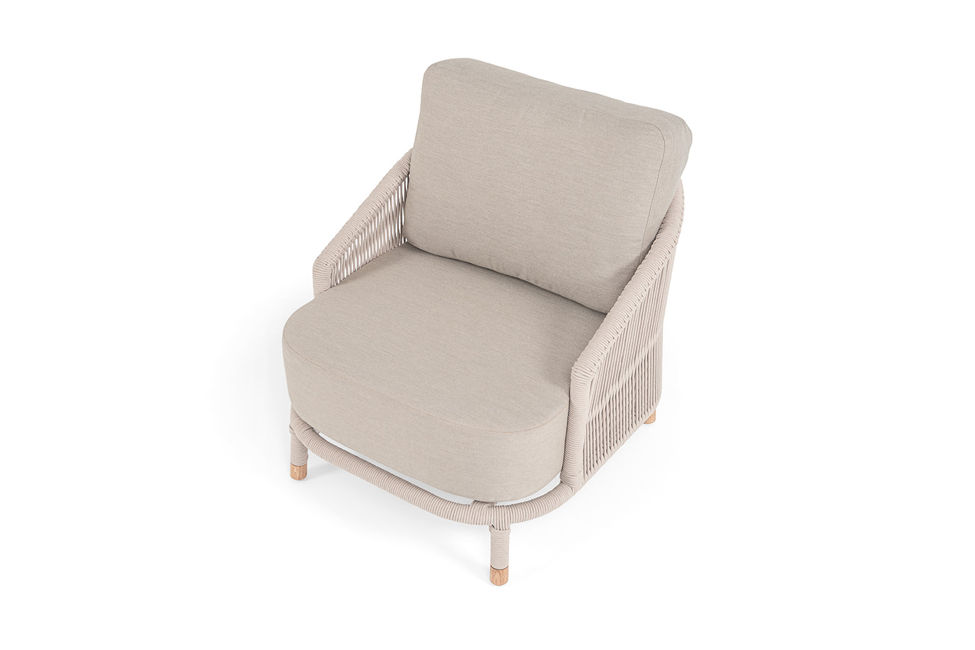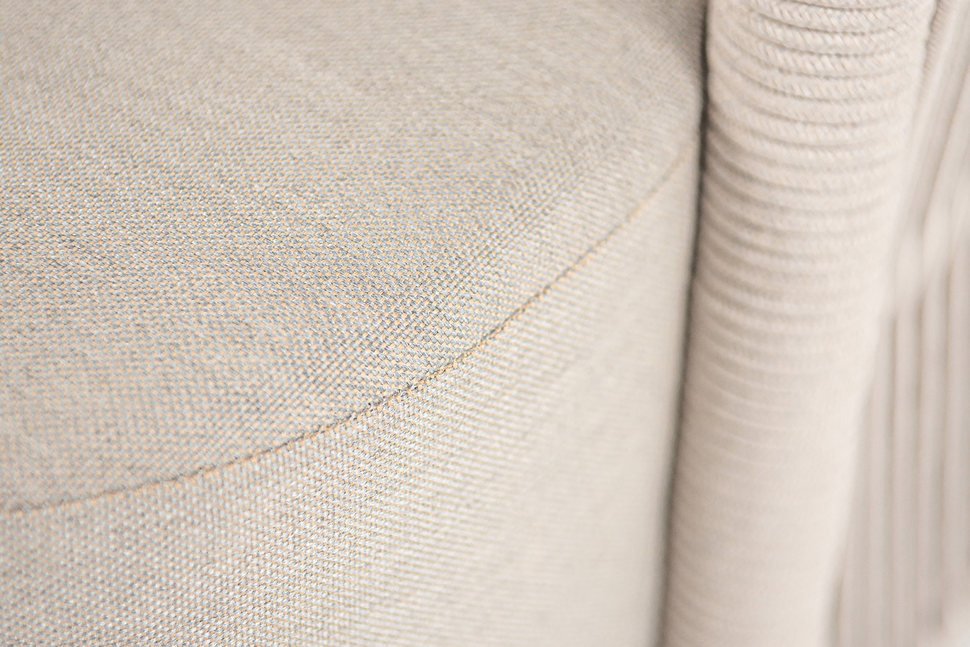 Кресло имеет алюминиевый каркас, окрашенный порошковой краской в белый цвет. Боковины каркаса вручную оплетены роупом - эластичными синтетическими лентами, изготовленными из высокопрочных полиэфирных волокон. Цвет оплетки - бежевый. На ножках кресла идут дубовые наконечники (заглушки).