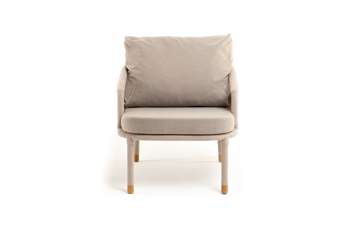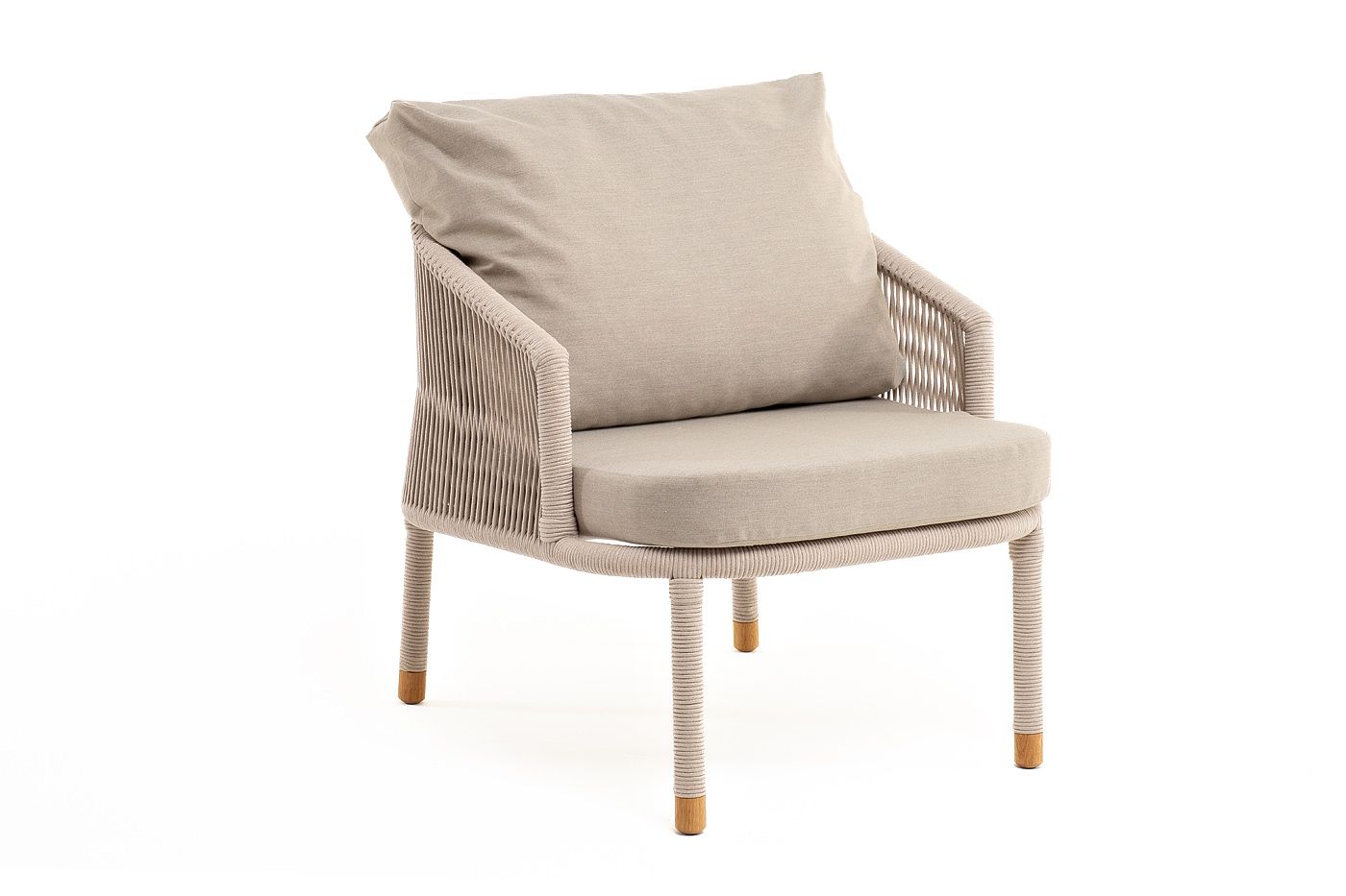 Кресло имеет алюминиевый каркас, окрашенный порошковой краской в белый цвет. Боковины каркаса вручную оплетены роупом - эластичными синтетическими лентами, изготовленными из высокопрочных полиэфирных волокон. Цвет оплетки - бежевый. На ножках кресла идут дубовые наконечники (заглушки).